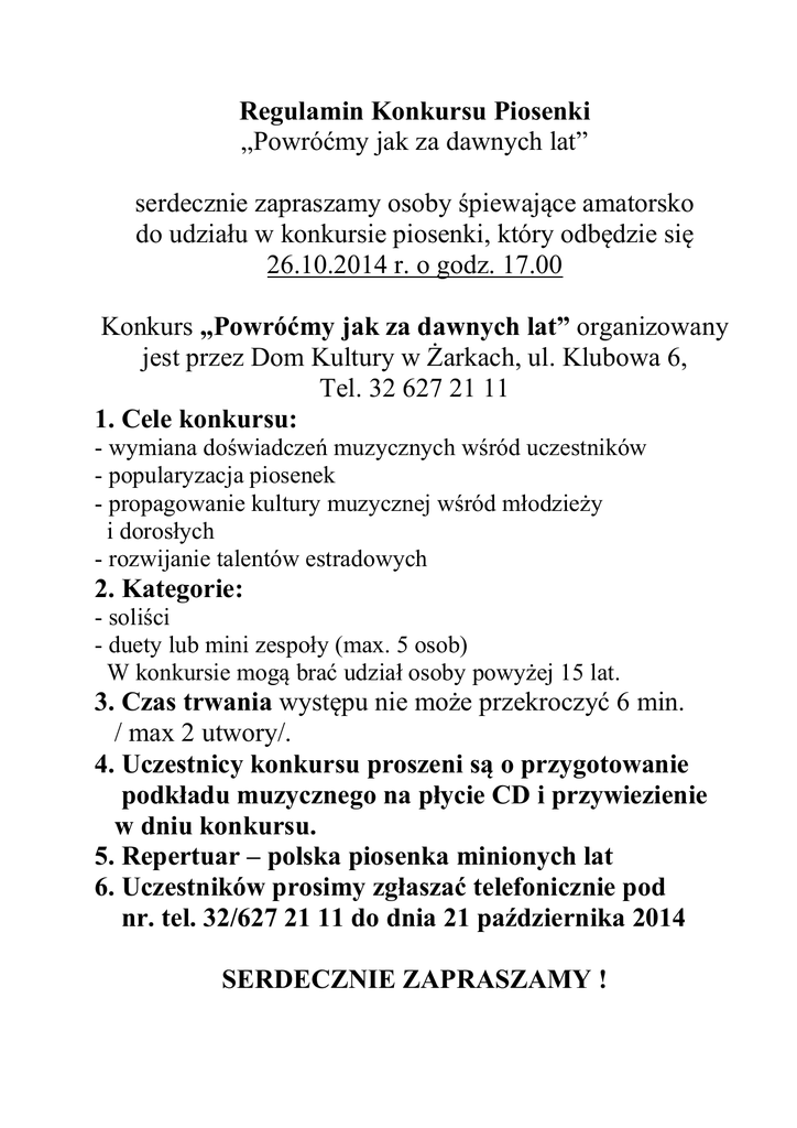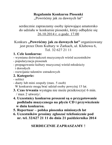 Regulamin Konkursu Piosenki „Powróćmy jak za dawnych lat” serdecznie zapraszamy osoby śpiewające amatorsko do udziału w konkursie piosenki, który odbędzie się 26.10.2014 r. o godz. 17.00 Konkurs „Powróćmy jak za dawnych lat” organizowany jest przez Dom Kultury w Żarkach, ul. Klubowa 6, Tel. 32 627 21 11 1. Cele konkursu: - wymiana doświadczeń muzycznych wśród uczestników - popularyzacja piosenek - propagowanie kultury muzycznej wśród młodzieży i dorosłych - rozwijanie talentów estradowych 2. Kategorie: - soliści - duety lub mini zespoły (max. 5 osob) W konkursie mogą brać udział osoby powyżej 15 lat. 3. Czas trwania występu nie może przekroczyć 6 min. / max 2 utwory/. 4. Uczestnicy konkursu proszeni są o przygotowanie podkładu muzycznego na płycie CD i przywiezienie w dniu konkursu. 5. Repertuar – polska piosenka minionych lat 6. Uczestników prosimy zgłaszać telefonicznie pod nr. tel. 32/627 21 11 do dnia 21 października 2014 SERDECZNIE ZAPRASZAMY !