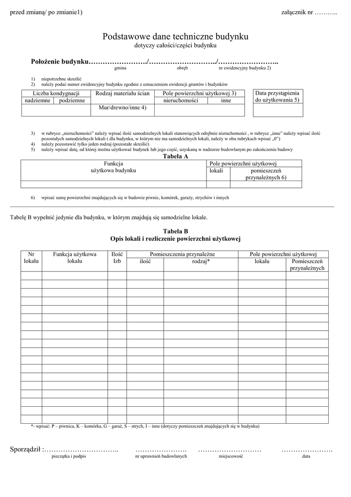 przed zmianą/ po zmianie1) załącznik nr ……….. Podstawowe dane techniczne budynku dotyczy całości/części budynku Położenie budynku……………………./………………………../…………………….. gmina 1) 2) obręb nr ewidencyjny budynku 2) niepotrzebne skreślić należy podać numer ewidencyjny budynku zgodnie z oznaczeniem ewidencji gruntów i budynków Liczba kondygnacji nadziemne podziemne Rodzaj materiału ścian Pole powierzchni użytkowej 3) nieruchomości inne Data przystąpienia do użytkowania 5) Mur/drewno/inne 4) 3) 4) 5) w rubryce „nieruchomości” należy wpisać ilość samodzielnych lokali stanowiących odrębnie nieruchomości , w rubryce „inne” należy wpisać ilość pozostałych samodzielnych lokali ( dla budynku, w którym nie ma samodzielnych lokali, należy w obu rubrykach wpisać „0”) należy pozostawić tylko jeden rodzaj (pozostałe skreślić) należy wpisać datę, od której można użytkować budynek lub jego część, uzyskaną w nadzorze budowlanym po zakończeniu budowy Tabela A Funkcja użytkowa budynku 6) Pole powierzchni użytkowej lokali pomieszczeń przynależnych 6) wpisać sumę powierzchni znajdujących się w budowie piwnic, komórek, garaży, strychów i innych ______________________________________________________________________________________________________________ Tabelę B wypełnić jedynie dla budynku, w którym znajdują się samodzielne lokale. Tabela B Opis lokali i rozliczenie powierzchni użytkowej Nr lokalu Funkcja użytkowa lokalu Ilość Izb Pomieszczenia przynależne ilość rodzaj* Pole powierzchni użytkowej lokalu Pomieszczeń przynależnych *- wpisać: P – piwnica, K – komórka, G – garaż, S – strych, I – inne (dotyczy pomieszczeń znajdujących się w budynku) Sporządził :………………………….. pieczątka i podpis …………………. ……………………… …………………. nr uprawnień budowlanych miejscowość data W zgłoszeniu należy podać: 1. 2. 3. 4. 5. dla osób fizycznych a) nazwisko i imiona oraz imiona rodziców b) adres miejsca pobytu stałego c) informacja, czy osoba fizyczna jest cudzoziemcem w rozumieniu przepisów ustawy z dnia 24 marca 1920 r. o nabywaniu nieruchomości przez cudzoziemców (Dz. U. nr 167 z 2004 r., poz. 1758) dla Skarbu Państwa – nazwa „Skarb Państwa” dla jednostki samorządu terytorialnego i ich związków a) nazwa jednostki lub związki b) siedziba ich organów, dla organów administracji publicznej oraz jednostek organizacyjnych a) nazwa organu lub jednostki organizacyjnej b) siedziba organu lub jednostki organizacyjnej dla osób prawnych nie wymienionych w pkt 2 i 3 a) nazwa osoby prawnej- pełna i skrócona b) siedziba c) informacja, czy osoba prawna jest cudzoziemcem w rozumieniu przepisów ustawy o nabywaniu nieruchomości przez cudzoziemców W przypadku, gdy zgłaszający nie jest zarejestrowany w ewidencji gruntów i budynków jako właściciel bądź wieczysty użytkownik, należy okazać dokument określający jej prawa własności do budynku lub lokalu oraz do gruntu, na którym posadowiony jest budynek ( akt notarialny, wypis z Kw), bądź dokument określający inne prawa niż własność ( decyzja) W przypadku gdy zgłaszający działa w imieniu właściciela, należy okazać upoważnienie. Do sporządzania dokumentu w formularzu EBL-1 niezbędne są uprawnienia budowlane,