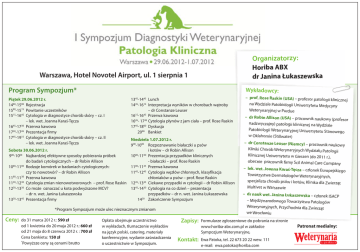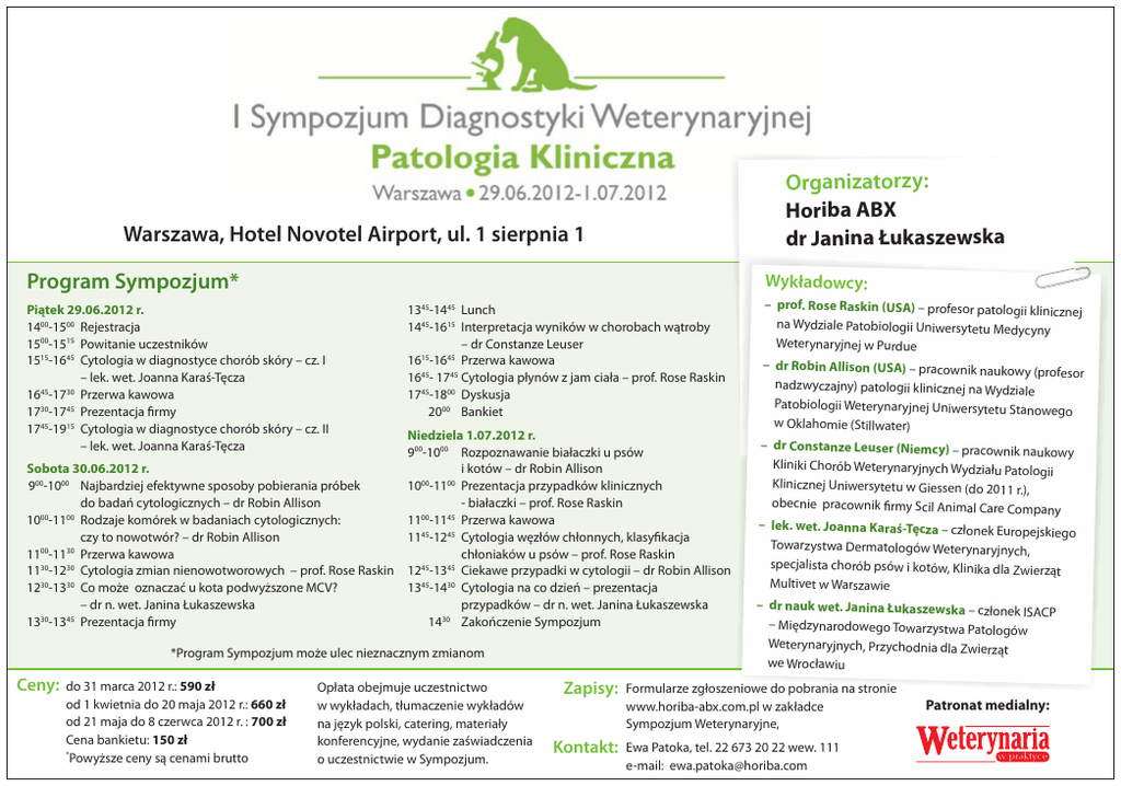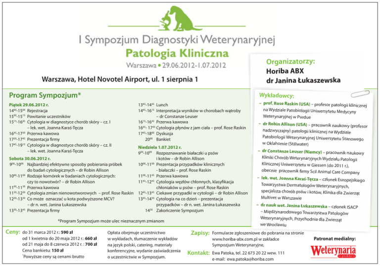 Organizatorzy: Horiba ABX dr Janina Łukaszewska Warszawa, Hotel Novotel Airport, ul. 1 sierpnia 1 Program Sympozjum* Wykładowcy: Piątek 29.06.2012 r. 1400-1500 Rejestracja 1500-1515 Powitanie uczestników 1515-1645 Cytologia w diagnostyce chorób skóry – cz. I – lek. wet. Joanna Karaś-Tęcza 1645-1730 Przerwa kawowa 1730-1745 Prezentacja firmy 1745-1915 Cytologia w diagnostyce chorób skóry – cz. II – lek. wet. Joanna Karaś-Tęcza Sobota 30.06.2012 r. 900-1000 Najbardziej efektywne sposoby pobierania próbek do badań cytologicznych – dr Robin Allison 1000-1100 Rodzaje komórek w badaniach cytologicznych: czy to nowotwór? – dr Robin Allison 1100-1130 Przerwa kawowa 1130-1230 Cytologia zmian nienowotworowych – prof. Rose Raskin 1230-1330 Co może oznaczać u kota podwyższone MCV? – dr n. wet. Janina Łukaszewska 1330-1345 Prezentacja firmy 1345-1445 Lunch 1445-1615 Interpretacja wyników w chorobach wątroby – dr Constanze Leuser 1615-1645 Przerwa kawowa 1645- 1745Cytologia płynów z jam ciała – prof. Rose Raskin 1745-1800 Dyskusja 2000 Bankiet Niedziela 1.07.2012 r. 900-1000 Rozpoznawanie białaczki u psów i kotów – dr Robin Allison 1000-1100 Prezentacja przypadków klinicznych - białaczki – prof. Rose Raskin 1100-1145 Przerwa kawowa 1145-1245 Cytologia węzłów chłonnych, klasyfikacja chłoniaków u psów – prof. Rose Raskin 1245-1345 Ciekawe przypadki w cytologii – dr Robin Allison 1345-1430 Cytologia na co dzień – prezentacja przypadków – dr n. wet. Janina Łukaszewska 1430 Zakończenie Sympozjum *Program Sympozjum może ulec nieznacznym zmianom Ceny: do 31 marca 2012 r.: 590 zł od 1 kwietnia do 20 maja 2012 r.: 660 zł od 21 maja do 8 czerwca 2012 r. : 700 zł Cena bankietu: 150 zł * Powyższe ceny są cenami brutto Opłata obejmuje uczestnictwo w wykładach, tłumaczenie wykładów na język polski, catering, materiały konferencyjne, wydanie zaświadczenia o uczestnictwie w Sympozjum. Zapisy: – prof. Rose Raskin (USA) – profesor patolog ii klinicznej na Wydziale Patobiologii Uniwersytetu Medycy ny Weterynaryjnej w Purdue – dr Robin Allison (USA) – pracownik naukow y (profesor nadzwyczajny) patologii klinicznej na Wydziale Patobiologii Weterynaryjnej Uniwersytetu Stanowe go w Oklahomie (Stillwater) – dr Constanze Leuser (Niemcy) – pracownik naukowy Kliniki Chorób Weterynaryjnych Wydziału Patolog ii Klinicznej Uniwersytetu w Giessen (do 2011 r.), obecnie pracownik firmy Scil Animal Care Compan y – lek. wet. Joanna Karaś-Tęcza – członek Europej skiego Towarzystwa Dermatologów Weterynaryjnych , specjalista chorób psów i kotów, Klinika dla Zwierzą t Multivet w Warszawie – dr nauk wet. Janina Łukaszewska – członek ISACP – Międzynarodowego Towarzystwa Patologów Weterynaryjnych, Przychodnia dla Zwierząt we Wrocławiu Formularze zgłoszeniowe do pobrania na stronie www.horiba-abx.com.pl w zakładce Sympozjum Weterynaryjne, Kontakt: Ewa Patoka, tel. 22 673 20 22 wew. 111 e-mail: [email protected] Patronat medialny: