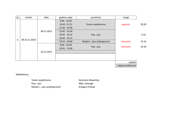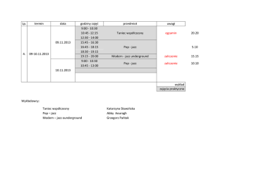 Lp. termin data 09.11.2013 4. 09-10.11.2013 godziny zajęć 9:00 - 10:30 10:45 -12:15 12:30 - 14:00 15:45 - 16:30 16:45 - 18:15 18:30 - 19:15 19:15 - 20:00 9:00 - 10:30 10:45 - 13:00 przedmiot uwagi Taniec współczesny egzamin Pop - jazz 5.10 Modern - jazz underground zaliczenie 15.15 Pop - jazz zaliczenie 10.10 10.11.2013 wykład zajęcia praktyczne Wykładowcy: Taniec współczesny Pop – jazz Modern – jazz ounderground 20.20 Katarzyna Skawińska Abby Aouragh Grzegorz Pańtak