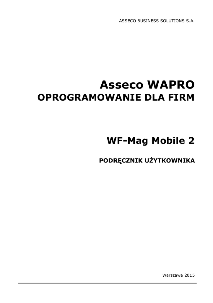 ASSECO BUSINESS SOLUTIONS S.A. Asseco WAPRO OPROGRAMOWANIE DLA FIRM WF-Mag Mobile 2 PODRĘCZNIK UŻYTKOWNIKA Warszawa 2015 Producent zastrzega sobie prawo dokonywania w programie zmian i udoskonaleń nieujętych w niniejszej instrukcji. Informacje dotyczące ostatnich modyfikacji, których ze względu na długość cyklu wydawniczego nie uwzględniono w instrukcji, użytkownik może znaleźć, po zainstalowaniu programów, w pliku „Czytaj to” lub w pomocy programu dostępnej po wciśnięciu klawisza [F1]. Wszelkie prawa zastrzeżone. Żadna część tej pracy nie może być powielana, czy rozpowszechniana w jakiejkolwiek formie i jakikolwiek sposób (elektroniczny, mechaniczny) włącznie z fotokopiowaniem, nagrywaniem na nośniki magnetyczne, optyczne, magneto-optyczne lub przy użyciu innych systemów, bez pisemnej zgody wydawcy. Producent programów i wydawca podręcznika: Asseco Business Solutions SA, Oddział w Warszawie ul. Adama Branickiego 13, 02-972 Warszawa Copyright © 2015 Asseco Business Solutions SA Asseco WAPRO Centrala Dział Sprzedaży Dział Aktywacji Pomoc techniczna (serwis) 22 702 89 00 22 702 89 02 22 702 89 07 22 702 89 89 e-mail: [email protected] www.assecowapro.pl 2 Spis treści: 1. WSTĘP ..................................................................................................7 1.1. 1.2. 1.3. 2. Oprogramowanie Asseco WAPRO......................................................... 7 O programie ..................................................................................... 8 Koncepcja rozwiązania ....................................................................... 9 INSTALACJA I KONFIGURACJA ........................................................... 10 2.1. Instalacja systemu WF-Mag Mobile 2 ................................................. 10 2.2. Konfiguracja systemu WF-Mag Mobile 2 ............................................. 13 2.2.1. Tworzenie bazy danych Konsoli zarządzającej .................................. 14 2.2.2. Konfigurator integracji .................................................................. 14 2.2.3. Konsola zarządzająca ................................................................... 17 2.2.4. Serwer synchronizacji ................................................................... 20 2.3. Instalacja aktualizacji ...................................................................... 26 3. KONSOLA ZARZĄDZAJĄCA WF-MAG MOBILE 2.................................... 27 3.1. Funkcjonalność listy ........................................................................ 31 3.2. Szybkie menu listy .......................................................................... 33 3.3. Filtrowanie listy .............................................................................. 33 3.4. Grupowanie kolumn w liście ............................................................. 34 3.5. Menu Aplikacja ............................................................................... 35 3.5.1. Parametryzacja aplikacji ............................................................... 35 3.5.2. Logi integracji.............................................................................. 39 3.5.3. Logi błędów integracji ................................................................... 40 3.5.4. Ustawienia integracji .................................................................... 41 3.5.5. Instalacja aplikacji mobilnej .......................................................... 42 3.5.6. Wybierz magazyny ....................................................................... 43 3.5.7. Wybierz firmę .............................................................................. 44 3.5.8. Numeracja dokumentów ............................................................... 45 3.5.9. Koniec ........................................................................................ 48 3.6. Kartoteki ........................................................................................ 49 3.6.1. Centralna kartoteka produktów ...................................................... 49 3.6.2. Kategorie produktów .................................................................... 49 3.6.3. Jednostki .................................................................................... 50 3.6.4. Rodzaje produktów ...................................................................... 50 3.6.5. Rodzaje cen ................................................................................ 50 3.6.6. Kartoteki kontrahentów, Kontrahenci .............................................. 51 3.6.7. Klasyfikacje ................................................................................. 59 3.6.8. Grupy cenowe ............................................................................. 60 3.6.9. Formy płatności ........................................................................... 60 3.6.10. Kartoteki magazynowe, Magazyny .............................................. 61 3.6.11. Produkty w magazynie .............................................................. 61 3.6.12. Listingi .................................................................................... 62 3.6.13. Kartoteki związane z pracownikami, Pracownicy............................ 63 3.6.14. Kartoteki związane z pracownikami, Role administracyjne .............. 69 3.6.15. Pozostałe kartoteki.................................................................... 69 3.7. Ankiety .......................................................................................... 70 3.7.1. Uprawnienia do ankiet .................................................................. 70 3.7.2. Przygotowanie ankiety .................................................................. 71 3.7.3. Hierarchia ankiety ........................................................................ 72 3.8. Kontrola PH .................................................................................... 76 