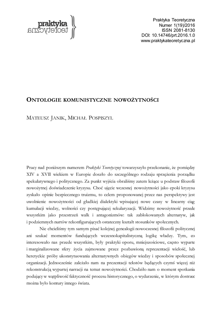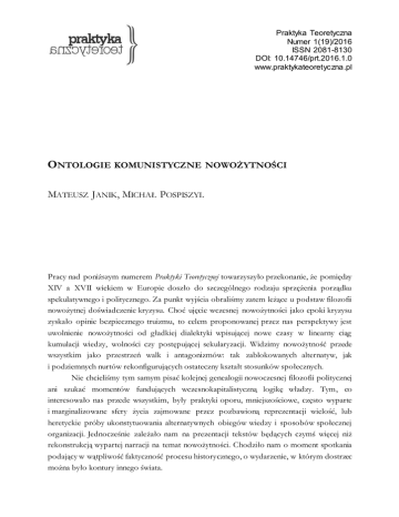Praktyka Teoretyczna Numer 1(19)/2016 ISSN 2081-8130 DOI: 10.14746/prt.2016.1.0 www.praktykateoretyczna.pl ONTOLOGIE KOMUNISTYCZNE NOWOŻYTNOŚCI MATEUSZ JANIK, MICHAŁ POSPISZYL Pracy nad poniższym numerem Praktyki Teoretycznej towarzyszyło przekonanie, że pomiędzy XIV a XVII wiekiem w Europie doszło do szczególnego rodzaju sprzężenia porządku spekulatywnego i politycznego. Za punkt wyjścia obraliśmy zatem leżące u podstaw filozofii nowożytnej doświadczenie kryzysu. Choć ujęcie wczesnej nowożytności jako epoki kryzysu zyskało opinie bezpiecznego truizmu, to celem proponowanej przez nas perspektywy jest uwolnienie nowożytności od gładkiej dialektyki wpisującej nowe czasy w linearny ciąg kumulacji wiedzy, wolności czy postępującej sekularyzacji. Widzimy nowożytność przede wszystkim jako przestrzeń walk i antagonizmów: tak zablokowanych alternatyw, jak i podziemnych nurtów rekonfigurujących ostateczny kształt stosunków społecznych. Nie chcieliśmy tym samym pisać kolejnej genealogii nowoczesnej filozofii politycznej ani szukać momentów fundujących wczesnokapitalistyczną logikę władzy. Tym, co interesowało nas przede wszystkim, były praktyki oporu, mniejszościowe, często wyparte i marginalizowane sfery życia zajmowane przez pozbawioną reprezentacji wielość, lub heretyckie próby ukonstytuowania alternatywnych obiegów wiedzy i sposobów społecznej organizacji. Jednocześnie zależało nam na prezentacji tekstów będących czymś więcej niż rekonstrukcją wypartej narracji na temat nowożytności. Chodziło nam o moment spotkania podający w wątpliwość faktyczność procesu historycznego, o wydarzenie, w którym dostrzec można było kontury innego świata. Mateusz Janik, Michał Pospiszyl: Ontologie komunistyczne … Stąd obok prezentacji perspektywy błaznów i żebraków, chłopek i czarownic proponujemy również reinterpretację myśli tuzów męskiego panteonu nowożytnej filozofii – od Kartezjusza poprzez Hobbesa po Spinozę. Jak pokazują teksty Marty Olesik („Dualizm na skraju załamania nerwowego”) oraz Antonia Negriego (fragment książki Descartes Politico), kartezjanizm może być czytany nie tylko jako dyskurs ustanawiający nowożytny racjonalizm, lecz również jako próba spenetrowania doświadczenia kryzysu, który położył kres humanistycznej rewolucji renesansu. Marta Olesik przekonuje wręcz, że ów kryzys nie tylko nie zostaje przez Kartezjusza przekroczony, ale zagnieżdża się w samym centrum jego myśli stając się spiritus movens jego metody. W podobnym tonie wypowiada się również Negri, przyglądając się z bliska relacji pomiędzy metafizyczną spekulacją a polityczną transformacją, przypieczętowującą w XVII wieku kształt nowej ideologii łączącej interesy tronu i burżuazji. Wychodząc z założenia, że odarty z historycznych okoliczności filozoficzny dyskurs staje się zbiorem pustych pojęć i abstrakcyjnych koncepcji, przedstawiamy je w kontekście wypartych czy zmarginalizowanych sposobów wytwarzania wiedzy. Taka perspektywa umożliwia odkrycie przestrzeni produkcji spekulatywnej nie tylko w jezuickich szkołach, na uniwersytetach czy w gabinetach wczesnokapitalistycznej burżuazji, ale na samym cielesnomaterialnym dole epoki: wśród chłopek, heretyków, czarownic, ludowych libertynów. Jak przekonuje Carlo Ginzburg w eseju o siedemnastowiecznym błaźnie i gorzelniku Costantino Saccardino, ta oddolna produkcja wiedzy nie tylko wyrastała z podobnych doświadczeń co prace Tommaso Campanelli, Galileusza, Bacona czy Kartezjusza, ale rozmachem i oryginalnością koncepcji mogła dorównywać filozoficznym gigantom epoki. Skondensowany w historii Saccardino proces staje się w artykule Marka Woszczka („Eliasz nauk. Apokaliptyka, paracelsjańska mistyka przyrody i narodziny nowoczesności”) przedmiotem panoramicznej analizy narodzin nowoczesnej nauki. Przedstawiona w dwóch obszernych esejach historia nowożytnej mistyki przyrody daje odpór co najmniej kilku obiegowym opiniom na temat relacji między religią, nauką i polityką, rozwoju historycznego czy postępu nauki. Woszczek nie tylko przekonująco ukazuje ścisłą łączność wszystkich tych (później odseparowanych) dziedzin, ale nade wszystko wskazuje na niezwykle produktywny (naukowo, religijnie i politycznie) charakter tej współpracy. W efekcie otrzymujemy obraz powstawania nowożytnej nauki nie tyle uzupełniony (ciągle w powierzchownym, linearnym kluczu) o okultystyczne zainteresowania Keplera czy Newtona, ale wchodzącą w same trzewia epoki opowieść o polityczno-naukowo-teologicznych hybrydach napędzanych pragnieniem odkrycia innej religii, wyzwolonej z katolickich dogmatów nauki czy nowego egalitarnego porządku społecznego. Nic dziwnego, że stojący w centrum tej ontologiczno-politycznej rewolty materializm Paracelsusa spotka się z gwałtowną odpowiedzią zarówno armii związkowych (wypędzających z Salzburga niemieckiego uczonego walczącego u boku chłopskich rewolucjonistów), palących paracelsjańskie pisma luterańskich i katolickich 9 Praktyka Teoretyczna 1(19)/2016 inkwizytorów, jak i cenzurą ogarniętych scholastycznym dogmatyzmem uniwersytetów. Jak pokazuje Woszczek, a także sam Giordano Bruno w przygotowanym przez nas tłumaczeniu Osła kyleńskiego, ta bezwzględna dla uznanych autorytetów nowa ontologia stawiała na głowie uświęconą przez Kościół filozofię: chciała ona bowiem źródło życia i zmiany wiedzieć nie tyle w transcendentnym Bogu, co w samej autonomicznej naturze. Dokonująca się wówczas transformacja nie była podyktowana żadną sekularyzacyjną krucjatą nowożytnych materialistów, lecz stanowiła zasadę nowej teologii, w której centrum znajdzie się kluczowa – dla Bruno i Paracelsusa – interpretacja Inkarnacji. Obaj w radykalnie heterodoksyjnym geście utożsamią bowiem materię pierwszą z wcielającym się Chrystusem. Zgodnie z tym u