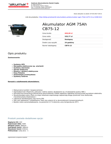 Centrum Akumulatorów Daniel Czajka Ul. Małe Garbary 1 61-756 Poznań, Polska; Poland Nip 7772301082, Regon 634536920 www.prostowniki-akumulatory.pl Dane aktualne na dzień: 07-03-2017 20:11 Link do produktu: http://sklep.prostowniki-akumulatory.pl/akumulator-agm-75ah-cb75-12-p-1448.html Akumulator AGM 75Ah CB75-12 Cena brutto 659,00 zł Cena netto 535,77 zł Dostępność Dostępny Średni czas wysyłki 24 godziny Numer katalogowy CB75-12 Opis produktu Zastosowanie: Systemy UPS Narzędzia elektryczne np. wiertarki Systemy alarmowe Sprzęt medyczny Rowery i skutery elektryczne Kasy fiskalne Automatyka przemysłowa Systemy Solarne Korzyści z użytkowania akumulatora: Maksymalne komfort i bezpieczeństwo Ognioodporność (Pojemnik, pokrywa i osłona zaworu zbudowane są z trudnopalnej żywicy ABS ) Hermetyczna konstrukcja (Konstrukcja akumulatorów YUASA zapewnia całkowitą ochronę przed wyciekiem elektrolitu Wysokowydajne płyty (Płyty ze stopu ołowiowo-wapniowego zapewniają długą żywotność oraz doskonałą charakterystykę eksploatacji ) całkowicie bezobsługowy (wg normy EN) 500 cykli ładowania / rozładowania. Dwa razy więcej niż w akumulatorach konwencjonalnych. Bardzo niskie samorozładowanie, na poziomie 0.1 % dziennie, przy temperaturze 20°C. Produkt posiada dodatkowe opcje: Napięcie [V]: 12V Pojemność [Ah]: 75Ah Długość [mm]: 260mm Szerokość [mm]: 169mm Wysokość [mm]: 210mm Polaryzacja: Lewy plus - 1 wygenerowano w programie shopGold Centrum Akumulatorów Daniel Czajka Ul. Małe Garbary 1 61-756 Poznań, Polska; Poland Nip 7772301082, Regon 634536920 www.prostowniki-akumulatory.pl Końcówki biegunowe: Płaskie Technologia: AGM Dodatkowe informacje: Całkowicie bezobsługowy , Praca Buforowa Gwarancja: 24 miesiące wygenerowano w programie shopGold Powered by TCPDF (www.tcpdf.org)