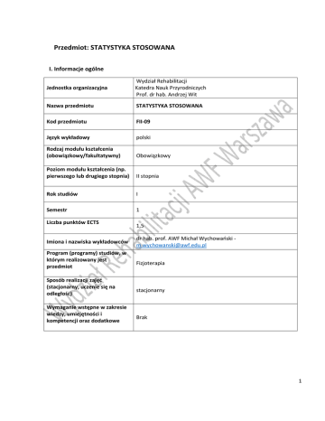Przedmiot: STATYSTYKA STOSOWANA I. Informacje ogólne Jednostka organizacyjna Wydział Rehabilitacji Katedra Nauk Przyrodniczych Prof. dr hab. Andrzej Wit Nazwa przedmiotu STATYSTYKA STOSOWANA Kod przedmiotu FII-09 Język wykładowy polski Rodzaj modułu kształcenia (obowiązkowy/fakultatywny) Obowiązkowy Poziom modułu kształcenia (np. pierwszego lub drugiego stopnia) II stopnia Rok studiów I Semestr 1 Liczba punktów ECTS Imiona i nazwiska wykładowców Program (programy) studiów, w którym realizowany jest przedmiot Sposób realizacji zajęć (stacjonarny, uczenie się na odległość) Wymaganie wstępne w zakresie wiedzy, umiejętności i kompetencji oraz dodatkowe 1,5 dr hab. prof. AWF Michał Wychowański [email protected] Fizjoterapia stacjonarny Brak 1 II. Informacje szczegółowe Cele przedmiotu C1 C4 C5 Zapoznanie studentów z podstawowymi definicjami i pojęciami stosowanymi w statystyce. Opanowanie przez studentów metody wnioskowania statystycznego z wykorzystaniem podstawowych testów analizy statystycznej Zapoznanie studentów z innymi zaawansowanymi metodami statystycznymi. Efekty kształcenia w zakresie wiedzy, umiejętności i kompetencji społecznych: Efekt kształcenia kierunkowy Efekty kształcenia dla przedmiotu Statystyka Stosowana Odniesienie do celów Odniesienie do efektów obszarowych WIEDZA K_W9 K_W10 K_W14 posiada szczegółowa wiedzę z zakresu metrologii C1, C2, C3 diagnostyki funkcjonalnej oraz doboru badań diagnostycznych i funkcjonalnych do oceny stanu pacjenta na potrzeby wykonywania zabiegów z zakresu fizjoterapii i w ramach specjalności zna metody i zasady analizy demograficznej, definiuje C1, C2, C3 podstawowe pojęcia statystyki epidemiologicznej ma wiedzę o procesach zagrażających zdrowiu i problemach niepełnosprawności w ujęciu demograficznym i epidemiologicznym posiada wiedzę na temat metod modelowania C1, C2, C3 naukowego i istniejących dowodów naukowych wykorzystywanych w praktyce oraz zasady kontraktu terapeutycznego M2A_W03, M2A_W07 M2A_W03; M2A_W04 M2A_W05 UMIEJĘTNOŚCI K_U03 K_U12 potrafi dobrać i zaprogramować badania diagnostyczne, wydolnościowe i funkcjonalne dla potrzeb tworzenia, doboru, weryfikacji i modyfikacji odpowiednich zabiegów oraz metod terapeutycznych w programie fizjoterapii dla osób z specjalnymi potrzebami Potrafi posługiwać się wyspecjalizowanymi narzędziami i technikami informatycznymi w celu pozyskiwania danych, a także analizować i krytycznie oceniać te dane oraz wykorzystać podstawy statystyki na potrzeby pracy naukowej C1, C2, C3 M2A_U02, M2A_U05 C1, C2, C3 M2A_U06, M2A_U08 KOMPETENCJE SPOŁECZNE K_K01 K_K09 rozumie potrzebę uczenia się przez całe życie i potrafi inicjować i organizować procesy grupowego uczenia się w zespole potrafi formułować opinie dotyczące różnych aspektów fizjoterapii uwzględniając współpracę z innymi specjalistami i pracę w zespole C1, C2, C3 M2A_K01 C1, C2, C3 M2A_K08 2 Treści programowe Treści programowe Tytuł wykładu Statystyka Stosowana Odniesienie do efektów kształcenia kierunkowy ch/przedmi otowych Odniesienie do celów przedmiotu K_W09 K_W10 K_W14 K_K01 K_W09 K_W10 K_W14 K_K01 K_W09 K_W10 K_W14 K_W09 K_W10 K_W14 K_W09 K_W10 K_W14 K_W09 K_W10 K_W14 K_W09 K_W10 K_W14 K_U03 K_U12 K_K09 K_W09 K_W10 K_W14 K_U03 K_U12 K_K09 K_W09 K_W10 K_W14 K_U03 K_U12 K_W09 K_W10 K_W14 C1, C2 WYKŁADY TP1 1. Podstawowe pojęcia rachunku prawdopodobieństwa. TP2 2. Statystyka, charakterystyka przedmiotu, podstawowe definicje. TP3 3. Rozkład zmiennych mierzalnych, statystyka opisowa. TP4 4. TP5 Dystrybuanta. 5. Rozkład normalny, zmienna unormowana. TP6 6. Kwantyle. TP7 7. Weryfikacja hipotez statystycznych. TP8 8. Współzależność zmiennych mierzalnych. TP9 9. Regresja liniowa. 10. Porównanie średnich, test t-Studenta. TP10 C1, C2 C1, C2 C1, C2 C1, C3 C1, C2 C1, C2 C3 C1, C2 C1, C2 C1, C2 3 TP11 11. Porównanie frakcji test χ2. TP12 12. Analiza wariancji, inne testy statystyczne. TP13 13. Dokładność wnioskowania statystycznego. Określenie liczebności próby. TP14 14. Normy i wartości referencyjne. TP15 15. Badania ankietowe. K_U12 K_K09 K_W09 K_W10 K_W14 K_U03 K_U12 K_K09 K_W09 K_W10 K_W14 K_U03 K_K09 K_W09 K_W10 K_W14 K_U03 K_U12 K_K09 K_W09 K_W10 K_W14 K_U03 K_K09 K_W09 K_W10 K_W14 K_U03 K_U12 K_K09 C1, C2 C1, C2, C3 C1, C2, C3 C2, C3 C51, C2 ĆWICZENIA/ZAJĘCIA PRAKTYCZNE TP16 16. Obliczanie prawdopodobieństwa. K_U03 C1, C2 K_U12 TP17 17. Tworzenie szeregów statystycznych K_U03 C1, C2 K_U12 TP18 18. Obliczanie średniej, odchylenia standardowego. K_U03 C1, C2 K_U12 TP19 19. Obliczanie dystrybuanty i frakcji K_U03 C1, C2 K_U12 TP20 20. Kwantyle, siatka centylowa. K_U03 C1, C2 K_U12 4 TP21 21. Obliczanie statystyki t i t - krytycznego. K_U03 C1, C2 K_U12 TP22 22. Porównywanie średnich, test-t. K_U03 C1, C2 K_U12 K_U12 TP23 23. Badanie istotności współczynnika korelacji. K_U03 C1, C2 TP24 24. Porównywanie średnich test-t. K_U03 C1, C2 TP25 25. K_U03 C1, C2 TP26 26. Analiza danych ankietowych. K_U03 C1, C2 2 Porównywanie frakcji test- χ . Planowane formy/działania/ metody dydaktyczne Treści programowe Metoda dydaktyczna Tp1 - TP15 Wykład informacyjny TP16 - TP26 Ćwiczenia obliczeniowe. Odniesienie do efektów kształcenia kierunkowych/przedmioto wych K_W09, K_W10, K_W14 K_U03, K_U12, K_K01 K_K09 K_U03, K_U12 Środki dydaktyczne: • Komputer • Rzutnik multimedialny • Prezentacje tematyczne • Skrypty dla studentów Efekt kształcenia dla przedmiotu K_W09, K_W10, K_W14 K_U03, K_U12, K_K01 K_K09 K_U03, K_U12 Metody i kryteria oceniania Typy/Metody oceniające D-oceniane Treści programowe (TP) diagnostyczne, F- oceniane formujące, Poceniane podsumowujące* lub wybór z załączonej listy walidacji wyników TP1 do TP15 W - Dwa testy otwarte obejmujące treść wykładów. (P) TP16 do TP26 U - Trzy testy otwarte polegające na rozwiązywaniu zadań demonstrowanych podczas ćwiczeń. (F) 5 Zalecana lista lektur lub lektury ob