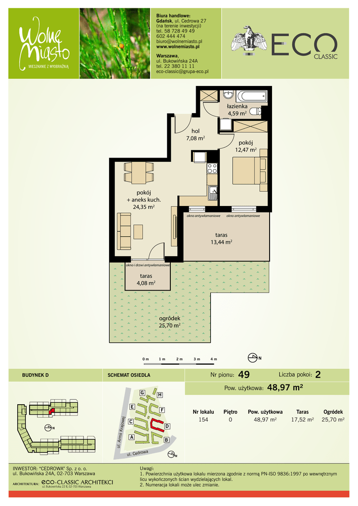 Biura handlowe: Gdańsk, ul. Cedrowa 27 (na terenie inwestycji) tel. 58 728 49 49 602 444 474 [email protected] www.wolnemiasto.pl Warszawa, ul. Bukowińska 24A tel. 22 380 11 11 [email protected] łazienka 4,59 m2 hol 7,08 m2 pokój 12,47 m2 pokój + aneks kuch. 24,35 m2 okno antywłamaniowe okno antywłamaniowe taras 13,44 m2 okno i drzwi antywłamaniowe taras 4,08 m2 ogródek 25,70 m2 0m BUDYNEK D 1m 2m ul. Arm ii Krajo wej E D A 49 Pow. użytkowa: H F C 4m Nr pionu: SCHEMAT OSIEDLA G 3m Nr lokalu 154 Piętro 0 Liczba pokoi: 2 48,97 m² Pow. użytkowa 48,97 m² Taras 17,52 m² Ogródek 25,70 m² B wa ul. Cedro INWESTOR: “CEDROWA” Sp. z o. o. ul. Bukowińska 24A, 02-703 Warszawa Uwagi: 1. Powierzchnia użytkowa lokalu mierzona zgodnie z normą PN-ISO 9836:1997 po wewnętrznym licu wykończonych ścian wydzielających lokal. 2. Numeracja lokali może ulec zmianie.