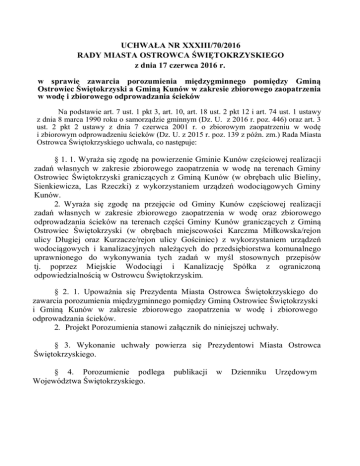 UCHWAŁA NR XXXIII/70/2016 RADY MIASTA OSTROWCA ŚWIĘTOKRZYSKIEGO z dnia 17 czerwca 2016 r. w sprawie zawarcia porozumienia międzygminnego pomiędzy Gminą Ostrowiec Świętokrzyski a Gminą Kunów w zakresie zbiorowego zaopatrzenia w wodę i zbiorowego odprowadzania ścieków Na podstawie art. 7 ust. 1 pkt 3, art. 10, art. 18 ust. 2 pkt 12 i art. 74 ust. 1 ustawy z dnia 8 marca 1990 roku o samorządzie gminnym (Dz. U. z 2016 r. poz. 446) oraz art. 3 ust. 2 pkt 2 ustawy z dnia 7 czerwca 2001 r. o zbiorowym zaopatrzeniu w wodę i zbiorowym odprowadzeniu ścieków (Dz. U. z 2015 r. poz. 139 z późn. zm.) Rada Miasta Ostrowca Świętokrzyskiego uchwala, co następuje: § 1. 1. Wyraża się zgodę na powierzenie Gminie Kunów częściowej realizacji zadań własnych w zakresie zbiorowego zaopatrzenia w wodę na terenach Gminy Ostrowiec Świętokrzyski graniczących z Gminą Kunów (w obrębach ulic Bieliny, Sienkiewicza, Las Rzeczki) z wykorzystaniem urządzeń wodociągowych Gminy Kunów. 2. Wyraża się zgodę na przejęcie od Gminy Kunów częściowej realizacji zadań własnych w zakresie zbiorowego zaopatrzenia w wodę oraz zbiorowego odprowadzania ścieków na terenach części Gminy Kunów graniczących z Gminą Ostrowiec Świętokrzyski (w obrębach miejscowości Karczma Miłkowska/rejon ulicy Długiej oraz Kurzacze/rejon ulicy Gościniec) z wykorzystaniem urządzeń wodociągowych i kanalizacyjnych należących do przedsiębiorstwa komunalnego uprawnionego do wykonywania tych zadań w myśl stosownych przepisów tj. poprzez Miejskie Wodociągi i Kanalizację Spółka z ograniczoną odpowiedzialnością w Ostrowcu Świętokrzyskim. § 2. 1. Upoważnia się Prezydenta Miasta Ostrowca Świętokrzyskiego do zawarcia porozumienia międzygminnego pomiędzy Gminą Ostrowiec Świętokrzyski i Gminą Kunów w zakresie zbiorowego zaopatrzenia w wodę i zbiorowego odprowadzania ścieków. 2. Projekt Porozumienia stanowi załącznik do niniejszej uchwały. § 3. Wykonanie uchwały powierza się Prezydentowi Miasta Ostrowca Świętokrzyskiego. § 4. Porozumienie podlega Województwa Świętokrzyskiego. publikacji w Dzienniku Urzędowym § 5. Traci moc uchwała nr XXVII/10/2016 Rady Miasta Ostrowca Świętokrzyskiego z dnia 28 stycznia 2016 r. w sprawie zawarcia porozumienia międzygminnego pomiędzy Gminą Ostrowiec Świętokrzyski a Gminą Kunów w zakresie zbiorowego zaopatrzenia w wodę i zbiorowego odprowadzania ścieków. § 6. Uchwała wchodzi w życie z dniem podjęcia. Przewodnicząca Rady Miasta Ostrowca Świętokrzyskiego Irena Renduda – Dudek 2 Załącznik do Uchwały Nr XXXIII/70/2016 Rady Miasta Ostrowca Świętokrzyskiego z dnia 17 czerwca 2016 r. w sprawie zawarcia porozumienia międzygminnego pomiędzy Gminą Kunów i Gminą Ostrowiec Świętokrzyski w zakresie zbiorowego zaopatrzenia w wodę i zbiorowego odprowadzania ścieków POROZUMIENIE MIĘDZYGMINNE zawarte dnia ………………………….… 2016 r. pomiędzy: Gminą Kunów w imieniu której działa Burmistrz Miasta i Gminy Lech Łodej zwaną w dalszej części Porozumienia "Gminą Kunów" a Gminą Ostrowiec Świętokrzyski, w imieniu której działa Prezydent Miasta Jarosław Górczyński zwaną w dalszej części Porozumienia "Gminą Ostrowiec Świętokrzyski" Na podstawie: 1. art. 7 ust. l pkt 3, art. 10, art. 18 ust. 2 pkt 12 i art. 74 ustawy z dnia 8 marca 1990 roku o samorządzie gminnym (Dz. U. z 2016 r. poz. 446), 2. art. 3 ust. 2 pkt 2 ustawy z dnia 7 czerwca 2001 r. o zbiorowym zaopatrzeniu w wodę i zbiorowym odprowadzeniu ścieków (Dz. U. z 2015 r. poz. 139 z późn. zm.), 3. Uchwały Nr XXVI/158/2016 z dnia 28 kwietnia 2016 r. Rady Miasta i Gminy Kunów w sprawie zawarcia porozumienia międzygminnego pomiędzy Gminą Kunów i Gminą Ostrowiec Świętokrzyski w zakresie zbiorowego zaopatrzenia w wodę i zbiorowego odprowadzania ścieków, 4. Uchwały Nr XXXIII/70/2016 z dnia 17 czerwca 2016 r. Rady Miasta Ostrowca Świętokrzyskiego w sprawie zawarcia porozumienia międzygminnego pomiędzy Gminą Ostrowiec Świętokrzyski a Gminą Kunów w zakresie zbiorowego zaopatrzenia w wodę i zbiorowego odprowadzania ścieków porozumiewające się Strony ustalają, co następuje: 3 §1 1. Gmina Ostrowiec Świętokrzyski powierza a Gmina Kunów przejmuje, z zastrzeżeniem ust. 5, obowiązek częściowego prowadzenia zadań własnych Gminy Ostrowiec Świętokrzyski z zakresu zbiorowego zaopatrzenia w wodę w niżej wymienionych częściach miasta Ostrowiec Świętokrzyski: 1) ulica Bieliny – część oznaczona na załączniku graficznym nr 1 do niniejszego Porozumienia kolorem niebieskim, 2) ulica Sienkiewicza – część oznaczona na załączniku graficznym nr 2 do niniejszego Porozumienia kolorem niebieskim, 3) ulica Las Rzeczki – część oznaczona na załączniku graficznym nr 3 do niniejszego Porozumienia kolorem niebieskim. 2. Gmina Kunów powierza, a Gmina Ostrowiec Świętokrzyski przejmuje, z zastrzeżeniem ust. 5, obowiązek częściowego prowadzenia zadań własnych Gminy Kunów z zakresu zbiorowego zaopatrzenia w wodę: 1) w części miejscowości Kurzacze / rejon ulicy Gościniec oznaczonej na załączniku graficznym nr 4 do niniejszego Porozumienia kolorem niebieskim, 2) w części miejscowości Karczma Miłkowska / rejon ulicy Długiej oznaczonej na załączniku graficznym nr 5 do niniejszego Porozumienia kolorem niebieskim. 3. Gmina Kunów powierza, a Gmina Ostrowiec Świętokrzyski przejmuje, z zastrzeżeniem ust. 5, obowiązek częściowego prowadzenia zadań własnych Gminy Kunów z zakresu zbiorowego odprowadzania ścieków w części miejscowości Karczma Miłkowska / rejon ulicy Długiej oznaczonej na załączniku graficznym nr 6 do niniejszego Porozumienia kolorem brązowym. 4. Zadania o których mowa w ust. 1, 2 i ust. 3 polegające na realizacji obowiązków i praw określonych w ustawie z dnia 7 czerwca 2001 r. o zbiorowym zaopatrzeniu w wodę i zbiorowym odprowadzaniu ścieków (Dz