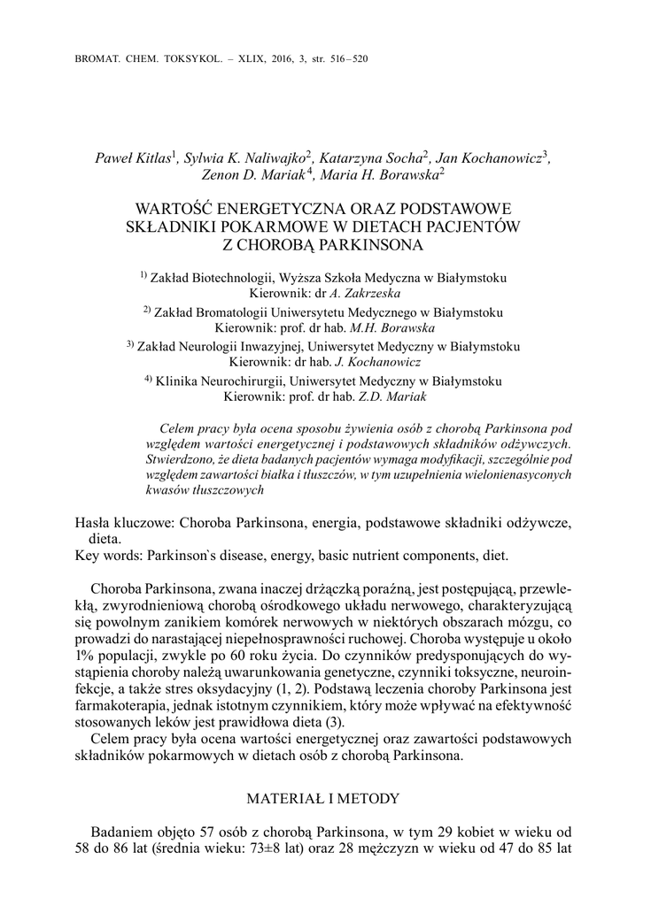 BROMAT. CHEM. TOKSYKOL. – XLIX, 2016, 3, str. 516 – 520 Paweł Kitlas1, Sylwia K. Naliwajko2 , Katarzyna Socha2 , Jan Kochanowicz3, Zenon D. Mariak 4, Maria H. Borawska2 WARTOŚĆ ENERGETYCZNA ORAZ PODSTAWOWE SKŁADNIKI POKARMOWE W DIETACH PACJENTÓW Z CHOROBĄ PARKINSONA 1) Zakład Biotechnologii, Wyższa Szkoła Medyczna w Białymstoku Kierownik: dr A. Zakrzeska 2) Zakład Bromatologii Uniwersytetu Medycznego w Białymstoku Kierownik: prof. dr hab. M.H. Borawska 3) Zakład Neurologii Inwazyjnej, Uniwersytet Medyczny w Białymstoku Kierownik: dr hab. J. Kochanowicz 4) Klinika Neurochirurgii, Uniwersytet Medyczny w Białymstoku Kierownik: prof. dr hab. Z.D. Mariak Celem pracy była ocena sposobu żywienia osób z chorobą Parkinsona pod względem wartości energetycznej i podstawowych składników odżywczych. Stwierdzono, że dieta badanych pacjentów wymaga modyfikacji, szczególnie pod względem zawartości białka i tłuszczów, w tym uzupełnienia wielonienasyconych kwasów tłuszczowych Hasła kluczowe: Choroba Parkinsona, energia, podstawowe składniki odżywcze, dieta. Key words: Parkinson`s disease, energy, basic nutrient components, diet. Choroba Parkinsona, zwana inaczej drżączką poraźną, jest postępującą, przewlekłą, zwyrodnieniową chorobą ośrodkowego układu nerwowego, charakteryzującą się powolnym zanikiem komórek nerwowych w niektórych obszarach mózgu, co prowadzi do narastającej niepełnosprawności ruchowej. Choroba występuje u około 1% populacji, zwykle po 60 roku życia. Do czynników predysponujących do wystąpienia choroby należą uwarunkowania genetyczne, czynniki toksyczne, neuroinfekcje, a także stres oksydacyjny (1, 2). Podstawą leczenia choroby Parkinsona jest farmakoterapia, jednak istotnym czynnikiem, który może wpływać na efektywność stosowanych leków jest prawidłowa dieta (3). Celem pracy była ocena wartości energetycznej oraz zawartości podstawowych składników pokarmowych w dietach osób z chorobą Parkinsona. MATERIAŁ I METODY Badaniem objęto 57 osób z chorobą Parkinsona, w tym 29 kobiet w wieku od 58 do 86 lat (średnia wieku: 73±8 lat) oraz 28 mężczyzn w wieku od 47 do 85 lat Nr 3 Składniki pokarmowe w dietach pacjentów z chorobą Parkinsona 517 (70±11 lat), będących pod opieką Poradni Neurologicznej „Kendron” w Białymstoku. W oparciu o dokonane pomiary antropometryczne obliczono wskaźnik masy ciała BMI (średnia BMI: 26,06±3,97 kg/m2). Na przeprowadzenie badań uzyskano zgodę Komisji Bioetycznej Uniwersytetu Medycznego w Białymstoku (R-I-002/337/2012) i badanych pacjentów. Z badanymi osobami przeprowadzono 24-godzinne wywiady żywieniowe, zebrane przy pomocy Albumu Fotografii Produktów i Potraw (4). Zebrane wywiady poddano analizie przy użyciu programu komputerowego Dieta 5.0 (IŻŻ) w oparciu o „Tabele składu i wartości odżywczej” (5). Obliczono wartość energetyczną i średnią zawartość podstawowych składników odżywczych oraz procentowy udział energii pochodzącej z białek, tłuszczów i węglowodanów w dietach. Otrzymane wartości porównano do obowiązujących norm średniego spożycia grupy (EAR) lub wystarczającego spożycia (AI) (6) i obliczono odsetek osób o wystarczającym i niedostatecznym spożyciu badanych składników. Do obliczeń wykorzystano program Microsoft Excel. WYNIKI I ICH OMÓWIENIE Prawidłowy wskaźnik masy ciała stwierdzono u 54,2% kobiet i 43,5% mężczyzn; nadwagę u 37,5% kobiet i 26,1% mężczyzn, natomiast otyłość u 8,3% kobiet i 30,4% mężczyzn. Według danych literaturowych zbyt duża masa ciała występuje najczęściej u pacjentów chorujących krócej – do 10 lat. Jednak postęp choroby może powodować trudności z pobieraniem pokarmów, prowadzące nawet do niedowagi (7). Stwierdzono niższą średnią energetyczność badanych jadłospisów w porównaniu do norm (tab. I). Procentowy udział białka w energetyczności diety oraz średnie spożycie białka ogółem były wyższe w stosunku do zaleceń i około 2/3 białka stanowiło białko pochodzenia zwierzęcego. Mimo to u 17,4% mężczyzn i 25% kobiet obserwowano niedostateczne spożycie białka (tab. II). Podobne średnie spożycie białka w diecie pacjentów z chorobą Parkinsona stwierdzili inni autorzy (8). Badania wykazały zależność działania lewodopy, stosowanej w leczeniu choroby Parkinsona, od całkowitej ilości białka w diecie oraz jego zawartości w poszczególnych posiłkach. Zaleca się, aby produkty bogate w białko znalazły się w każdym posiłku, w niewielkiej ilości z ograniczeniem białka zwierzęcego, które może zaburzać wchłanianie leku (9, 10). Przyjmowanie lewodopy przyczynia się do podwyższenia komórkowej syntezy homocysteiny, co sprzyja rozwojowi miażdżycy naczyń krwionośnych i chorobie niedokrwiennej serca. Jednak zbyt niska podaż białka pełnowartościowego może skutkować ujemnym bilansem azotowym i problemami z utrzymaniem masy mięśniowej u pacjentów z chorobą Parkinsona (8, 9). Udział tłuszczów w energetyczności diety wynosił 24,7±8,1%, jednak średnie pobranie tłuszczów ogółem było niższe w stosunku do normy EAR (tab. I). Obserwowano ponadto niedostateczne spożycie tłuszczów ogółem u 62,5% kobiet i 87,0% mężczyzn. Średnie pobranie wszystkich wielonienasyconych kwasów tłuszczowych (WNKT) było znacznie niższe niż normy AI (tab. I), ponadto wystarczające spożycie poszczególnych kwasów tłuszczowych dotyczyło niewielkiego odsetka kobiet, natomiast żaden z badanych mężczyzn nie spożył wystarczającej ilości kwasu linolowego (LA) oraz sumy kwasów EPA+DHA. Od- 518 Nr 3 P. Kitlas i współpr. powiednia podaż WNKT w chorobie Parkinsona jest istotna, gdyż poprzez efekt antyoksydacyjny i hamowanie apoptozy neuronów, wykazują one właściwości przeciwzapalne i neuroprotekcyjne (11, 12). Wykazano, że niedobór WNKT n-3 powoduje zaburzenia szlaku dopamino-mezokortykolimbicznego, co ma