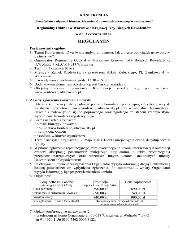 KONFERENCJA „Dwa światy audytora i biznesu. Jak zmienić obowiązek ustawowy w partnerstwo” Regionalny Oddział w Warszawie Krajowej Izby Biegłych Rewidentów w dn. 3 czerwca 2016r. REGULAMIN I. Postanowienia ogólne: 1. Temat Konferencji: „Dwa światy audytora i biznesu. Jak zmienić obowiązek ustawowy w partnerstwo”. 2. Organizator: Regionalny Oddział w Warszawie Krajowej Izby Biegłych Rewidentów, ul.Wolność 7 lok.C, 01-018 Warszawa. 3. Termin - 3 czerwca 2016 r. 4. Miejsce - Zamek Królewski, na przestrzeni Arkad Kubickiego, Pl. Zamkowy 4 w Warszawie. 5. Przewidywany czas trwania: godz. 13:30 – 24:00. 6. Dodatkowym elementem Konferencji jest bankiet zasiadany. 7. Oficjalny serwis internetowy Konferencji znajduje się pod adresem www.konferencjadwaswiaty.pl II. Zasady zgłoszenia i odwołania udziału: 1. Udział w konferencji należy zgłaszać poprzez formularz rejestracyjny, który dostępny jest na stronie internetowej www.konferencjadwaswiaty.pl oraz w siedzibie Organizatora. Uczestnik zobowiązuje się do poprawnego oraz zgodnego ze stanem rzeczywistym wypełnienia formularza rejestracyjnego. 2. Forma nadsyłania zgłoszeń: ▪ e-mail: [email protected] ▪ on-line www.konferencjadwaswiaty.pl ▪ fax – 22-862-54-90 ▪ osobiście w biurze Organizatora. 3. Termin nadsyłania zgłoszeń – 31 maja 2016 r. Liczba miejsc ograniczona, decyduje termin zapłaty. 4. Wysłanie zgłoszenia rejestracyjnego, zamieszczonego na stronie internetowej Konferencji oznacza akceptację postanowień niniejszego Regulaminu, a także przestrzegania przepisów porządkowych oraz wszelkich innych ustaleń, dokonanych między Uczestnikiem a Organizatorem. 5. Po otrzymaniu formularza zgłoszenia Organizator wysyła informację drogą elektroniczną będącą potwierdzeniem wpłynięcia zgłoszenia. Po odnotowaniu wpłaty Organizator wysyła informację, będącą potwierdzeniem udziału. 6. Odpłatność: Ceny netto za 1 osobę Promocja (nie uwzględnia VAT 23%) Wpłata do dn. 20 maja 2016r. Biegli rewidenci Członkowie Konfederacji Lewiatan Pozostałe osoby Przy zgłoszeniu 10 osób (cały stolik) 590,00 zł 690,00 zł 840,00 zł Cena zaproszenia 690,00 zł 740,00 zł 990,00 zł Dodatkowy rabat w wysokości 600 zł (od sumy odpowiednich kwot w tabeli) 7. Opłaty konferencyjne należy wnosić: - przelewem na konto Organizatora, 01-018 Warszawa, ul.Wolność 7 lok.C nr 91 1020 1156 0000 7402 0006 8122, 1 - gotówką w kasie biura Organizatora. 8. Wniesiona opłata uprawnia do wejścia na Konferencję. 9. Odwołanie zgłoszenia wymaga zachowania formy pisemnej. 10. W przypadku rezygnacji Uczestnika do dn. 20 maja 2016 r. Organizator zwraca wpłaconą kwotę. W przypadku rezygnacji po tej dacie, wpłacona kwota nie ulega zwrotowi. 11. W przypadku stwierdzenia uczestnictwa w konferencji osoby niezgłoszonej zgodnie z przedstawionymi zasadami (poprzez formularz rejestracyjny), Organizator obciąży takiego uczestnika opłatą konferencyjną. 12. W przypadku, gdy Konferencja nie odbędzie się z przyczyn niezależnych od Organizatora, tzw. „siła wyższa” (np. huragan, powódź, śnieżyca), Uczestnikowi nie przysługuje prawo do odszkodowania lub do zwrotu jakichkolwiek opłat, związanych z uczestnictwem w Konferencji, a także kosztów usług dodatkowych, zleconych Organizatorowi przez Uczestników Konferencji. 13. W przypadku, gdy Konferencja nie odbędzie się z przyczyn zależnych wyłącznie od Organizatora, Organizator niezwłocznie zwróci kwoty wpłacone przez Uczestników na wskazane przez nich konta bankowe. 14. Koszty przejazdu i zakwaterowania nie są objęte opłatami konferencyjnymi i każdy uczestnik pokrywa je we własnym zakresie. 15. Faktura pro-forma wystawiona zostanie na życzenie uczestnika. 16. O sposobie przekazania faktury VAT Uczestnik poinformuje Organizatora. III. Postanowienia końcowe: 1. Biegłym rewidentom zostanie wystawione zaświadczenie, które uprawniać może do zaliczenia części merytorycznej Konferencji jako formę samokształcenia w ramach obligatoryjnego doskonalenia zawodowego biegłych rewidentów. 2. Organizator nie ponosi odpowiedzialności za rzeczy Uczestników, które mogą zostać zgubione, zniszczone lub skradzione podczas Konferencji. 3. Uczestnicy ponoszą pełną odpowiedzialność materialną za dokonane przez siebie zniszczenia, zarówno na terenie obiektów, w których prowadzone są działania związane z Konferencją, jak również w miejscach zakwaterowania. 4. Wszelkie reklamacje Uczestników wobec Organizatora powinny być zgłaszane nie później niż w terminie 3 dni od dnia zakończenia Konferencji w formie pisemnej listem poleconym za potwierdzeniem odbioru na adres siedziba Organizatora. Reklamacje zgłoszone po tym terminie nie będą rozpatrywane. 5. Konferencja ma charakter zamknięty i nie stanowi imprezy masowej w rozumieniu Ustawy z dnia 23 marca 2009 roku o bezpieczeństwie imprez masowych (Dz. U. 2009 nr 62, poz.504). 6. W Zamku Królewskim wyklucza się fotografowanie i filmowanie dla celów reklamowych, palenie tytoniu, promowanie wyrobów tytoniowych oraz alkoholowych. 7. Zamek Królewski informuje o trudnościach w komunikacji samochodowej i braku przyzamkowego parkingu oraz, że nie gwarantuje bezpośredniego dojazdu do Zamku ani przepustek na wjazd na teren Starego Miasta. 8. Niniejszy Regulamin wchodzi w życie z dniem jego zamieszczenia na stronie internetowej Konferencji www.konferencjadwaswiaty.pl 9. Organizator ma prawo zmiany postanowień Regulaminu. Zmiany wchodzą w życie w terminie 7 dni od dnia ich zamieszczenia na stronie internetowej Konferencji. 10. Przepisy niniejszego Regulaminu stanowią integralną cześć zgłoszenia uczestnictwa i obowiązują wszystkich Uczestników. 11. Wszelkie spory, mogące wynikać z tytułu uczestnictwa w Konferencji będą rozstrzygane przez sąd właściwy dla siedziby Organizatora. 12. W sprawach nieuregulowanych niniejszym Regulaminem, zastosowanie mają p