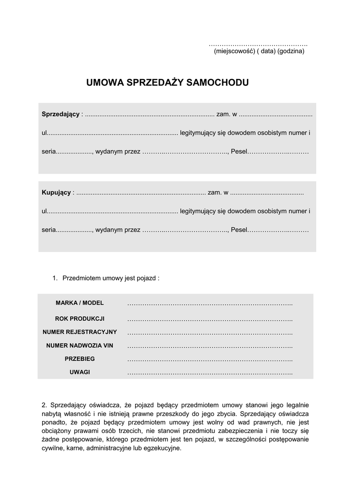 ………………………………………. (miejscowość) ( data) (godzina) UMOWA SPRZEDAŻY SAMOCHODU Sprzedający : ........................................................................ zam. w ......................................... ul......................................................................... legitymujący się dowodem osobistym numer i seria...................., wydanym przez ………..……………………….., Pesel………………..……… Kupujący : ........................................................................ zam. w ......................................... ul......................................................................... legitymujący się dowodem osobistym numer i seria...................., wydanym przez ………..……………………….., Pesel………………..……… 1. Przedmiotem umowy jest pojazd : MARKA / MODEL ………………………………………………………………….. ROK PRODUKCJI ………………………………………………………………….. NUMER REJESTRACYJNY ………………………………………………………………….. NUMER NADWOZIA VIN ………………………………………………………………….. PRZEBIEG ………………………………………………………………….. UWAGI ………………………………………………………………….. 2. Sprzedający oświadcza, że pojazd będący przedmiotem umowy stanowi jego legalnie nabytą własność i nie istnieją prawne przeszkody do jego zbycia. Sprzedający oświadcza ponadto, że pojazd będący przedmiotem umowy jest wolny od wad prawnych, nie jest obciążony prawami osób trzecich, nie stanowi przedmiotu zabezpieczenia i nie toczy się żadne postępowanie, którego przedmiotem jest ten pojazd, w szczególności postępowanie cywilne, karne, administracyjne lub egzekucyjne. 3. Pojazd, który jest przedmiotem umowy zgodnie z punktem 1 jest wypadkowy/bez wypadkowy*, posiadał/nie posiadał* fabrycznie kierownicę po lewej stronie, był/nie był* używany do celów zarobkowych. Podczas wypadku zostały uszkodzone następujące elementy: ………………………………………………………………………………. .................................................................................................................................................... 4. Strony ustaliły wartość pojazdu na kwotę (słownie:....................................................................................................................................). 5. Sprzedający przenosi na Kupującego własność pojazdu określonego w pkt. 1 niniejszej umowy za cenę określoną w pkt. 4. Przez podpisanie niniejszej umowy Sprzedający kwituje otrzymanie wskazanej wyżej ceny zakupu, a Kupujący odbiór pojazdu. Za pojazd zapłacono w gotówce/przelewem* . Na numer konta…………………………………………………………… 6. Kupujący potwierdza odbiór ....... kompletu(ów) kluczyków (oryginalnych/nie oryginalnych*) dowodu rejestracyjnego i następujących dokumentów związanych z pojazdem : ................................................................................................................................................... …………………………………………………………………………………………………………. 7. Sprzedający oświadcza, że pojazd nie ma ukrytych wad technicznych, a Kupujący potwierdza znajomość stanu technicznego pojazdu. 8. Strony ustaliły, że wszelkiego rodzaju koszty transakcji wynikające z realizacji niniejszej umowy, w szczególności należności publiczno-prawne i koszty opłaty skarbowej obciążają Kupującego. 9. Wszelkie zmiany w treści niniejszej umowy wymagają zachowania formy pisemnej pod rygorem nieważności. 10. Sprawy nieuregulowane niniejszą umową regulują przepisy kodeksu cywilnego. 11. Umowę sporządzono w dwóch jednobrzmiących egzemplarzach, po jednym dla każdej ze stron. ** ..................................... KUPUJĄCY * Niepotrzebne skreślić ** Kompletna umowa zawiera 2 strony ........................................ SPRZEDAJĄCY