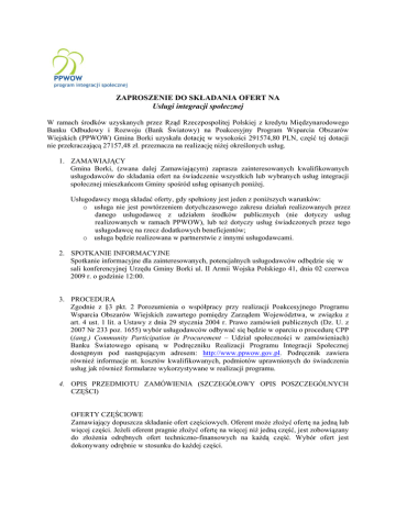 ZAPROSZENIE DO SKŁADANIA OFERT NA Usługi integracji społecznej W ramach środków uzyskanych przez Rząd Rzeczpospolitej Polskiej z kredytu Międzynarodowego Banku Odbudowy i Rozwoju (Bank Światowy) na Poakcesyjny Program Wsparcia Obszarów Wiejskich (PPWOW) Gmina Borki uzyskała dotację w wysokości 291574,80 PLN, część tej dotacji nie przekraczającą 27157,48 zł. przeznacza na realizację niżej określonych usług. 1. ZAMAWIAJĄCY Gmina Borki, (zwana dalej Zamawiającym) zaprasza zainteresowanych kwalifikowanych usługodawców do składania ofert na świadczenie wszystkich lub wybranych usług integracji społecznej mieszkańcom Gminy spośród usług opisanych poniżej. Usługodawcy mogą składać oferty, gdy spełniony jest jeden z poniższych warunków: o usługa nie jest powtórzeniem dotychczasowego zakresu działań realizowanych przez danego usługodawcę z udziałem środków publicznych (nie dotyczy usług realizowanych w ramach PPWOW), lub też dotyczy usług świadczonych przez tego usługodawcę na rzecz dodatkowych beneficjentów; o usługa będzie realizowana w partnerstwie z innymi usługodawcami. 2. SPOTKANIE INFORMACYJNE Spotkanie informacyjne dla zainteresowanych, potencjalnych usługodawców odbędzie się w sali konferencyjnej Urzędu Gminy Borki ul. II Armii Wojska Polskiego 41, dnia 02 czerwca 2009 r. o godzinie 12:00. 3. PROCEDURA Zgodnie z §3 pkt. 2 Porozumienia o współpracy przy realizacji Poakcesyjnego Programu Wsparcia Obszarów Wiejskich zawartego pomiędzy Zarządem Województwa, w związku z art. 4 ust. 1 lit. a Ustawy z dnia 29 stycznia 2004 r. Prawo zamówień publicznych (Dz. U. z 2007 Nr 233 poz. 1655) wybór usługodawców odbywać się będzie w oparciu o procedurę CPP ((ang.) Community Participation in Procurement – Udział społeczności w zamówieniach) Banku Światowego opisaną w Podręczniku Realizacji Programu Integracji Społecznej dostępnym pod następującym adresem: http://www.ppwow.gov.pl. Podręcznik zawiera również informacje nt. kosztów kwalifikowanych, podmiotów uprawnionych do świadczenia usług jak również formularze wykorzystywane w realizacji programu. 4. OPIS PRZEDMIOTU ZAMÓWIENIA (SZCZEGÓŁOWY OPIS POSZCZEGÓLNYCH CZĘŚCI) OFERTY CZĘŚCIOWE Zamawiający dopuszcza składanie ofert częściowych. Oferent może złożyć ofertę na jedną lub więcej części. Jeżeli oferent pragnie złożyć ofertę na więcej niż jedną część, jest zobowiązany do złożenia odrębnych ofert techniczno-finansowych na każdą część. Wybór ofert jest dokonywany odrębnie w stosunku do każdej części. WARIANTY Zamawiający nie dopuszcza ofert wariantowych Część I: Wsparcie szkoleniowe. Organizacja szkoleń, kursów dla mieszkańców Gminy Borki z następujących zakresów: - podstawy funkcjonowania organizacji pozarządowych; - prowadzenie księgowości organizacji pozarządowych; - pozyskiwanie środków finansowych, poprawne przygotowywanie wniosków, projektami,; zarządzanie Wymagania zamawiającego: - zapewnienie materiałów szkoleniowych dla uczestników; - wydanie certyfikatów ukończenia szkolenia; - szkolenie będzie obejmowało min. 20 osób; - zapewnienie wysokiej jakości usługi; - zapewnienie poczęstunku uczestnikom szkolenia; - objecie szkoleniem min. 10 osób w każdym module. Termin wykonania zamówienia: od czerwca do grudnia 2009 Na realizację tych usług przeznacza się maksymalnie kwotę: 10000 zł. Usługodawca zobowiązany jest do przedstawienia w ofercie informacji nt. sposobu monitorowania realizacji usług, przewidywanych działań informacyjnych, jak również informacji dotyczących zapewnienia trwałości podejmowanych działań. Podstawą dla płatności na rzecz usługodawcy będzie rzeczywiście zrealizowana liczba jednostek zdefiniowanych jako: wykonanie usługi – 1 godzina szkolenia. Część II – Organizacja wizyt studyjnych Zorganizowanie co najmniej 1 wizyty studyjnej o tematyce: • zapoznanie z dobrymi praktykami w zakresie działalności organizacji pozarządowych; • zapoznanie z działalnością grup wolontariuszy; • wspieranie prospołecznych inicjatyw młodzieży; • aktywizacja mieszkańców, rozwijanie przedsiębiorczości; Wymagania zamawiającego: 1. objecie wizytami studyjnymi min. 15 osób w każdym module; 2. zapewnienie zakwaterowania, wyżywienia i transportu; 3. zapewnienie atrakcyjnego, zgodnego z celami wizyty programu. Termin wykonania zamówienia: od czerwca do grudnia 2009 Na realizację tych usług przeznacza się maksymalnie kwotę: 17157,48 zł. Usługodawca zobowiązany jest do przedstawienia w ofercie informacji nt. sposobu monitorowania realizacji usług, przewidywanych działań informacyjnych, jak również informacji dotyczących zapewnienia trwałości podejmowanych działań. Podstawą dla płatności na rzecz usługodawcy będzie rzeczywiście zrealizowana liczba jednostek zdefiniowanych jako: wykonanie usługi - 1 wyjazd studyjny 5. UPRAWNIENI USŁUGODAWCY Podmiotami uprawnionymi do ubiegania się o zamówienie w ramach niniejszej procedury są: 1. Organizacje pozarządowe (NGOs) 2. Organizacje kościelne 3. Prywatni usługodawcy: Firmy, osoby fizyczne, spółdzielnie socjalne, 4. Samorządy zawodowe, organizacje samorządu gospodarczego, izby rolnicze 5. Jednostki organizacyjne samorządu terytorialnego, stowarzyszenia jst i im podległe jednostki organizacyjne, 6. KRYTERIA OCENY TECHNICZNEJ W odniesieniu do części I. a. zgodność z warunkami realizacji i zakresem zamawianych usług b. dysponowanie odpowiednią bazą lokalową (min. 40 m2), z zapleczem sanitarnym na terenie gminy Borki c. dysponowanie wykwalifikowaną kadrą stosownie do specyfiki oferowanych szkoleń przedstawienie spójnego programu realizowanych zajęć d. przedstawienie spójnego programu realizowanych zajęć Zamawiający oceni spełnienie powyższych minimalnych kryteriów technicznych w oparciu o następujące dokumenty/oświadczenia: a. Program 