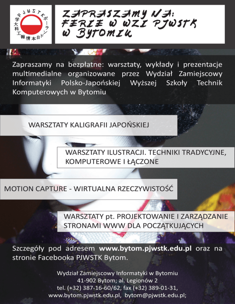 ZAPRASZAMY NA: FERIE W WZI PJWSTK W BYTOMIU Zapraszamy na bezpłatne: warsztaty, wykłady i prezentacje multimedialne organizowane przez Wydział Zamiejscowy Informatyki Polsko-Japońskiej Wyższej Szkoły Technik Komputerowych w Bytomiu WARSZTATY KALIGRAFII JAPOŃSKIEJ WARSZTATY ILUSTRACJI. TECHNIKI TRADYCYJNE, KOMPUTEROWE I ŁĄCZONE MOTION CAPTURE - WIRTUALNA RZECZYWISTOŚĆ WARSZTATY pt. PROJEKTOWANIE I ZARZĄDZANIE STRONAMI WWW DLA POCZĄTKUJĄCYCH Szczegóły pod adresem www.bytom.pjwstk.edu.pl oraz na stronie Facebooka PJWSTK Bytom. Wydział Zamiejscowy Informatyki w Bytomiu 41-902 Bytom; al. Legionów 2 tel. (+32) 387-16-60/62, fax (+32) 389-01-31, www.bytom.pjwstk.edu.pl, [email protected];