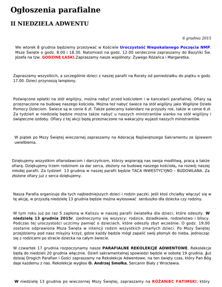 Ogłoszenia parafialne II NIEDZIELA ADWENTU 6 grudnia 2015 We wtorek 8 grudnia będziemy przeżywać w Kościele Uroczystość Niepokalanego Poczęcia NMP. Msze Święte o godz. 8.00 i 18.30. Natomiast na godz. 12.00 serdecznie zapraszamy do Bazyliki Św. Józefa na tzw. GODZINĘ ŁASKI.Zapraszamy nasze wspólnoty: Żywego Różańca i Margaretka. Zapraszamy wszystkich, a szczególnie dzieci z naszej parafii na Roraty od poniedziałku do piątku o godz. 17.00. Dzieci przynoszą lampiony. Poświęcone opłatki na stół wigilijny, można nabyć przed kościołem i w kancelarii parafialnej. Ofiary są przeznaczone na budowę naszego kościoła. Można też nabyć świece na stół wigilijny jako Wigilijne Dzieło Pomocy Dzieciom. Świece są w cenie 6 zł. Także polecamy kalendarz na przyszły rok, także w cenie 6 zł. Za tydzień w niedzielę będzie można także nabyć u naszych ministrantów sianko na stół wigilijny i świąteczne ozdoby. Ofiary z tej akcji będą przeznaczone na wakacyjny wyjazd naszych ministrantów. W piątek po Mszy Świętej wieczornej zapraszamy na Adorację Najświętszego Sakramentu ze śpiewem uwielbienia. Dziękujemy wszystkim ofiarodawcom i darczyńcom, którzy wspierają nas swoja modlitwą, pracą a także ofiarą. Dziękujemy trzem rodzinom za dar serca, złożony na budowę naszego kościoła, na rozwój naszej młodej parafii. Za tydzień 13 grudnia w naszej parafii będzie TACA INWESTYCYJNO – BUDOWLANA. Za złożone ofiary już z serca dziękujemy. Nasza Parafia organizuje dla tych najbiedniejszych dzieci i rodzin paczki. Jeśli ktoś chciałby włączyć się w tę akcję, w przyszłą niedzielę 13 grudnia będzie można wylosować serduszko dla dziecka czy rodziny. W tym roku już po raz 5 zapłoną w Kaliszu w naszej parafii światełka dla dzieci, które odeszły. W niedzielę 13 grudnia 2015r. zjednoczymy się wszyscy: rodzice, dziadkowie, rodzeństwo i bliscy. Podczas tej uroczystości uczcimy pamięć o dzieciach, które odeszły zbyt wcześnie. O godz. 19.00 zostanie odprawiona Msza Święta w intencji rodzin wszystkich zmarłych dzieci. Po Mszy Świętej przejdziemy pod nasz misyjny krzyż, gdzie każdy będzie mógł zapalić swój płomyk do nieba, jednocząc się z rodzicami po stracie dziecka na całym świecie. W czwartek 17 grudnia rozpoczynamy nasze PARAFIALNE REKOLEKCJE ADWENTOWE. Rekolekcje będą do niedzieli 20 grudnia włącznie. Dzień sakramentalnej spowiedzi będzie w sobotę 19 grudnia. Już dzisiaj Drogich Parafian i Gości zapraszamy na Rekolekcje Adwentowe, na ten święty czas, który Pan Bóg daje każdemu z nas. Rekolekcje wygłosi O. Andrzej Smołka, Sercanin Biały z Wrocławia. W niedzielę 13 grudnia po wieczornej Mszy Świętej, zapraszamy na RÓŻANIEC FATIMSKI, który wyjątkowo będzie o godz. 18.15. Nie będzie procesji wokół kaplicy z figurą Matki Bożej. Również w niedzielę 13 grudnia ks. biskup Edward Janiak, zaprasza wszystkich na uroczyste otwarcie Roku Miłosierdzia Bożego. O godz. 16.00 od o. Jezuitów przejdzie procesja do Katedry Kaliskiej, gdzie odbędzie się uroczyste otwarcie Drzwi i Eucharystia. Z naszej wspólnoty Pan Bóg odwołał do wieczności Śp. Bronisławę Rzeźnicką z Al. Ks. Jerzego Popiełuszki 3, która przeżyła 73 lata, jej pogrzeb odbył się w piątek. Módlmy się w jej intencji: Wieczny odpoczynek racz jej dać Panie Zapraszamy do czytania prasy katolickiej. Jest nowy „Opiekun”, a w nim polecamy artykuł o uproszczonych procedurach stwierdzenia nieważności małżeństwa – czyli o tym co się zmieniło po synodzie biskupów o rodzinie. Polecamy także „Przewodnik Katolicki”, i „Niedziele” w których jest także wiele dobrych artykułów. Wszystkim Parafianom i Gościom dziękujemy za wspólną modlitwę i życzymy dobrego tygodnia, natomiast wszystkim, którzy w najbliższych dniach będą świętowali swoje imieniny, urodziny, czy inne jubileusze, życzymy obfitości Bożego Błogosławieństwa. Szczęść Boże!