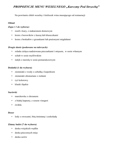 PROPOZYCJE MENU WESELNEGO „Karczmy Pod Strzechą” Na powitanie chleb weselny i kieliszek wina musującego od restauracji Obiad Zupa ( 1 do wyboru): • rosół z kury, z makaronem domowym • krem z borowików z kaszą lub kluseczkami • krem z brokułów z grzankami lub prażonymi migdałami Drugie danie (podawane na talerzach): • rolada cielęca nadziewana pieczarkami i mięsem, w sosie własnym • schab w sosie myśliwskim • indyk z morelą w sosie pomarańczowym Dodatki (1 do wyboru) • ziemniaki z wody z cebulką i koperkiem • ziemniaki obsmażane z ziołami • ryż kolorowy • kluski śląskie Surówki • marchewka z chrzanem • z białej kapusty, z sosem vinegret • ćwikła Deser • lody z owocami, bitą śmietaną i czekoladą Zimny bufet (7 do wyboru) • deska wiejskich wędlin • deska pieczonych mięs • deska serów • tymbaliki drobiowe /tymbaliki wieprzowe • trio śledziowe • łosoś z kaparami w auszpiku • schab z kremem chrzanowym w galarecie • rolada drobiowa w galarecie • jajka faszerowane na trzy sposoby • tradycyjna sałatka jarzynowa • sałatka pistacjowa • sałatka wiosenna • tuńczyk na brzoskwini Gorące kolacje (3 do wyboru) • zraz wołowy po chłopsku podany z kluskami śląskimi i kiszoną kapustą • mieszki drobiowe w sosie pieczeniowym z ryżem (trzy kolory), i surówka pekińską • wiącha ze strzechy , ćwiartki ziemniaczane i modra kapusta, • barszczyk czerwony z kapuśniakami • kociołek szefa z wołowiny i warzyw • udziec wieprzowy z ziemniakami obsmażanymi z kminkiem i kapustą zasmażaną • kieszonka drobiowa w sosie żurawinowym z kokardkami makaronowymi i sałatką wiosenną • gulasz z indyka na ostro Napoje gorące • kawa, herbata – nielimitowane Napoje zimne • soki, woda mineralna, mirinda, pepsi – nielimitowane Owoce na kloszach Pieczywo mieszane Dodatkową atrakcją jest „Stół chłopski”, który otrzymacie Państwo od Firmy -GRATIS! /A na nim znajdują się różne specjały kuchni staropolskiej na zimno i na ciepło./