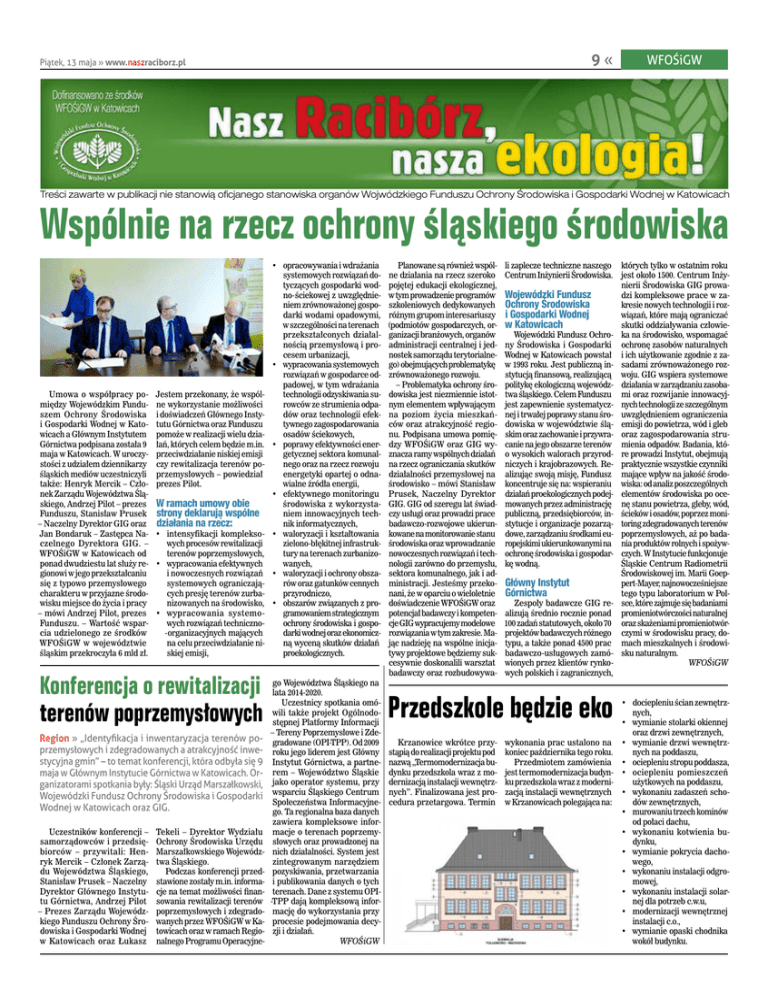 9« Piątek, 13 maja » www.naszraciborz.pl WFOŚiGW Treści zawarte w publikacji nie stanowią oficjanego stanowiska organów Wojwódzkiego Funduszu Ochrony Środowiska i Gospodarki Wodnej w Katowicach Wspólnie na rzecz ochrony śląskiego środowiska Umowa o współpracy pomiędzy Wojewódzkim Funduszem Ochrony Środowiska i Gospodarki Wodnej w Katowicach a Głównym Instytutem Górnictwa podpisana została 9 maja w Katowicach. W uroczystości z udziałem dziennikarzy śląskich mediów uczestniczyli także: Henryk Mercik – Członek Zarządu Województwa Śląskiego, Andrzej Pilot – prezes Funduszu, Stanisław Prusek – Naczelny Dyrektor GIG oraz Jan Bondaruk – Zastępca Naczelnego Dyrektora GIG. – WFOŚiGW w Katowicach od ponad dwudziestu lat służy regionowi w jego przekształcaniu się z typowo przemysłowego charakteru w przyjazne środowisku miejsce do życia i pracy – mówi Andrzej Pilot, prezes Funduszu. – Wartość wsparcia udzielonego ze środków WFOŚiGW w województwie śląskim przekroczyła 6 mld zł. Jestem przekonany, że wspólne wykorzystanie możliwości i doświadczeń Głównego Instytutu Górnictwa oraz Funduszu pomoże w realizacji wielu działań, których celem będzie m.in. przeciwdziałanie niskiej emisji czy rewitalizacja terenów poprzemysłowych – powiedział prezes Pilot. W ramach umowy obie strony deklarują wspólne działania na rzecz: • intensyfikacji kompleksowych procesów rewitalizacji terenów poprzemysłowych, • wypracowania efektywnych i nowoczesnych rozwiązań systemowych ograniczających presję terenów zurbanizowanych na środowisko, • wypracowania systemowych rozwiązań techniczno-organizacyjnych mających na celu przeciwdziałanie niskiej emisji, Konferencja o rewitalizacji terenów poprzemysłowych Region » „Identyfikacja i inwentaryzacja terenów poprzemysłowych i zdegradowanych a atrakcyjność inwestycyjna gmin” – to temat konferencji, która odbyła się 9 maja w Głównym Instytucie Górnictwa w Katowicach. Organizatorami spotkania były: Śląski Urząd Marszałkowski, Wojewódzki Fundusz Ochrony Środowiska i Gospodarki Wodnej w Katowicach oraz GIG. Uczestników konferencji – samorządowców i przedsiębiorców – przywitali: Henryk Mercik – Członek Zarządu Województwa Śląskiego, Stanisław Prusek – Naczelny Dyrektor Głównego Instytutu Górnictwa, Andrzej Pilot – Prezes Zarządu Wojewódzkiego Funduszu Ochrony Środowiska i Gospodarki Wodnej w Katowicach oraz Łukasz Tekeli – Dyrektor Wydziału Ochrony Środowiska Urzędu Marszałkowskiego Województwa Śląskiego. Podczas konferencji przedstawione zostały m.in. informacje na temat możliwości finansowania rewitalizacji terenów poprzemysłowych i zdegradowanych przez WFOŚiGW w Katowicach oraz w ramach Regionalnego Programu Operacyjne- • opracowywania i wdrażania systemowych rozwiązań dotyczących gospodarki wodno-ściekowej z uwzględnieniem zrównoważonej gospodarki wodami opadowymi, w szczególności na terenach przekształconych działalnością przemysłową i procesem urbanizacji, • wypracowania systemowych rozwiązań w gospodarce odpadowej, w tym wdrażania technologii odzyskiwania surowców ze strumienia odpadów oraz technologii efektywnego zagospodarowania osadów ściekowych, • poprawy efektywności energetycznej sektora komunalnego oraz na rzecz rozwoju energetyki opartej o odnawialne źródła energii, • efektywnego monitoringu środowiska z wykorzystaniem innowacyjnych technik informatycznych, • waloryzacji i kształtowania zielono-błękitnej infrastruktury na terenach zurbanizowanych, • waloryzacji i ochrony obszarów oraz gatunków cennych przyrodniczo, • obszarów związanych z programowaniem strategicznym ochrony środowiska i gospodarki wodnej oraz ekonomiczną wyceną skutków działań proekologicznych. go Województwa Śląskiego na lata 2014-2020. Uczestnicy spotkania omówili także projekt Ogólnodostępnej Platformy Informacji – Tereny Poprzemysłowe i Zdegradowane (OPI-TPP). Od 2009 roku jego liderem jest Główny Instytut Górnictwa, a partnerem – Województwo Śląskie jako operator systemu, przy wsparciu Śląskiego Centrum Społeczeństwa Informacyjnego. Ta regionalna baza danych zawiera kompleksowe informacje o terenach poprzemysłowych oraz prowadzonej na nich działalności. System jest zintegrowanym narzędziem pozyskiwania, przetwarzania i publikowania danych o tych terenach. Dane z systemu OPI-TPP dają kompleksową informację do wykorzystania przy procesie podejmowania decyzji i działań. WFOŚiGW Planowane są również wspólne działania na rzecz szeroko pojętej edukacji ekologicznej, w tym prowadzenie programów szkoleniowych dedykowanych różnym grupom interesariuszy (podmiotów gospodarczych, organizacji branżowych, organów administracji centralnej i jednostek samorządu terytorialnego) obejmujących problematykę zrównoważonego rozwoju. – Problematyka ochrony środowiska jest niezmiennie istotnym elementem wpływającym na poziom życia mieszkańców oraz atrakcyjność regionu. Podpisana umowa pomiędzy WFOŚiGW oraz GIG wyznacza ramy wspólnych działań na rzecz ograniczania skutków działalności przemysłowej na środowisko – mówi Stanisław Prusek, Naczelny Dyrektor GIG. GIG od szeregu lat świadczy usługi oraz prowadzi prace badawczo-rozwojowe ukierunkowane na monitorowanie stanu środowiska oraz wprowadzanie nowoczesnych rozwiązań i technologii zarówno do przemysłu, sektora komunalnego, jak i administracji. Jesteśmy przekonani, że w oparciu o wieloletnie doświadczenie WFOŚiGW oraz potencjał badawczy i kompetencje GIG wypracujemy modelowe rozwiązania w tym zakresie. Mając nadzieję na wspólne inicjatywy projektowe będziemy sukcesywnie doskonalili warsztat badawczy oraz rozbudowywa- li zaplecze techniczne naszego Centrum Inżynierii Środowiska. Wojewódzki Fundusz Ochrony Środowiska i Gospodarki Wodnej w Katowicach Wojewódzk