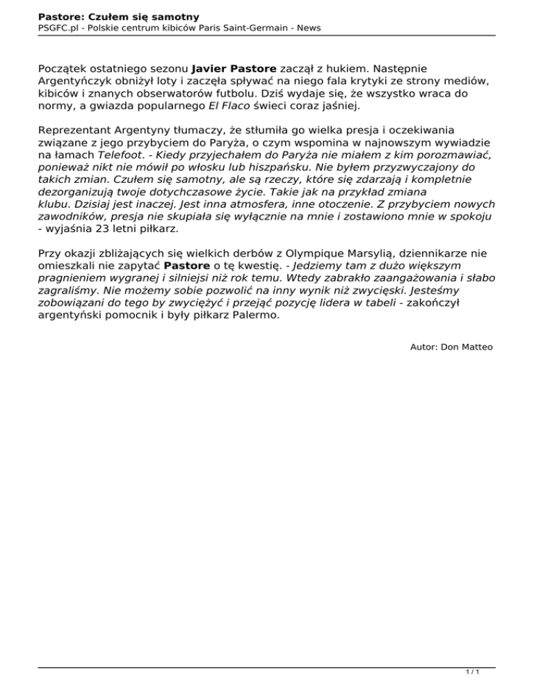 Pastore: Czułem się samotny PSGFC.pl - Polskie centrum kibiców Paris Saint-Germain - News Początek ostatniego sezonu Javier Pastore zaczął z hukiem. Następnie Argentyńczyk obniżył loty i zaczęła spływać na niego fala krytyki ze strony mediów, kibiców i znanych obserwatorów futbolu. Dziś wydaje się, że wszystko wraca do normy, a gwiazda popularnego El Flaco świeci coraz jaśniej. Reprezentant Argentyny tłumaczy, że stłumiła go wielka presja i oczekiwania związane z jego przybyciem do Paryża, o czym wspomina w najnowszym wywiadzie na łamach Telefoot. - Kiedy przyjechałem do Paryża nie miałem z kim porozmawiać, ponieważ nikt nie mówił po włosku lub hiszpańsku. Nie byłem przyzwyczajony do takich zmian. Czułem się samotny, ale są rzeczy, które się zdarzają i kompletnie dezorganizują twoje dotychczasowe życie. Takie jak na przykład zmiana klubu. Dzisiaj jest inaczej. Jest inna atmosfera, inne otoczenie. Z przybyciem nowych zawodników, presja nie skupiała się wyłącznie na mnie i zostawiono mnie w spokoju - wyjaśnia 23 letni piłkarz. Przy okazji zbliżających się wielkich derbów z Olympique Marsylią, dziennikarze nie omieszkali nie zapytać Pastore o tę kwestię. - Jedziemy tam z dużo większym pragnieniem wygranej i silniejsi niż rok temu. Wtedy zabrakło zaangażowania i słabo zagraliśmy. Nie możemy sobie pozwolić na inny wynik niż zwycięski. Jesteśmy zobowiązani do tego by zwyciężyć i przejąć pozycję lidera w tabeli - zakończył argentyński pomocnik i były piłkarz Palermo. Autor: Don Matteo 1/1 Powered by TCPDF (www.tcpdf.org)