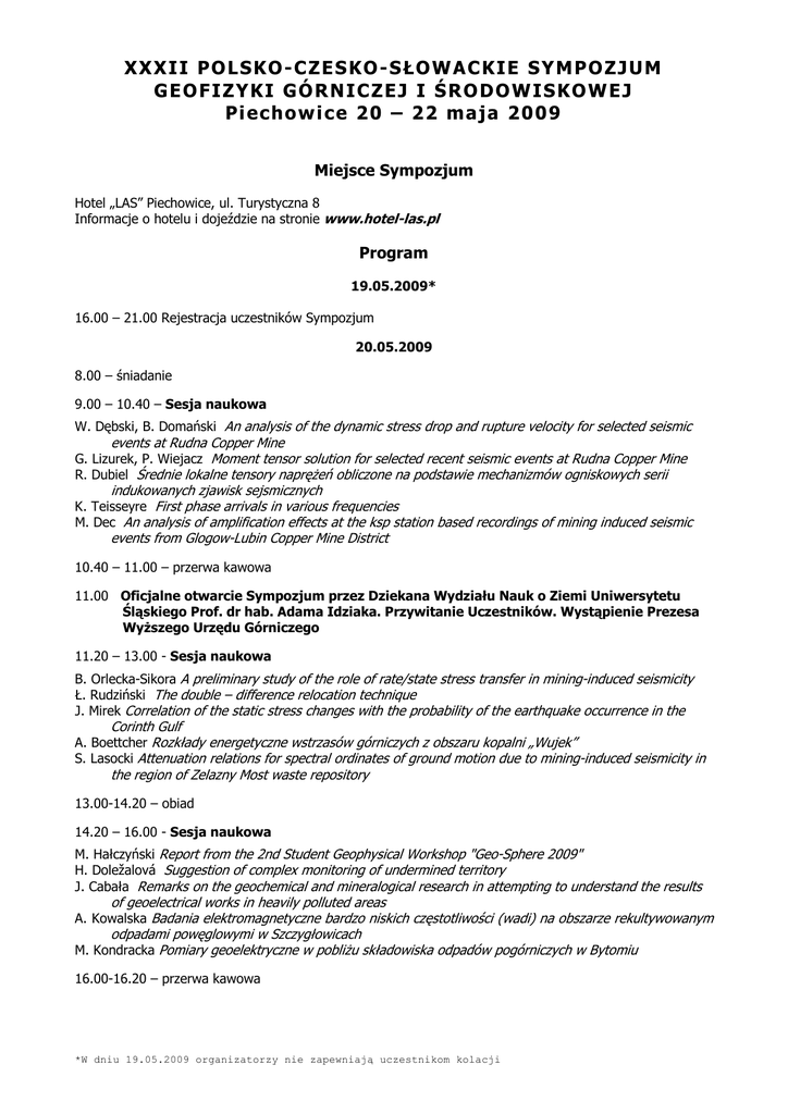 X X X I I P O L S KO - C Z E S KO - S Ł O W A C KI E S Y M P O Z J U M G E O F I Z Y KI G Ó R N I C Z E J I Ś R O D O W I S KO W E J P i ec h o w i c e 2 0 – 2 2 ma j a 2 0 0 9 Miejsce Sympozjum Hotel „LAS” Piechowice, ul. Turystyczna 8 Informacje o hotelu i dojeździe na stronie www.hotel-las.pl Program 19.05.2009* 16.00 – 21.00 Rejestracja uczestników Sympozjum 20.05.2009 8.00 – śniadanie 9.00 – 10.40 – Sesja naukowa W. Dębski, B. Domański An analysis of the dynamic stress drop and rupture velocity for selected seismic events at Rudna Copper Mine G. Lizurek, P. Wiejacz Moment tensor solution for selected recent seismic events at Rudna Copper Mine R. Dubiel Średnie lokalne tensory napręŜeń obliczone na podstawie mechanizmów ogniskowych serii indukowanych zjawisk sejsmicznych K. Teisseyre First phase arrivals in various frequencies M. Dec An analysis of amplification effects at the ksp station based recordings of mining induced seismic events from Glogow-Lubin Copper Mine District 10.40 – 11.00 – przerwa kawowa 11.00 Oficjalne otwarcie Sympozjum przez Dziekana Wydziału Nauk o Ziemi Uniwersytetu Śląskiego Prof. dr hab. Adama Idziaka. Przywitanie Uczestników. Wystąpienie Prezesa WyŜszego Urzędu Górniczego 11.20 – 13.00 - Sesja naukowa B. Orlecka-Sikora A preliminary study of the role of rate/state stress transfer in mining-induced seismicity Ł. Rudziński The double – difference relocation technique J. Mirek Correlation of the static stress changes with the probability of the earthquake occurrence in the Corinth Gulf A. Boettcher Rozkłady energetyczne wstrzasów górniczych z obszaru kopalni „Wujek” S. Lasocki Attenuation relations for spectral ordinates of ground motion due to mining-induced seismicity in the region of Zelazny Most waste repository 13.00-14.20 – obiad 14.20 – 16.00 - Sesja naukowa M. Hałczyński Report from the 2nd Student Geophysical Workshop "Geo-Sphere 2009" H. Doležalová Suggestion of complex monitoring of undermined territory J. Cabała Remarks on the geochemical and mineralogical research in attempting to understand the results of geoelectrical works in heavily polluted areas A. Kowalska Badania elektromagnetyczne bardzo niskich częstotliwości (wadi) na obszarze rekultywowanym odpadami powęglowymi w Szczygłowicach M. Kondracka Pomiary geoelektryczne w pobliŜu składowiska odpadów pogórniczych w Bytomiu 16.00-16.20 – przerwa kawowa *W dniu 19.05.2009 organizatorzy nie zapewniają uczestnikom kolacji 16.20 – 18.00 - Sesja naukowa J. Pierwoła, J. Badera, Z. Mirkowski Zastosowanie obrazowania oporu do rozpoznania warunków geotechnicznych na obszarze dawnej eksploatacji górniczej T. Magiera, J. Zawadzki Geostatistical evaluation of magnetic parameters as an indicator of heavy metal contamination in forest topsoil B. śogała, W.M. Zuberek Zastosowanie inwersji 1D pomiarów elektromagnetycznych w badaniach środowiskowych i geologicznych D. Malczewski Inter- Laboratory Background Radioactivity Comparisons (Boulby - Modane - Gran Sasso) A. Wysowska-Świebodzińska, J. Pierwoła Electrical resistivity in recognizing geomorphological forms 19.00 – kolacja 21.05.2009 8.00 – śniadanie 9.00 – 10.40 - Sesja naukowa J. Rusinek, J. Kudela, S. Kurnik Ocena wpływu wielkości wydobycia ze ściany na poziom zagroŜenia sejsmicznego w warunkach KWK ”Piast” M. Broz, J. Strunc Seismological measuring systems for monitoring heavy works at subterraneous buildings and basements of engineering structures A. Lisek, L. Teper Czy geometria uskoku odzwierciedla skłonności górotworu do akumulacji napręŜeń? J. Duda Badanie związku pomiędzy zjawiskami sejsmicznymi, wywołanymi działalnością górniczą a deformacjami powierzchni terenu M. Bogusz, M. Mendecki Sejsmiczne i geodezyjne obserwacje wykształcania się niecki osiadania nad eksploatacją ścianową 10.40 – 11.00 – przerwa kawowa 11.00 – 12.00 - Sesja naukowa A. Idziak, I. Stan-Kłeczek Wyznaczanie tensora spękań i tensora przepuszczalności w masywach spękanych J.Vilhelm, V. Rudajev, R. Živor Influence of set of fractures on seismic wave velocity T.Svitek Determination of onset time of seismoacoustic impulses 12.00 – obiad 13.00 – 19.00 – wycieczka Sztolnie Kowary – Skarb Walonów i Park Miniatur Zabytków Dolnego Śląska 20.00 – uroczysta kolacja 22.05.2009 8.00 – śniadanie 9.00 – 10.00 – Sesja naukowa Z. Kaláb, J.Knejzlík Evaluation of seismic effect generated by mining induced seismicity in Stonava Area R. WyŜgolik, J. Koza, A. Augustyniak Digital seismic event detection system with the new data logger ( Part II ) J. Knejzlík, Z. Kaláb, M. Lednicka Preliminary results of data from distributed measuring network for investigation of medieval Mine Jeroným stability 10.00 -10.20 – przerwa kawowa 10.20 – 11.40 – Sesja naukowa S.R. Ćmiel, M. Dziurowicz Przejawy metamorfizmu frykcyjnego węgla w Górnośląskim Zagłębiu Węglowym Z. Kaláb, M. Lednická Seismic loading of medieval Mine Jeroným during swarm in West Bohemia in 2008 K. Jochymczyk, W.M. Zuberek Monitoring geodynamiczny centralnej części GZW A. Poręba, K. Jochymczyk, J. Cabała Inwersyjne obrazowanie oporu zloŜa Zn-Pb Zawiercie 11.40 Zamknięcie Sympozjum 12.20 - obiad