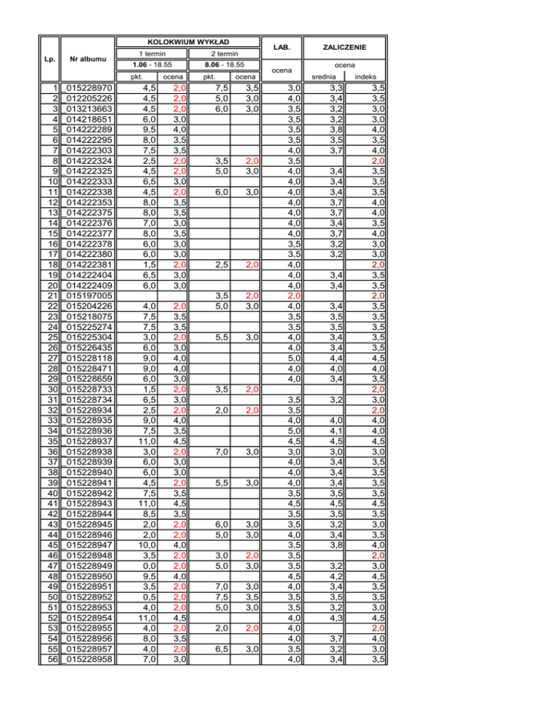 KOLOKWIUM WYKŁAD Lp. 1 2 3 4 5 6 7 8 9 10 11 12 13 14 15 16 17 18 19 20 21 22 23 24 25 26 27 28 29 30 31 32 33 34 35 36 37 38 39 40 41 42 43 44 45 46 47 48 49 50 51 52 53 54 55 56 Nr albumu _015228970 _012205226 _013213663 _014218651 _014222289 _014222295 _014222303 _014222324 _014222325 _014222333 _014222338 _014222353 _014222375 _014222376 _014222377 _014222378 _014222380 _014222381 _014222404 _014222409 _015197005 _015204226 _015218075 _015225274 _015225304 _015226435 _015228118 _015228471 _015228659 _015228733 _015228734 _015228934 _015228935 _015228936 _015228937 _015228938 _015228939 _015228940 _015228941 _015228942 _015228943 _015228944 _015228945 _015228946 _015228947 _015228948 _015228949 _015228950 _015228951 _015228952 _015228953 _015228954 _015228955 _015228956 _015228957 _015228958 LAB. 1 termin 2 termin 1.06 - 18.55 8.06 - 18.55 pkt. pkt. ocena 4,5 4,5 4,5 6,0 9,5 8,0 7,5 2,5 4,5 6,5 4,5 8,0 8,0 7,0 8,0 6,0 6,0 1,5 6,5 6,0 2,0 2,0 2,0 3,0 4,0 3,5 3,5 2,0 2,0 3,0 2,0 3,5 3,5 3,0 3,5 3,0 3,0 2,0 3,0 3,0 4,0 7,5 7,5 3,0 6,0 9,0 9,0 6,0 1,5 6,5 2,5 9,0 7,5 11,0 3,0 6,0 6,0 4,5 7,5 11,0 8,5 2,0 2,0 10,0 3,5 0,0 9,5 3,5 0,5 4,0 11,0 4,0 8,0 4,0 7,0 2,0 3,5 3,5 2,0 3,0 4,0 4,0 3,0 2,0 3,0 2,0 4,0 3,5 4,5 2,0 3,0 3,0 2,0 3,5 4,5 3,5 2,0 2,0 4,0 2,0 2,0 4,0 2,0 2,0 2,0 4,5 2,0 3,5 2,0 3,0 ocena ocena 7,5 5,0 6,0 3,5 3,0 3,0 3,5 5,0 2,0 3,0 6,0 3,0 2,5 2,0 3,5 5,0 2,0 3,0 5,5 3,0 3,5 2,0 2,0 2,0 7,0 3,0 5,5 3,0 6,0 5,0 3,0 3,0 3,0 5,0 2,0 3,0 7,0 7,5 5,0 3,0 3,5 3,0 2,0 2,0 6,5 3,0 ZALICZENIE ocena srednia 3,0 4,0 3,5 3,5 3,5 3,5 4,0 3,5 4,0 4,0 4,0 4,0 4,0 4,0 4,0 3,5 3,5 4,0 4,0 4,0 2,0 4,0 3,5 3,5 4,0 4,0 5,0 4,0 4,0 3,5 3,5 4,0 5,0 4,5 3,0 4,0 4,0 4,0 3,5 4,5 3,5 3,5 4,0 3,5 3,5 3,5 4,5 4,0 3,5 3,5 4,0 4,0 4,0 3,5 4,0 3,3 3,4 3,2 3,2 3,8 3,5 3,7 2,0 3,4 3,4 3,4 3,7 3,7 3,4 3,7 3,2 3,2 2,0 3,4 3,4 2,0 3,4 3,5 3,5 3,4 3,4 4,4 4,0 3,4 2,0 3,2 2,0 4,0 4,1 4,5 3,0 3,4 3,4 3,4 3,5 4,5 3,5 3,2 3,4 3,8 2,0 3,2 4,2 3,4 3,5 3,2 4,3 2,0 3,7 3,2 3,4 indeks 3,5 3,5 3,0 3,0 4,0 3,5 4,0 2,0 3,5 3,5 3,5 4,0 4,0 3,5 4,0 3,0 3,0 2,0 3,5 3,5 2,0 3,5 3,5 3,5 3,5 3,5 4,5 4,0 3,5 2,0 3,0 2,0 4,0 4,0 4,5 3,0 3,5 3,5 3,5 3,5 4,5 3,5 3,0 3,5 4,0 2,0 3,0 4,5 3,5 3,5 3,0 4,5 2,0 4,0 3,0 3,5 57 58 59 60 61 62 63 64 65 66 67 68 69 70 71 72 73 74 75 76 77 78 79 80 81 82 83 84 85 86 87 88 89 90 91 92 93 94 95 96 97 98 99 100 101 102 103 104 105 106 107 108 109 110 111 112 113 114 115 116 117 _015228959 _015228960 _015228961 _015228962 _015228963 _015228964 _015228965 _015228966 _015228967 _015228969 _015228971 _015228972 _015228973 _015228975 _015228976 _015228977 _015228978 _015228979 _015228980 _015228981 _015228982 _015228983 _015228985 _015228986 _015228987 _015228988 _015228989 _015228990 _015228991 _015228992 _015228993 _015228994 _015228996 _015228997 _015229000 _015229001 _015229002 _015229003 _015229004 _015229005 _015229006 _015229007 _015229008 _015229009 _015229010 _015229011 _015229012 _015229013 _015229014 _015229015 _015229016 _015229017 _015229018 _015229019 _015229020 _015229021 _015229022 _015229023 _015229024 _015229025 _015229026 7,5 4,5 8,0 6,0 6,5 4,0 0,5 6,0 7,5 7,0 1,5 6,0 4,0 6,0 3,5 2,0 3,5 3,0 3,0 2,0 2,0 3,0 3,5 3,0 2,0 3,0 2,0 3,0 6,0 8,0 4,5 9,0 3,0 3,5 2,0 4,0 8,5 3,0 6,5 6,0 3,0 3,5 2,0 3,0 3,0 2,0 9,5 6,0 4,5 7,0 7,0 3,0 8,0 7,5 10,5 4,5 6,5 6,0 2,5 2,0 10,0 6,5 8,5 4,0 3,0 2,0 3,0 3,0 2,0 3,5 3,5 4,5 2,0 3,0 3,0 2,0 2,0 4,0 3,0 3,5 1,5 6,0 6,0 9,0 2,0 3,0 3,0 4,0 11,5 9,0 3,5 3,5 6,0 6,5 10,0 2,5 10,0 7,5 1,5 6,0 5,0 4,0 2,0 2,0 3,0 3,0 4,0 2,0 4,0 3,5 2,0 3,0 6,5 3,0 6,5 5,0 3,0 3,0 5,0 3,0 5,0 3,0 7,0 3,0 5,0 3,0 5,0 3,0 5,5 3,0 5,0 3,0 5,0 3,0 7,0 3,0 7,5 6,5 3,5 3,0 5,0 3,0 5,5 6,5 3,0 3,0 7,5 3,5 6,0 3,0 4,0 4,5 4,0 4,0 4,5 3,5 3,5 4,0 4,5 4,5 3,0 4,0 3,0 4,0 4,0 5,0 4,0 3,5 4,0 3,5 3,5 3,0 4,5 3,5 4,0 4,0 3,0 4,0 4,0 4,0 3,5 4,0 4,0 3,5 3,5 4,5 4,0 4,0 4,5 3,5 4,0 2,0 3,5 4,0 4,0 4,5 2,0 5,0 4,0 3,5 4,5 3,5 4,0 4,5 3,5 3,5 3,5 3,5 4,0 3,7 3,6 3,7 3,4 3,6 3,2 3,2 3,4 3,9 3,6 3,0 3,4 3,0 3,4 2,0 3,4 4,1 3,4 3,8 3,4 3,5 3,2 3,0 3,6 3,2 2,0 4,0 3,4 3,0 3,4 3,4 3,4 3,5 3,7 4,3 3,2 3,2 3,6 3,7 3,4 4,2 3,2 3,7 2,0 3,2 3,4 3,4 4,2 2,0 5,0 4,0 3,2 3,6 3,2 3,4 4,2 3,5 3,8 3,5 3,2 3,4 4,0 3,5 4,0 3,5 3,5 3,0 3,0 3,5 4,0 3,5 3,0 3,5 3,0 3,5 2,0 3,5 4,0 3,5 4,0 3,5 3,5 3,0 3,0 3,5 3,0 2,0 4,0 3,5 3,0 3,5 3,5 3,5 3,5 4,0 4,5 3,0 3,0 3,5 4,0 3,5 4,5 3,0 4,0 2,0 3,0 3,5 3,5 4,5 2,0 5,0 4,0 3,0 3,5 3,0 3,5 4,5 3,5 4,0 3,5 3,0 3,5 118 119 120 121 122 123 124 125 126 127 128 129 130 131 132 133 134 135 136 137 138 139 140 141 142 143 144 145 146 147 148 149 150 151 152 153 154 155 156 157 158 _015229029 _015229030 _015229031 _015229032 _015229033 _015229034 _015229035 _015229036 _015229037 _015229038 _015229039 _015229040 _015229041 _015229042 _015229043 _015229044 _015229046 _015229047 _015229048 _015229049 _015229051 _015229052 _015229054 _015229055 _015229056 _015229058 _015229059 _015229061 _015229063 _015229064 _015229065 _015229066 _015229067 _015229068 _015229069 _015229070 _015231099 _015231101 _015231102 _015231840 _016232487 1,0 6,5 8,0 2,0 11,5 6,0 7,0 4,5 6,0 7,0 4,5 6,0 6,0 6,0 8,0 3,5 8,5 1,0 4,5 9,0 2,5 3,5 2,0 3,0 3,5 2,0 5,0 3,0 3,0 2,0 3,0 3,0 2,0 3,0 3,0 3,0 3,5 2,0 3,5 2,0 2,0 4,0 2,0 2,0 3,5 9,0 2,0 3,0 3,5 2,0 9,0 2,0 6,5 2,0 6,0 2,0 2,0 4,0 2,0 2,0 2,0 2,0 4,0 2,0 3,0 2,0 3,0 2,0 3,5 6,0 3,5 2,5 2,0 3,0 2,0 2,0 2,0 2,0 3,5 2,0 5,0 3,0 6,5 3,0 5,5 3,0 3,5 6,0 2,0 3,0 7,5 5,5 3,5 7,0 3,5 3,0 2,0 3,0 6,5 6,0 5,0 2,5 3,0 3,0 3,0 2,0 6,0 3,0 5,0 3,0 5,0 5,0 3,0 3,0 5,0 3,5 3,5 3,0 2,0 2,0 4,0 4,0 4,0 3,5 5,0 3,5 3,5 4,0 4,0 4,0 4,5 4,0 3,5 4,5 4,0 4,5 4,0 4,0 4,0 4,0 4,0 4,0 3,5 4,0 3,5 4,0 4,0 3,5 4,0 3,5 4,0 3,5 4,0 3,5 4,0 3,0 4,0 3,5 3,0 3,5 2,0 3,4 3,7 2,0 5,0 3,2 3,2 3,4 3,4 3,4 3,6 3,4 3,2 3,6 3,7 3,6 3,7 2,0 3,4 4,0 3,7 3,4 2,0 3,2 4,0 3,2 3,4 3,4 2,0 4,0 3,2 3,4 3,2 3,4 2,0 3,4 3,0 3,4 3,2 2,0 2,0 2,0 3,5 4,0 2,0 5,0 3,0 3,0 3,5 3,5 3,5 3,5 3,5 3,0 3,5 4,0 3,5 4,0 2,0 3,5 4,0 4,0 3,5 2,0 3,0 4,0 3,0 3,5 3,5 2,0 4,0 3,0 3,5 3,0 3,5 2,0 3,5 3,0 3,5 3,0 2,0 2,0 OCE