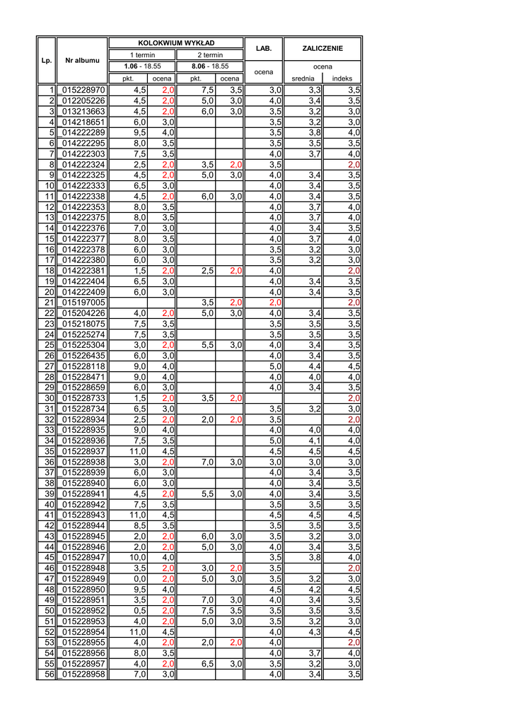 pkt. ocena pkt. ocena srednia indeks Lp. 2 termin ZALICZENIE