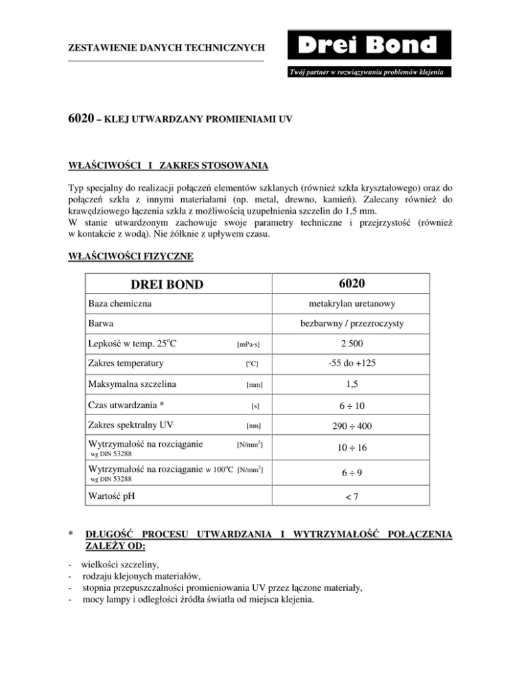 Drei Bond ZESTAWIENIE DANYCH TECHNICZNYCH ________________________________________________ Twój partner w rozwiązywaniu problemów klejenia 6020 – KLEJ UTWARDZANY PROMIENIAMI UV WŁAŚCIWOŚCI I ZAKRES STOSOWANIA Typ specjalny do realizacji połączeń elementów szklanych (również szkła kryształowego) oraz do połączeń szkła z innymi materiałami (np. metal, drewno, kamień). Zalecany również do krawędziowego łączenia szkła z możliwością uzupełnienia szczelin do 1,5 mm. W stanie utwardzonym zachowuje swoje parametry techniczne i przejrzystość (również w kontakcie z wodą). Nie żółknie z upływem czasu. WŁAŚCIWOŚCI FIZYCZNE 6020 DREI BOND Baza chemiczna metakrylan uretanowy Barwa Lepkość w temp. 25oC bezbarwny / przezroczysty [mPa·s] Zakres temperatury [oC] Maksymalna szczelina [mm] 1,5 [s] 6 ÷ 10 [nm] 290 ÷ 400 Czas utwardzania * Zakres spektralny UV Wytrzymałość na rozciąganie [N/mm2] wg DIN 53288 Wytrzymałość na rozciąganie w 100oC wg DIN 53288 Wartość pH * 2 500 [N/mm2] -55 do +125 10 ÷ 16 6÷9 <7 DŁUGOŚĆ PROCESU UTWARDZANIA I WYTRZYMAŁOŚĆ POŁĄCZENIA ZALEŻY OD: - wielkości szczeliny, - rodzaju klejonych materiałów, - stopnia przepuszczalności promieniowania UV przez łączone materiały, - mocy lampy i odległości źródła światła od miejsca klejenia. ZESTAWIENIE DANYCH TECHNICZNYCH Drei Bond _______________________________________________________ Twój partner w rozwiązywaniu problemów klejenia -strona 2- 6020 – KLEJ UTWARDZANY PROMIENIAMI UV SPOSÓB UŻYCIA • • • Powierzchnie klejone muszą być czyste, odtłuszczone i suche. Części należy łączyć bez docisku – do rozprowadzenia kleju między łączonymi częściami wystarczający jest ich ciężar. Po skorygowaniu pozycji łączonych elementów należy naświetlić miejsce klejenia źródłem światła UV o odpowiednim natężeniu i długości fali. Szczegółowe informacje o procesie klejenia zawarte są w „Instrukcji klejenia metodą UV” OKRES SKŁADOWANIA • • 6 miesięcy w temperaturze pokojowej. 12 miesięcy w chłodnym i suchym pomieszczeniu. ŚRODKI OSTROŻNOŚCI • Zawiera metakrylan. Może wywoływać podrażnienia błon śluzowych i skóry. Stosować w miejscach przewiewnych przez ekipy zawodowe wyposażone w odzież ochronną. W przypadku kontaktu z oczami należy przemyć je obficie wodą i zasięgnąć porady lekarza. Chronić przed dostępem dzieci. OPAKOWANIA • Butelki robocze • Opakowania przemysłowe 10 ml, 50 ml, 250ml 1ltr, 2ltr Firma DREI BOND oferuje urządzenia do kontrolowanej aplikacji klejów oraz promienniki światła UV. Wszystkie podane zalecenia i informacje są oparte na naszych własnych badaniach i jesteśmy przekonani, że są one wiarygodne. Nie możemy ręczyć za efekty zastosowania naszych produktów; produkty są sprzedawane, a próbki udostępniane bez gwarancji wyrażonej wprost czy też sugerującej, iż są przeznaczone do jakiegoś konkretnego zastosowania. Użytkownik powinien sam przeprowadzić testy potwierdzające przydatność produktu do własnych zastosowań. Żaden agent, przedstawiciel lub pracownik naszej firmy nie ma upoważnienia do zmiany tej klauzuli. Zapewniamy sobie możliwość zmiany treści wynikające z postępu technicznego. (05/2003)