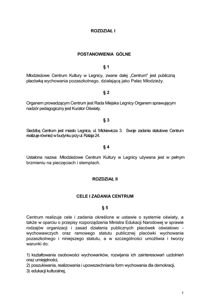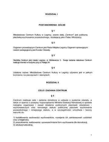ROZDZIAŁ I POSTANOWIENIA GÓLNE §1 Młodzieżowe Centrum Kultury w Legnicy, zwane dalej „Centrum" jest publiczną placówką wychowania pozaszkolnego, działającą jako Pałac Młodzieży. §2 Organem prowadzącym Centrum jest Rada Miejska Legnicy Organem sprawującym nadzór pedagogiczny jest Kurator Oświaty. §3 Siedzibą Centrum jest miasto Legnica, ul. Mickiewicza 3. Swoje zadania statutowe Centrum realizuje również w budynku przy ul. Rataja 24. §4 Ustalona nazwa: Młodzieżowe Centrum Kultury w Legnicy używana jest w pełnym brzmieniu na pieczęciach i stemplach. ROZDZIAŁ II CELE I ZADANIA CENTRUM §5 Centrum realizuje cele i zadania określone w ustawie o systemie oświaty, a także w oparciu o przepisy rozporządzenia Ministra Edukacji Narodowej w sprawie rodzajów organizacji i zasad działania publicznych placówek oświatowo wychowawczych oraz ramowego statutu publicznej placówki wychowania pozaszkolnego i niniejszego statutu, a w szczególności umożliwia i tworzy warunki do: 1) kształtowania osobowości wychowanków, rozwijania ich zainteresowań uzdolnień oraz umiejętności, 2) poszukiwania, realizowania i upowszechniania form wychowania dla demokracji, 3) edukacji kulturalnej, 1 4) pogłębiania i poszerzania wiedzy wychowanków z różnych dziedzin, szczególnie wykraczających poza programy szkolne, 5) prawidłowego rozwoju i podnoszenia sprawności fizycznej wychowanków, 6) integracji dzieci i młodzieży z różnych środowisk, w tym także niepełnosprawnych i zagrożonych patologią. 7) kształtowania wzorców i nawyków kulturalnego, pożytecznego i zdrowego spędzania wolnego czasu, 8) poznawania i kształtowania właściwego stosunku do środowiska naturalnego, 9) pozyskiwania i kształcenia animatorów kultury, organizatorów turystyki i kultury fizycznej, 10) inspirowania, prowadzenia wymiany i współpracy międzynarodowej dzieci i młodzieży, 11) dostępu do informacji z zakresu kształcenia, zdrowia, prawa, zdobywania zawodu, możliwości spędzania czasu wolnego oraz korzystania z poradnictwa pedagogiczno-psychologicznego. §6 Cele i zadania, o których mowa w § 5 Centrum realizuje m.in. poprzez : 1) bezpośrednią działalność dydaktyczno-wychowawczą z wychowankami, 2) otwarte imprezy i akcje, konkursy, zawody, festiwale, sesje, sejmiki itp., 3) inspirowanie i wspieranie struktur samorządowych młodzieży, 4) organizację wypoczynku śródrocznego i wakacyjnego - wycieczki, obozy, plenery, półkolonie, itp. 5) poradnictwo, szkolenia, kursy, seminaria i warsztaty, 6) prowadzenie biblioteki z czytelnią, 7) organizowanie wymiany doświadczeń i współpracy z pokrewnymi placówkami w kraju i za granicą 8) współpracę ze szkołami, placówkami kulturalnymi, naukowymi, sportowymi oraz samorządami, 9) działalność informatyczną i wydawniczą, 10) działalność gospodarczą mającą na celu pozyskiwanie funduszu na zasilenie zadań statutowych, 11) prowadzenie badań umożliwiających diagnozowanie potrzeb dzieci i młodzieży §7 Szczegółowe zadania Centrum określają perspektywiczne plany pracy zatwierdzane przez Radę Pedagogiczną. i roczne 2 ROZDZIAŁ III ORGANY CENTRUM §8 Organami Centrum są: 1) Dyrektor, 2) Rada Pedagogiczna. 3) Rada Rodziców, 4) samorząd wychowanków. §9 Pracą Centrum kieruje dyrektor, który jest kierownikiem dla zatrudnionych w nim pracowników. § 10 Dyrektor Centrum w szczególności: 1) zarządza placówką i reprezentuje ją na zewnątrz, 2) powierza stanowiska wicedyrektora i inne stanowiska kierownicze oraz odwołuje z nich po zasięgnięciu opinii organu prowadzącego oraz rady pedagogicznej, 3) zatrudnia i zwalnia nauczycieli i pracowników nie będących nauczycielami, zgodnie z odrębnymi przepisami, 4) jest kierownikiem zakładu pracy dla zatrudnionych nauczycieli i wszystkich innych pracowników, 5) odpowiada bezpośrednio za realizację planów pracy, organizację pracy rady pedagogicznej i właściwą organizację pracy Centrum, 6) opracowuje arkusz organizacji, 7) dokonuje oceny pracy nauczycieli, 8) decyduje w sprawach zatrudniania i zwalniania nauczycieli i innych pracowników, 9) dokonuje w ciągu roku drobnych przesunięć i zmian w ramach zatwierdzonego limitu etatów, 10) przyznaje nagrody, wyróżnienia oraz wymierza kary porządkowe nauczycielom i innym pracownikom, 11 ) występuje z wnioskami po zasięgnięciu opinii rady pedagogicznej w sprawie odznaczeń, nagród i innych wyróżnień dla wszystkich pracowników, 12) sprawuje nadzór pedagogiczny, 13) współpracuje z organami wewnętrznymi Centrum, związkami zawodowymi i innymi osobami prawnymi i fizycznymi, 14) wstrzymuje wykonanie uchwał rady pedagogicznej niezgodnych, z przepisami prawa, o czym niezwłocznie powiadamia organ prowadzący placówkę. 3 § 11 1. 2. 3. W Centrum działa Rada Pedagogiczna, która jest organem kolegialnym. Rada Pedagogiczna ustala szczegółowy regulamin swojej działalności. W skład Rady Pedagogicznej Centrum wchodzą wszyscy nauczyciele § 12 1. Do kompetencji stanowiących Rady Pedagogicznej należy : 1) zatwierdzanie rocznych programów : wychowawczego i profilaktycznego, planów pracy działów i rocznego kalendarza imprez. 2) podejmowanie uchwał w sprawie eksperymentów i innowacji pedagogicznych. 3) ustalanie organizacji doskonalenia zawodowego nauczycieli, 4) występowanie z wnioskiem do organu prowadzącego o odwołanie z funkcji dyrektora , wicedyrektora lub innego stanowiska kierowniczego, 5) wnoszenie zmian do statutu. 2. Rada Pedagogiczna opiniuje w szczególności : 1) organizację pracy Centrum, 2) projekt planu finansowego, 3) wnioski dyrektora o przyznanie nauczycielom odznaczeń, nagród i innych wyróżnień, 4) propozycje dyrektora w sprawie przydziału stałych prac i zajęć w ramach wynagrodzenia zasadniczego oraz dodatkowo płatnych zajęć dydaktycznych, opiekuńczych i wychowawczych, 5) inne zadania nie zastrzeżone do kompetencji stanowiących. § 13 1. Uchwa