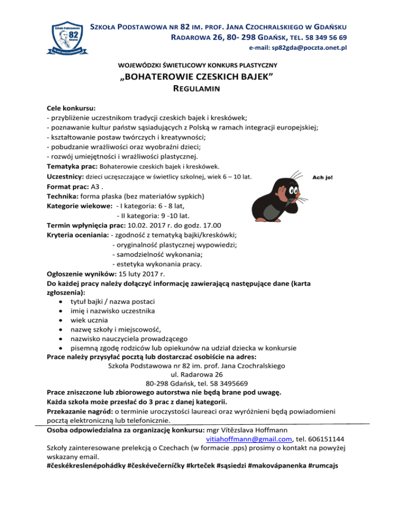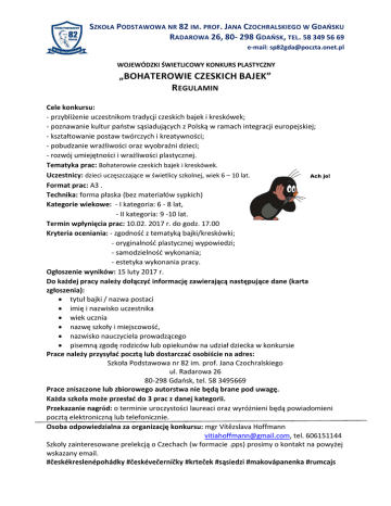 SZKOŁA PODSTAWOWA NR 82 IM. PROF. JANA CZOCHRALSKIEGO W GDAŃSKU RADAROWA 26, 80- 298 GDAŃSK, TEL. 58 349 56 69 e-mail: [email protected] WOJEWÓDZKI ŚWIETLICOWY KONKURS PLASTYCZNY „BOHATEROWIE CZESKICH BAJEK” REGULAMIN Cele konkursu: - przybliżenie uczestnikom tradycji czeskich bajek i kreskówek; - poznawanie kultur państw sąsiadujących z Polską w ramach integracji europejskiej; - kształtowanie postaw twórczych i kreatywności; - pobudzanie wrażliwości oraz wyobraźni dzieci; - rozwój umiejętności i wrażliwości plastycznej. Tematyka prac: Bohaterowie czeskich bajek i kreskówek. Uczestnicy: dzieci uczęszczające w świetlicy szkolnej, wiek 6 – 10 lat. Ach jo! Format prac: A3 . Technika: forma płaska (bez materiałów sypkich) Kategorie wiekowe: - I kategoria: 6 - 8 lat, - II kategoria: 9 -10 lat. Termin wpłynięcia prac: 10.02. 2017 r. do godz. 17.00 Kryteria oceniania: - zgodność z tematyką bajki/kreskówki; - oryginalność plastycznej wypowiedzi; - samodzielność wykonania; - estetyka wykonania pracy. Ogłoszenie wyników: 15 luty 2017 r. Do każdej pracy należy dołączyć informację zawierającą następujące dane (karta zgłoszenia): tytuł bajki / nazwa postaci imię i nazwisko uczestnika wiek ucznia nazwę szkoły i miejscowość, nazwisko nauczyciela prowadzącego pisemną zgodę rodziców lub opiekunów na udział dziecka w konkursie Prace należy przysyłać pocztą lub dostarczać osobiście na adres: Szkoła Podstawowa nr 82 im. prof. Jana Czochralskiego ul. Radarowa 26 80-298 Gdańsk, tel. 58 3495669 Prace zniszczone lub zbiorowego autorstwa nie będą brane pod uwagę. Każda szkoła może przesłać do 3 prac z danej kategorii. Przekazanie nagród: o terminie uroczystości laureaci oraz wyróżnieni będą powiadomieni pocztą elektroniczną lub telefonicznie. Osoba odpowiedzialna za organizację konkursu: mgr Vítězslava Hoffmann [email protected], tel. 606151144 Szkoły zainteresowane prelekcją o Czechach (w formacie .pps) prosimy o kontakt na powyżej wskazany email. #českékreslenépohádky #českévečerníčky #krteček #sąsiedzi #makovápanenka #rumcajs