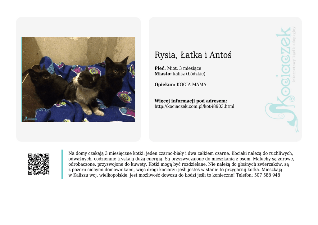 Rysia, Łatka i Antoś Płeć: Miot, 3 miesiące Miasto: kalisz (Łódzkie) Opiekun: KOCIA MAMA Więcej informacji pod adresem: http://kociaczek.com.pl/kot-i8903.html Na domy czekają 3 miesięczne kotki: jeden czarno-biały i dwa całkiem czarne. Kociaki należą do ruchliwych, odważnych, codziennie tryskają dużą energią. Są przyzwyczajone do mieszkania z psem. Maluchy są zdrowe, odrobaczone, przyswojone do kuwety. Kotki mogą być rozdzielane. Nie należą do głośnych zwierzaków, są z pozoru cichymi domownikami, więc drogi kociarzu jeśli jesteś w stanie to przygarnij kotka. Mieszkają w Kaliszu woj. wielkopolskie, jest możliwość dowozu do Łodzi jeśli to konieczne! Telefon: 507 588 948