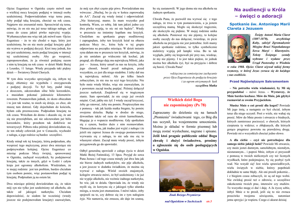 Ojciec Eugeniusz w Ognisku często mówił nam o wielkiej mocy krucjaty podjętej w intencji osoby uzależnionej. Podpowiedziałam więc temu panu, żeby podjął taką krucjatę, chociaż na rok czasu. Najpierw nie zrozumiał mnie. Sprzeciwiał się temu, mówiąc, że on nie ma już teraz takiego nałogu, od czasu do czasu jakieś piwko najwyżej wypije. Wytłumaczyłam mu więc tak jak mówił nam Ojciec Eugeniusz – że to nie chodzi o tego, który jest uzależniony, bo on nie może podjąć krucjaty gdyż nie wytrwa w podjętej decyzji. Ktoś inny jednak, kto nie jest uzależniony, może podjąć krucjatę w intencji tej uzależnionej osoby. Aby go wesprzeć, zaproponowałam, że ja również podejmę razem z nim tę krucjatę na rok czasu w dzień Matki Bożej z Lourdes, 11 lutego. Wtedy przypada taki piękny dzień — Światowy Dzień Chorych. W tym dniu wszystko sprzysięgło się, żebym tej mojej obietnicy nie wypełniła i zrezygnowała z podjętej decyzji. To był luty, padał śnieg z deszczem, odczuwałam silne bóle korzonków, a musiałam pokonać jedenaście kilometrów rowerem. Postanowiłam jednak, że skoro obiecałam i to jest tak ważne, to niech się dzieje, co chce, ale muszę tam dotrzeć. Gdy dojechałam do kościoła, byłam cała przemoczona. Podpisałam krucjatę na rok czasu. Wróciłam do domu i okazało się, że ani się nie przeziębiłam, ani nie odczuwałam już bólu korzonków, który przedtem tak dotkliwie mi towarzyszył. Półtora roku później dowiedziałam się, że ten młody człowiek jest w Cenacolo, wychodzi z nałogu, a jego rodzice są bardzo szczęśliwi. Kiedy minął rok tej krucjaty, którą podpisałam, aby wesprzeć tego mężczyznę, przez dwa miesiące nie podpisywałam kolejnej. Ojciec Eugeniusz co miesiąc podczas Mszy świętej, sprawowanej w Ognisku, zachęcał wszystkich, by podejmować krucjatę, także za innych, gdyż w Łodzi i całym kraju jest ogromny alkoholizm. Wiedziałam, że w mojej rodzinie jest ten problem, bardzo chciałam tym osobom pomóc, więc postanowiłam podjąć tę krucjatę. Podpisałam ją na osiem lat. Dwa miesiące później dowiedziałam się, że także mój syn nie tylko jest uzależniony od alkoholu, ale także od jakiegoś narkotyku. Chciałam dopowiedzieć, że siedem lat wcześniej (wtedy jeszcze nie podejmowałam krucjaty) zauważyłam, że mój syn zbyt często pije piwo. Powiedziałam mu wówczas: „Słuchaj, bo ja cię w końcu zaprowadzę do AA”. Zaczął się wtedy śmiać i odpowiedział: „Nie histeryzuj, mamo. Ja mam wszystko pod kontrolą. Wiem, co robię. Jak tam jakieś jedno czy dwa piwka wypiję, to nic mi nie będzie”. Wtedy w prezencie na imieniny kupiłam mu krzyżyk. Chodziłam na spotkania grupy modlitewnej i zapragnęłam, żeby ten krzyżyk leżał na ołtarzu podczas Mszy św., która była w tej grupie odprawiana na początku miesiąca. W dzień imienin syna dałam mu w prezencie ten krzyżyk, mówiąc, że ja nie umiałam go widocznie tak kochać, jak pragnął, ale dlatego daję mu największą Miłość, jaka jest — Jezusa, który umarł za nas na krzyżu, żeby jego chronił, bronił przed nałogiem, przed wszystkim, co jest dla niego niedobre. I żeby dał mu tę największą miłość. Ale po kilku latach zobaczyłam, że nie ma na szyi tego krzyżyka. Nie było mnie wtedy blisko, więc nie zauważyłam, że z powrotem zaczął trochę popijać. Później dołączył jeszcze narkotyk. Znajdował się w tragicznym stanie. Sam opowiadał, że nie czuje już swoich mięśni. Czuł, jakby nie żył. I wtedy zaczął krzyczeć, żeby go ratować, żeby mu pomóc. Pospieszyłam mu z pomocą – tak jak każda matka biegnie, by pomóc swojemu dziecku. Będąc w drodze do niego, dzwoniłam także od razu do sióstr karmelitanek, błagając je o wsparcie modlitewne. Gdy spotkałam się z synem, bardzo dużo z nim rozmawiałam. Tłumaczyłam mu, jak trudno jest wyjść z nałogu i że jeżeli nie zaprosi Jezusa do swojego postanowienia wyrwania się z nałogu, to nie uda mu się to własnymi siłami. Zaczął mnie wtedy prosić, żebym przygotowała go do spowiedzi. Odbył generalną spowiedź z całego życia w dzień Matki Bożej Fatimskiej, 13 lipca. Przyjął do serca Pana Jezusa i od tego czasu minęły już dwa lata jak nie bierze żadnych narkotyków, nie pije alkoholu, a jest jeszcze w dodatku świadkiem, że można się wyrwać z nałogu. Wśród swoich znajomych, kolegów otwarcie mówi, że był uzależniony i że już nie wypije alkoholu, nie weźmie żadnego narkotyku, bo wie, jak to działa. Opowiada im, że wtedy nie myśli się, że korzysta się z jakiegoś tylko ułamka mózgu, a reszta jest otumaniona. I mówi także, żeby spojrzeli na to, czy dobrze się im z tym nałogiem żyje. Nie namawia, nie zmusza, ale daje im szansę, by się zastanowili. W jego domu nie ma alkoholu na żadnym spotkaniu. Chwała Panu, że pozwolił mu wyrwać się z tego nałogu, że trwa w tym postanowieniu, a ja jestem szczęśliwą mamą. Mogło się skończyć tragicznie, ale skończyło się pięknie. W mojej rodzinie unika się alkoholu. Ponieważ my nie pijemy, to kolejne osoby zaczęły do nas dołączać, twierdząc, że picie alkoholu na przyjęciu nie jest potrzebne. Jeśli mamy jakieś spotkanie rodzinne, to tylko symbolicznie niektórzy wypiją pół lampki wina. Bo to tak wygląda, jakby się krępowali pić przy nas, wiedząc, że my nie pijemy. I to jest takie piękne, że jednak można bez alkoholu żyć, być na przyjęciu i dobrze się bawić. Chwała Panu! wdzięczna za comiesięczne zachęcanie przez Ojca Eugeniusza do podjęcia krucjaty i za ogrom otrzymanych łask szczęśliwa Matka Wielkich dzieł Boga nie zapominajmy (Ps 78) Zapraszamy do dzielenia się na łamach „Płomienia” świadectwami tego, co Bóg dla nas uczynił, ku wzajemnemu umocnieniu. Można je składać w formie pisemnej lub mogą zostać wysłuchane, nagrane i spisane. Jeśli 