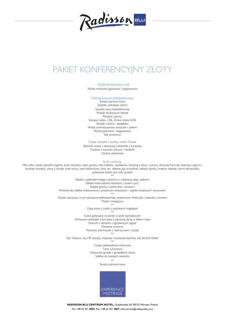 PAKIET KONFERENCYJNY ZŁOTY a Napój konferencyjny w sali Woda mineralna gazowana i niegazowana Przerwa kawowa przedpołudniowa Świeżo parzona kawa Saszetki czekolady instant Saszetki kawy bezkofeinowej Wybór smakowych herbat Plasterki cytryny Gorące mleko 1,5%, Zimne mleko 0,5% Wybór cukrów i słodzików Woda aromatyzowana owocami i ziołami Woda gazowana i niegazowana Sok owocowy Ciepły crossaint z szynką i serem Gouda Batoniki muesli z domowej cukierenki z żurawiną Cocktail z owoców leśnych i maślanki Owoce sezonowe Bufet lunchowy Miks sałat, rukola, plasterki ogórka, tarta marchew, seler, grzyby, miks kiełków, rzodkiewki, dressing z oliwy i cytryny, dressing francuski, dresing z jogurtu i kwaśnej śmietany, oliwa z oliwek, ocet winny, ocet balsamiczny, tarty ser, siekane jaja na twardo, siekana dymka, orzechy włoskie, ziarna słonecznika, grillowane kostki sera tofu, grzanki ** Sałatka z pełnoziarnistego makaronu z wędzoną rybą i selerem Sałatka kukurydziano-fasolowa z sosem curry Sałatka grecka z serem feta i oliwkami Wietnamska sałatka makaronowa z prażonymi orzeszkami i szybko smażonymi warzywami ** Wybór pieczywa, w tym pieczywo pełnoziarniste, orzechowe, chleb pita i bułeczki z ziarnami Masło i margaryna ** Zupa krem z cukinii z prażonymi migdałami ** Łosoś gotowany na parze w sosie szpinakowym Grillowane eskalopki z kurczaka z pieczoną dynią w lekkim sosie Gnocchi z semoliny z grzybowym ragout Pieczone warzywa Pieczone ziemniaczki z rozmarynem i rukolą ** Sos Tabasco, sos HP, keczup, majonez, musztarda dijońska, sos Sambal Oelek ** Ciasto czekoladowo-malinowe Tarta cytrynowa Gotowane gruszki z gwiazdkami anyżu Sałatka ze świeżych owoców ** Świeżo parzona kawa RADISSON BLU CENTRUM HOTEL, Grzybowska 24, 00132 Warsaw, Poland Tel: +48 22 321 8888, Fax: +48 22 321 8889, [email protected] Wybór smakowych herbat Woda niegazowana z lodem i cytryną Sok owocowy Przerwa kawowa popołudniowa Świeżo parzona kawa Saszetki czekolady instant Saszetki kawy bezkofeinowej Wybór smakowych herbat Plasterki cytryny Gorące mleko 1,5%, Zimne mleko 0,5% Wybór cukrów i słodzików Woda aromatyzowana owocami i ziołami Woda gazowana i niegazowana Sok owocowy Biały chleb z sałatką z kurczaka i awokado Wędzona polędwica, grillowana cukinia, krem z pieczonej papryki i sera kremowego w grillowanym chlebie pita Rosyjska sałatka z kawałkami kraba, jajkiem przepiórczym i majonezem cytrynowym Sernik pomarańczowy Plastry melona Klimatyzowana sala konferencyjna ze standardowym wyposażeniem: ekran, flipchart, notatniki z długopisami, cukierki miętowe Rzutnik multimedialny i nagłośnienie z 2 mikrofonami bezprzewodowymi Asysta technika podczas prac przygotowawczych przed spotkaniem Obsługa Meetings & Events Host 2 miejsca parkingowe dla Organizatorów (podczas trwania konferencji) PLN 255,- netto od osoby Minimum 20 osób MinOpcje wzbogacenia przerw kawowych Wybór aromatycznych kaw Napoje gazowane Świeżo wyciskany sok owocowy m20 PLN 10,- netto od osoby / 1 pozycja osób Nie ma możliwści zmian w obrębie pakietu. Cena pakietu obowiązuje przy ustawieniu sali w układzie teatralnym. W przypadku innego ustawienia, wymagającego większej sali – cena pakietu może ulec zmianie. RADISSON BLU CENTRUM HOTEL, Grzybowska 24, 00132 Warsaw, Poland Tel: +48 22 321 8888, Fax: +48 22 321 8889, [email protected]