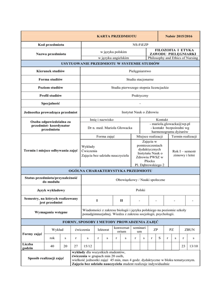 KARTA PRZEDMIOTU Nabór 2015/2016 NS-FiEZP Kod przedmiotu FILOZOFIA I ETYKA ZAWODU PIELĘGNIARKI Philosophy and Ethics of Nursing w języku polskim Nazwa przedmiotu w języku angielskim USYTUOWANIE PRZEDMIOTU W SYSTEMIE STUDIÓW Kierunek studiów Pielęgniarstwo Forma studiów Studia stacjonarne Poziom studiów Studia pierwszego stopnia licencjackie Profil studiów Praktyczny Specjalność - Jednostka prowadząca przedmiot Instytut Nauk o Zdrowiu Imię i nazwisko Osoba odpowiedzialna za przedmiot- koordynator przedmiotu Termin i miejsce odbywania zajęć Kontakt - [email protected] Dr n. med. Mariola Głowacka - kontakt bezpośredni wg harmonogramu dyżurów Forma zajęć Miejsce realizacji Termin realizacji Zajęcia w pomieszczeniach Wykłady dydaktycznych Ćwiczenia Rok I – semestr Instytutu Nauk o zimowy i letni Zajęcia bez udziału nauczyciela Zdrowiu PWSZ w Płocku Pl. Dąbrowskiego 2 OGÓLNA CHARAKTERYSTYKA PRZEDMIOTU Status przedmiotu/przynależność do modułu Obowiązkowy / Nauki społeczne Język wykładowy Polski Semestry, na których realizowany jest przedmiot I - II - - - Wiadomości z zakresu biologii i języka polskiego na poziomie szkoły ponadgimnazjalnej. Wiedza z zakresu socjologii, psychologii. Wymagania wstępne FORMY, SPOSOBY I METODY PROWADZENIA ZAJĘĆ Wykład ćwiczenia lektorat r Formy zajęć Liczba godzin rok s r s 40 20 27 15/12 Sposób realizacji zajęć s konwersat seminari orium um r s r s ZP r PZ S r ZBUN s r s 23 13/10 wykłady dla wszystkich studentów, ćwiczenia w grupach min 20 osób, wielkość jednostki zajęć 45 min, max 4 godz. dydaktyczne w bloku tematycznym. Zajęcia bez udziału nauczyciela student realizuje indywidualnie Sposób zaliczenia zajęć Metody dydaktyczne Przedmioty powiązane/moduł Zaliczenie z oceną po II semestrze – test jednokrotnego wyboru Wykłady - Zaliczenie po I i II semestrze Ćwiczenia - obecność na zajęciach i aktywny udział w ćwiczeniach prezentacja prac multimedialnych na określony temat, zgodnie z programem nauczania. Zaliczenie po I i II semestrze. Zajęcia bez udziału nauczyciela - zaliczenie prac pisemnych w wersji multimedialnej zleconych przez nauczyciela prowadzącego ćwiczenia, ocena po zakończeniu wykonanej pracy przez studenta Wykłady: Wykład informacyjny, Wykład problemowy, Dyskusja dydaktyczna. Ćwiczenia: Pogadanka Dyskusja dydaktyczna, Prezentacja pracy multimedialnej Zajęcia bez udziału nauczyciela: Studiowanie literatury, Prezentacja multimedialna, Przedmioty z zakresu modułów: Podstawy Opieki Pielęgniarskiej, Opieka Specjalistyczna 1. 2. 3. Pod-stawowa 4. 5. Wykaz literatury Uzupełniająca 1. 2. 3. 4. 5. Konstańczak S Etyka pielęgniarska 2010 Fry Sara T. Etyka w praktyce pielęgniarskiej, Warszawa 2009 Górajek-Jóźwik J.(red.), Filozofia i teorie pielęgniarstwa, Wyd. Czelej Lublin 2007 Hartman J., Wstęp do filozofii.PWN Warszawa 2005 Wrońska I., Mariański J.,(red.) Etyka w pracy pielęgniarskiej. Czelej Lublin 2002 Miguel Angel Monge Etyka w medycynie: ujęcie interdyscyplinarne 2012 Kołakowski L., Kultura i fetysz, PWN Warszawa 2010 Hartman J red. B. Banasiak Słownik filozofii 2009 Jedynak B, Jedynak S, Krusiński L Filozofia i wychowanie 2010 Jedynak S red., Kojkoja J Encyklopedia filozofii wychowania 2009 CELE, TREŚCI I EFEKTY KSZTAŁCENIA Cele przedmiotu (ogólne, szczegółowe) Student: zdobędzie wiedzę z zakresu głównych koncepcji filozoficzno-etycznych, dylematów etycznych współczesnej medycyny i pielęgniarstwa, pozna wartości, normy i zasady etyczne istotne w pracy pielęgniarki oraz wykorzysta w pracy własnej dokumenty deontologiczne regulujące wykonywanie zawodu pielęgniarki i udzielania świadczeń zdrowotnych. Student : C1. wyjaśni filozoficzne podstawy pielęgniarstwa i etyki tego zawodu, C2. zinterpretuje główne teorie filozoficzne i wyjaśni ich przydatność bądź sprzeczność z medycyną i etyką pielęgniarstwa, C3. dostrzega problemy i dylematy moralne w pracy pielęgniarki i podejmuje próby ich rozwiązania, C4. dba o rozwój moralny i kształtowanie sumienia, C5. podejmuje decyzje etyczne i ponosi za nieodpowiedzialność, C6. szanuje godność osoby ludzkiej w relacji z podopiecznym i jego rodziną. Treści programowe a efekty kształcenia Efekty kształcenia (kody) kierunkowe przedmiotowe K_B.W41 NS-FiEZP_W01 Forma zajęć W Temat W1-W6 Liczba godzin Suma liczby godzin 25 25 W K_B.W42 Ćw. W K_B.W43 W2-W5+W7+W9 23 C1-C5 20 NS-FiEZP_W02 NS-FiEZP_W03 Ćw. W3 – W12 Ć5 - Ć7 ZBUN 2. K_B.W44 NS-FiEZP_W04 NS-FiEZP_W05 ĆW. CW6-Cw7 7 W8 + W10 - W12 23 11 Ćw.7. 4 ZBUN zbun1+ zbun2 23 Ćw. W12. 3 C1 + Cw 4 8 W12. 3 Ćw. Ćw1 + Cw 4 8 NS-FiEZP_U01 Ćw. K_B.U28 NS-FiEZP_U02 W 65 10 24 W K_B.U27 11 W 5 -W12 W K_B.W45 44 W ZBUN zbun 1-zbun 2 43 54 38 11 11 K_B.U29 NS-FiEZP_U03 Ćw. C6 3 3 K_B.U30 NS-FiEZP_U04 Ćw. Ć4-C7 15 15 K_D.K01 NS-FiEZP_K_01 W Ćw. W K_D.K03 W Ćw. 5. W10+W12 13 4 6 Ć4-C7 W 11 +W12 8 2 NS-FiEZP_K_04 Ćw. NS-FiEZP_K_05 Ć 6-C7 W W12 Ćw. Ćw. 7 ZBUN Zbun 2 K_D.K08 9 14 W K_D.K07 W9 -W10+12 13 4 NS-FiEZP_K_03 Ćw. K_D.K05 Ćw. 7 9 NS-FiEZP_K_02 Ćw. K_D.K04 W2+W12 NS-FiEZP_K_06 W W10 Ćw. Ćw.7 ZBUN Zbun 2 12 7 3 4 17 10 3 4 10 17 Efekty kształcenia Efekty kształcenia przedmiotowe kody NS-FiEZP_W01 NS-FiEZP_W02 NS-FiEZP_W03 NS-FiEZP_W04 NS-FiEZP_W05 NS-FiEZP_U01 NS-FiEZP_U02 NS-FiEZP_U03 NS-FiEZP_U04 NS-FiEZP_K_01 NS-FiEZP_K_02 NS-FiEZP_K_03 NS-FiEZP_K_04 NS-FiEZP_K_05 NS-FiEZP_K_06 Odniesienie do efektów kształcenia Student, który zaliczył przedmiot zakresie WIEDZY różnicuje przedmiot etyki ogólnej i zawodowej posiada wiedzę z zakresu koncepcji filozoficzno - etycznych przydatnych w pielęgniarstwie (psychologiczno – pers nalistyczna, egzystencjalistyczna, personalistyc na kosmiczno – ewolucyjna, etyka niezależna T. Kotarbińskiego), charakteryzuje istotę podejmowania decyzji etycznych i rozwiązywania dylematów moralnych w pracy pielęgniark zna problematykę etyki normatywnej, w tym aksjolo