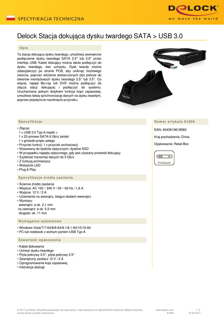 Delock Stacja dokująca dysku twardego SATA > USB 3.0 Opis Ta stacja dokująca dysku twardego, umożliwia zewnętrzne podłączenie dysku twardego SATA 2.5″ lub 3.5″ przez interfejs USB. Kabel dokujący można także podłączyć do dysku twardego, bez uchwytu. Dysk twardy można zabezpieczyć po stronie PCB, aby uniknąć możliwego zwarcia, poprzez włożenie dostarczonych płyt pokryw do otworów montażowych dysku twardego 2.5″ lub 3.5″. Co więcej, napęd Blu-ray lub DVD można podłączyć do złącza stacji dokującej i podłączyć do systemu. Uruchamiana jednym dotykiem funkcja kopii zapasowej, umożliwia łatwą synchronizację danych na dysku twardym, poprzez pojedyncze naciśnięcie przycisku. Specyfikacja • Złącze: 1 x USB 3.0 Typ-A męski > 1 x 22-pinowe SATA 6 Gb/s żeński 1 x gniazdo prądu sałego • Przycisk funkcji: 1 x przycisk archiwizacji • Stosowany do dysków optycznych, dysków SSD • W przypadku napędu optycznego, gdy jest używany przewód dokujący • Szybkość transmisji danych do 5 Gb/s • Z funkcją archiwizacji • Wskaźnik LED • Plug & Play Numer artykułu 61858 EAN: 4043619618583 Kraj pochodzenia: China Opakowanie: Retail Box Specyfikacje źródła zasilania • Ścienne źródło zasilania • Wejście: AC 100 ~ 240 V / 50 ~ 60 Hz / 1,6 A • Wyjście: 12 V / 2 A • Uziemienie na zewnątrz, biegun dodatni wewnątrz • Wymiary: wewnątrz: ø ok. 2,1 mm na zewnątrz: ø ok. 5,5 mm długość: ok. 11 mm Wymagania systemowe • Windows Vista/7/7-64/8/8-64/8.1/8.1-64/10/10-64 • PC lub notebook z wolnym portem USB Typ-A Zawartość opakowania • Kabel dokowania • Uchwyt dysku twardego • Płyta pokrywy 3.5″, płyta pokrywy 2.5″ • Zewnętrzny zasilacz 12 V / 2 A • Oprogramowanie kopi zapasowej • Instrukcja obsługi © 2017 by Delock. Wszelkie pojawiające się tutaj nazwy i znaki należą do ich odpowiednich właścicieli. Błędy drukarskie, zmiany & pomyłki zastrzeżone. www.delock.com 61858 1/2 07.03.2017 Zdjęcia © 2017 by Delock. Wszelkie pojawiające się tutaj nazwy i znaki należą do ich odpowiednich właścicieli. Błędy drukarskie, zmiany & pomyłki zastrzeżone. Powered by TCPDF (www.tcpdf.org) www.delock.com 61858 2/2 07.03.2017