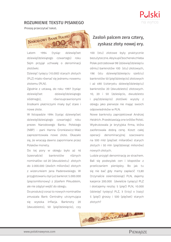 na wynos ROZUMIENIE TEKSTU PISANEGO Proszę przeczytać tekst. Zasłoń palcem zera cztery, zyskasz złoty nowej ery. Latem 1994 (tysiąc dziewięćdziesiątego dziewięćset roku bezużyteczne. Aby kupić bochenek chleba Sejm przyjął uchwałę o denominacji Polak potrzebował 98 (dziewięćdziesięciu złotówki. ośmiu) banknotów 100 (stu) złotowych, Dziesięć tysięcy (10.000) starych złotych 196 (PLZ) miało równać się jednemu nowemu banknotów 50 (pięćdziesięcio) złotowych złotemu (PLN). i aż 490 (czterystu dziewięćdziesięciu) Zgodnie z ustawą, do roku 1997 (tysiąc banknotów 20 (dwudziesto) złotowych. dziewięćset dziewięćdziesiątego 10, 20 i 50 (dziesięcio, dwudziesto siódmego), równouprawnionymi i pięćdziesięcio) złotówki wyszły z środkami płatniczymi miały być stare i obiegu jako pierwsze nie mając swoich nowe złote. odpowiedników w PLN. W listopadzie 1994 (tysiąc dziewięćset Nowe banknoty zaprojektował Andrzej dziewięćdziesiątego roku Heidrich. Przedstawiają one królów Polski. prezes Narodowego Banku Polskiego Wydrukowała je brytyjska firma, która (NBP) - pani Hanna Gronkiewicz-Walz zaoferowała dobrą cenę. Koszt całej zaprezentowała nowe złote. Okazało operacji się, że wracają dawno zapomniane przez na 500 mld (pięćset miliardów) starych Polaków monety. złotych i 50 mln (pięćdziesiąt milionów) Do tej pory w obiegu było aż 16 nowych złotych. (szesnaście) różnych Ludzie przyjęli denominację ze strachem. nominałów: od 20 (dwudziestu) złotych Bali się podwyżek cen i kłopotów z do 2.000.000 (dwóch milionów) złotych przeliczaniem z wizerunkiem Jana Paderewskiego. W się nie bać gdy mamy zapłacić 13,80 przygotowaniu był już banknot 5.000.000 (trzynaście osiemdziesiąt) PLN, dajemy (pięciomilionowy) z Józefem Piłsudskim, kasjerce 200.000 (dwieście tysięcy) PLZ ale nie zdążył wejść do obiegu. i dostajemy resztę: 5 (pięć) PLN, 10.000 Do produkcji coraz to nowych nominałów (dziesięć tysięcy) PLZ, 3 (trzy) x (razy) zmuszała Bank Centralny utrzymująca 5 (pięć) groszy i 500 (pięćset) starych się złotych? wysoka czwartego) 100 (stu) złotowe były praktycznie czwartego) banknotów inflacja. Banknoty 20 (stu dziewięćdziesięciu denominacyjnej sześciu) szacowano pieniędzy. Bo jak tu (dwudziesto), 50 (pięćdziesięcio), czy www.polskinawynos.com PIENIĄDZE na wynos SŁOWNICZEK • • • • • • • • • • • • • • • • • • • • • • • • • • • • • • • • • • • • • • • • • • • • • • • • bać się - to be afraid banknot - bill bezużyteczny - useless bochenek chleba - a loaf of bread cały - whole cena - price coraz - more dawać - to give dawno - long ago do tej pory - until now dobra cena - good price dostawać - to receive firma - company jako - as kasjerka - cashier kłopot - trouble koszt - cost król - king kupić - to buy lato - summer listopad - November ludzie - people moneta - coin nie mając - not having nie zdążyć - to not make it nominał - face value nowy - new obieg - circulation odpowiednik - equivalent okazało się - it turned out pieniądze - money pierwszy - first podwyżka - increase potrzebować - to need prezes - president przedstawiać - to present przeliczanie - conversion przyjąć - to accept przyjąć - to adopt reszta - rest rok - year równać się - be equal równouprawniony - an equal różny - different Sejm - Parliament środek płatniczy - legal tender means of payment stary - old strach - fear www.polskinawynos.com • • • • • • • • • • • • • • • • • • • • swój - its own szacować - to estimate uchwała - resolution ustawa - law utrzymywać się - to remain w przygotowaniu - in preparation wejść - to enter wizerunek - the image wracać - to return wydrukować - to print wyjść - to exit wysoki - high zaoferować - to offer zapłacić - to pay zapomniany - forgotten zaprezentować - to present zgodnie z - in accordance with złotówka - a one zloty coin (1 zł) złoty - zloty zmuszać - to force PRAWDA CZY NIEPRAWDA? P N 1. Sejm przyjął w Polsce uchwałę o denominacji złotówki w 94 roku. 2. Przed denominacją w obiegu było aż 20 banknotów. 3. Na nowych banknotach są królowie Polski. 4. 10.000 PLZ równa się 10 PLN. 5. Ludzie bali się denominacji. PIENIĄDZE