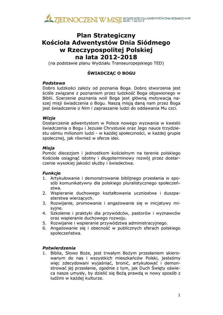 Plan Strategiczny Kościoła Adwentystów Dnia Siódmego w Rzeczypospolitej Polskiej na lata 2012-2018 (na podstawie planu Wydziału Transeuropejskiego TED) ŚWIADCZĄC O BOGU Podstawa Dobro ludzkości zależy od poznania Boga. Dobro stworzenia jest ściśle związane z poznaniem przez ludzkość Boga objawionego w Biblii. Szerzenie poznania woli Boga jest główną motywacją naszej misji świadczenia o Bogu. Naszą misją daną nam przez Boga jest świadczenie o Nim i zapraszanie ludzi do oddawania Mu czci. Wizja Dostarczenie adwentystom w Polsce nowego wyzwania w kwestii świadczenia o Bogu i Jezusie Chrystusie oraz Jego nauce trzydziestu ośmiu milionom ludzi - w każdej społeczności, w każdej grupie społecznej, jak również w sferze idei. Misja Pomóc diecezjom i jednostkom kościelnym na terenie polskiego Kościoła osiągnąć istotny i długoterminowy rozwój przez dostarczenie wysokiej jakości służby i świadectwa. Funkcje 1. Artykułowanie i demonstrowanie biblijnego przesłania w sposób komunikatywny dla polskiego pluralistycznego społeczeństwa. 2. Wspieranie duchowego kształtowania uczniostwa i duszpasterstwa wierzących. 3. Rozwijanie, promowanie i angażowanie się w inicjatywy misyjne. 4. Szkolenie i praktyki dla przywódców, pastorów i wyznawców oraz wspieranie duchowego rozwoju. 5. Rozwijanie i wspieranie przywództwa administracyjnego. 6. Angażowanie się i obecność w publicznych sferach polskiego społeczeństwa. Potwierdzenia 1. Biblia, Słowo Boże, jest trwałym Bożym przesłaniem skierowanym do nas i wszystkich mieszkańców Polski, jesteśmy więc zdecydowani wyjaśniać, bronić, artykułować i demonstrować jej przesłanie, zgodnie z tym, jak Duch Święty oświeca nasze umysły, by dzielić się Bożą prawdą w nowy sposób z ludźmi w każdej kulturze. 1 2. Każde adwentystyczne zgromadzenie (zbór) na terenie polskiego Kościoła, jest lokalnym wyrażeniem Ciała Chrystusowego, w ramach którego zbór jest jednocześnie społecznością nabożeństwa i świadectwa - zgromadzoną i rozproszoną, wezwaną i posłaną - by świadczyć o Bogu ponad trzydziestu ośmiu milionom ludzi mieszkających w Polsce, służąc jako proroczo zorientowana społeczność w czasie końca, aż do powtórnego przyjścia Jezusa. 3. Bóg w Chrystusie, jako Zwierzchnik Kościoła, umiłował, wybrał, powołał, zbawił uświęcił i zjednoczył nas, a w swej niepojętej miłości wzywa nas do jedności, równości, uczciwości i wzajemnej solidarności, w ramach których każdy jest traktowany z szacunkiem i godnością. Cele SIĘGAĆ W GÓRĘ - trwać w łączności z Bogiem, czcić Go i doświadczać przez studiowanie Biblii, modlitwę, szafarstwo i czytanie Ducha Proroctwa prowadzące do ożywienia duchowego i wierności. SIĘGAĆ NA ZEWNĄTRZ - do innych, jako przyjazny Kościół, który stawia na pierwszym miejscu misję Chrystusa, zapraszając wszystkich ludzi do wspólnoty i wnosząc swój codzienny wkład w życie społeczeństwa. SIĘGAĆ PONAD - ponad barierami grożącymi podziałom Bożej rodziny, by uczyć, wspierać duszpastersko i angażować każdego wyznawcę w życie i misję Kościoła. Zobowiązania 1. Przeciwdziałać biblijnemu „analfabetyzmowi” przez poszukiwanie nowych sposobów artykułowania i bronienia przesłania Biblii w ramach narastającej kultury podziału między sferą religijną a sferą świecką. 2. Rozwijać nowe sposoby wyrażania przesłania Biblii nakierowane na dzieci i nastolatków wystawionych na wpływ modernizmu w polskim społeczeństwie. 3. Wspierać studentów szkół wyższych w celu posługiwania się apologetyką jako integralną częścią zrozumienia Biblii, by pomagać osobom poszukującym prawdy i sceptykom znaleźć wiarę w Boga. 4. Przedstawiać przesłanie Biblii pluralistycznemu polskiemu społeczeństwu, w którym odradzają się dawne wierzenia i pojawiają nowe. 5. Kontynuować badanie polskiego społeczeństwa, w którym żyjemy, aby zrozumieć jego strukturę, wartości i potrzeby edukacyjne w celu rozwijania odpowiednich strategii misyjnych; dotyczy to nominalistów, tradycjonalistów, postmodernistów, agnostyków, ateistów itd. 6. Wyposażać wyznawców w niezbędne narzędzia do przekazywania biblijnej prawdy, na podstawie proroctw, w codziennych publicznych rozmowach celem angażowania się we wszystkie aspekty kultury, w jakiej żyjemy. 2 7. Badać i wspierać odpowiednie i innowacyjne wzorce służby, sprzyjające istnieniu zdrowych zborów cechujących się organicznym rozwojem, kierujących się na zewnątrz, organizujących się bardziej do misji niż nastawionych na przetrwanie, angażujących się w wydawanie świadectwa zamiast w zamknięte zajęcia zborowe oraz uczestniczących w ewangelizacji w sposób ciągły. 8. Wspierać rozwijający się ruch zakładania nowych zborów, by tworzyć więcej zgromadzeń w ciągłej reakcji łańcuchowej, w której każdy zbór uczestniczy w ewangelizacji. 9. Inicjować i wspierać działalność społeczną, demonstrującą widzialnie miłość Bożą - w słowie i czynie - przez troszczenie się o ludzi cierpiących wskutek niedostatku sprawiedliwości, godności, pożywienia i dachu nad głową. 10. Uznawać, że dzieci i młodzież wzbogacają nabożeństwa kościelne i ewangelizację swoim entuzjazmem i wiarą oraz zaangażować się w szkolenie ich w uczniostwie i ewangelizacji, aby mogli pozyskiwać swoich rówieśników dla Chrystusa. 11. Wspierać świadectwo wyznawców w głoszeniu dobrej nowiny zgodnie z zasadą „służby wszystkich wierzących”, a nie jedynie „kapłaństwa wszystkich wierzących”, nie tylko przez działania w zborze, ale także przez przyjaźń - w domu i w miejscu pracy. 12. Zrozumieć i rozwijać strategiczne znaczenie służby w miejscu pracy oraz mobilizować i szkolić wyznawców do życia, myślenia, mówienia i działania z misyjną efektywnością w ich sferze wpływu. 13. Odnowić krytyczne i kr