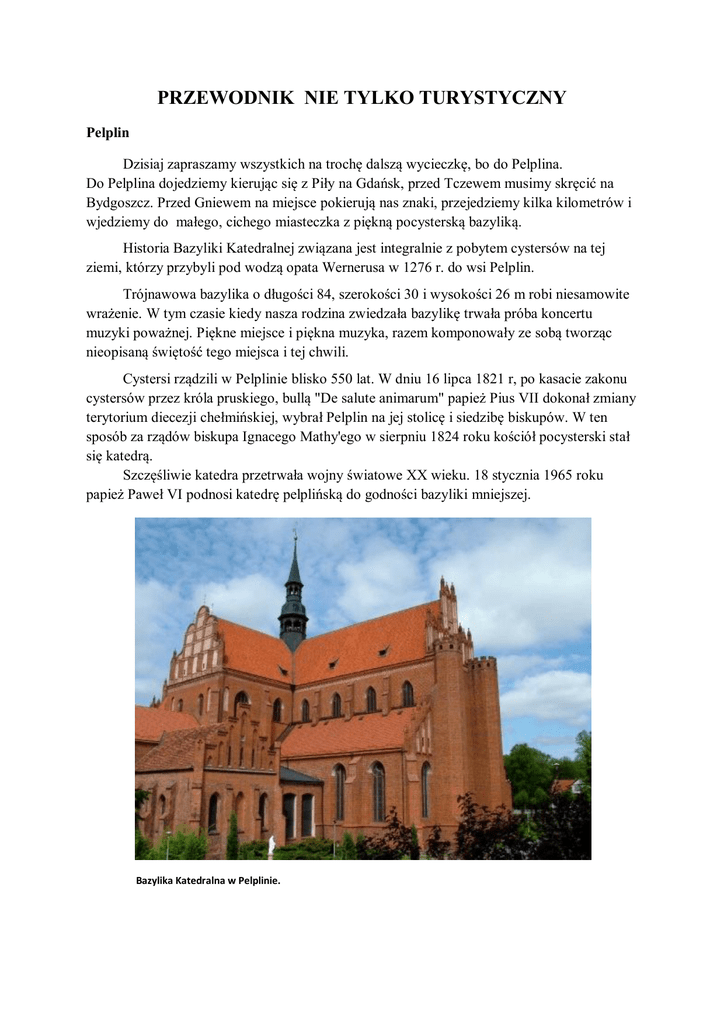 PRZEWODNIK NIE TYLKO TURYSTYCZNY Pelplin Dzisiaj zapraszamy wszystkich na trochę dalszą wycieczkę, bo do Pelplina. Do Pelplina dojedziemy kierując się z Piły na Gdańsk, przed Tczewem musimy skręcić na Bydgoszcz. Przed Gniewem na miejsce pokierują nas znaki, przejedziemy kilka kilometrów i wjedziemy do małego, cichego miasteczka z piękną pocysterską bazyliką. Historia Bazyliki Katedralnej związana jest integralnie z pobytem cystersów na tej ziemi, którzy przybyli pod wodzą opata Wernerusa w 1276 r. do wsi Pelplin. Trójnawowa bazylika o długości 84, szerokości 30 i wysokości 26 m robi niesamowite wrażenie. W tym czasie kiedy nasza rodzina zwiedzała bazylikę trwała próba koncertu muzyki poważnej. Piękne miejsce i piękna muzyka, razem komponowały ze sobą tworząc nieopisaną świętość tego miejsca i tej chwili. Cystersi rządzili w Pelplinie blisko 550 lat. W dniu 16 lipca 1821 r, po kasacie zakonu cystersów przez króla pruskiego, bullą "De salute animarum" papież Pius VII dokonał zmiany terytorium diecezji chełmińskiej, wybrał Pelplin na jej stolicę i siedzibę biskupów. W ten sposób za rządów biskupa Ignacego Mathy'ego w sierpniu 1824 roku kościół pocysterski stał się katedrą. Szczęśliwie katedra przetrwała wojny światowe XX wieku. 18 stycznia 1965 roku papież Paweł VI podnosi katedrę pelplińską do godności bazyliki mniejszej. Bazylika Katedralna w Pelplinie. Ołtarz główny w Bazylice Pelplińskiej p.w. Wniebowzięcia Najświętszej Maryi Panny. Nawa główna i prezbiterium bazyliki pelplińskiej. Ołtarz boczny w Bazylice Pelplińskiej. Wnętrze Bazyliki ma niesamowitą atmosferę, tylko czekać jak zza rogu wyjdą cystersi. 6 czerwca 1999 roku Bazylikę Katedralną w Pelplinie nawiedził Jego Świątobliwość Ojciec Święty Jan Paweł II. O godz. 9.30. odprawił Mszę Św. na wzniesieniu, zwanym Górą Biskupią. W liturgii uczestniczyło ponad 200 tys. wiernych z Pomorza, a w szczególności Kaszubów. Obecnie jest to miejsce modlitw w intencji Jana Pawła II, a góra została nazwana imieniem Ojca Świętego. Na tych wzgórzach Jan Paweł II odprawił w 1999 r. Mszę Świętą. Kilka słów o Biblii 6 czerwca 1999 r. (niedziela) Fragment homilii Jana Pawła II wygłoszonej w Pelplinie Błogosławieni ci, którzy słuchają słowa Bożego i zachowują je. (Łk 11,28) Te słowa Chrystusa od dnia zesłania Ducha Świętego Kościół przechowuje jako najcenniejszy skarb. Zapisane na kartach Ewangelii przetrwały do naszych czasów. Dziś na nas spoczywa odpowiedzialność za to, aby zostały przekazane przyszłym pokoleniom nie jako martwa litera, ale jako żywe źródło poznania prawdy o Bogu i o człowieku – źródło prawdziwej mądrości. W tym kontekście szczególnej aktualności nabiera soborowa zachęta, skierowana do wszystkich wiernych, by przez częste czytanie Pisma świętego nabywali „wzniosłego poznania Jezusa Chrystusa” (Flp 3, 8). „Nieznajomość Pisma świętego jest nieznajomością Chrystusa”(Św. Hieronim)(Dei Verbum 25). Dlatego, kiedy podczas liturgii biorę do rąk księgę Ewangelii i na znak błogosławieństwa wznoszę ją nad zgromadzeniem i nad całym Kościołem, czynię to z nadzieją, że nadal będzie ona Księgą życia każdego wierzącego, każdej rodziny i całych społeczeństw. Dziś z tą samą nadzieją proszę was: wchodźcie w nowe tysiąclecie z księgą Ewangelii! Niech nie zabraknie jej w żadnym polskim domu! Czytajcie i medytujcie! Pozwólcie, by Chrystus mówił! Obyście usłyszeli dzisiaj głos Jego: „Nie zatwardzajcie serc waszych…”(Ps 95/94/, 7-8). Biblia Gutenberga Biblia Gutenberga - Muzeum Diecezjalne w Pelplinie Do naszych czasów przetrwało 48 egzemplarzy (36 na papierze, 12 na pergaminie) tej najcenniejszej książki świata, z czego tylko 20 kompletnych. Najwięcej w Niemczech – 12, w USA – 11, w Wielkiej Brytanii – 8, we Francji – 4, po 2 w Watykanie, Hiszpanii i Rosji, po jednym w Austrii, Danii, Portugalii, Belgii, Szwajcarii i Japonii. Swój egzemplarz ma również Polska. Dwutomową wersję na papierze, mającą oryginalną XV-wieczną oprawę (wykonaną przez słynnego introligatora, mistrza Henryka Costera z Lubeki), można oglądać w Muzeum Diecezjalnym w Pelplinie. Całość obejmuje łącznie w dwóch tomach 641 kart in folio zadrukowanych obustronnie w dwóch kolumnach o wymiarach 285 mm x 85 mm, zawierających 40-42 wierszy. Na stronie 46 znajduje się plama tuszu, która czyni pelpińską Biblię najcenniejszą książką świata. Na marginesie, pod lewą szpaltą, na 46 stronie I tomu tego dzieła, w postaci plamy o wymiarach 25x7 mm, szczęśliwie zachowana plamka stanowi odbicie kształtu czcionki, która zapewne wypadła w trakcie pracy z rąk zecera. Ślad ten umożliwia współczesnemu badaczowi rekonstrukcję czcionki Gutenberga, co dla historyków drukarstwa ma nieocenione znaczenie. Lament nie czytanej Biblii Stoję na najwyższej półce twojej domowej biblioteki, wciśnięta między stare, pożółkłe, od wielu lat nie tknięte tomy encyklopedii Orgelbranda, do których jestem podobna formatem i objętością. I tak stojąc od wielu lat nie dostrzeżona, nieomal niewidzialna, spokojnie medytuję nad moim niewesołym losem. Tematem moich najczęstszych medytacji jest pytanie: po co kupiłeś mnie, człowieku, po co zapłaciłeś za mnie trzysta złotych, po co dźwigałeś mnie w teczce przez miasto i po co mnie przyniosłeś do domu? Po co? Czy po to, aby przerzucić kilka moich stronic, przeczytać pobieżnie na chybił trafił kilka wybranych wersetów, spojrzeć na mnie z bogobojnym drżeniem i odstawić nabożnie na najgórniejszą półkę w księgozbiorze? Pamiętam, jak raz podczas przyjęcia w twoim domu, ktoś w towarzyskiej rozmowie błędnie zacytował słowa Chrystusa, ktoś inny je sprostował, a gdy wybuchła między rozmówcami sprzeczka, który z cytatów jest właściwy, jeden z adwersarzy p