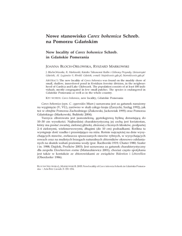 Nowe stanowisko Carex bohemica Schreb. na Pomorzu Gdañskim New locality of Carex bohemica Schreb. in Gdañskie Pomerania JOANNA BLOCH-OR£OWSKA, RYSZARD MARKOWSKI J. Bloch-Or³owska, R. Markowski, Katedra Taksonomii Rolin i Ochrony Przyrody, Uniwersytet Gdañski, Al. Legionów 9, 80-441 Gdañsk, e-mail: [email protected], [email protected] ABSTRACT: The new locality of Carex bohemica was found on the muddy shore of small, shallow, inner-forest pond in Kwidzyn forestry division, in the neigbourhood of Gardeja and Lake G³êboczek. The population consists of at least 100 individuals, mostly congragated in few small patches. The species is endangered in Gdañskie Pomerania as well as in the whole country. KEY WORDS: Carex bohemica, new locality, Gdañskie Pomerania Carex bohemica (syn. C. cyperoides Murr.) uznawana jest za gatunek nara¿ony na wyginiêcie (V, VU), zarówno w skali ca³ego kraju (Zarzycki, Szel¹g 1992), jak te¿ w obrêbie Pomorza Zachodniego (¯ukowski, Jackowiak 1995) oraz Pomorza Gdañskiego (Markowski, Buliñski 2004). Turzyca ciborowata jest jasnozielon¹, gêstokêpow¹ bylin¹ dorastaj¹c¹ do 10–30 cm wysokoœci. Najbardziej charakterystyczn¹ jej cech¹ jest kwiatostan, który ma postaæ zwartej, zielonej g³ówki, z³o¿onej z licznych k³osków, podpartej 2–4 zielonymi, wielonerwowymi, d³ugimi (do 10 cm) podsadkami. Roœlina ta wystêpuje doœæ rzadko i przemijaj¹co na ni¿u. Roœnie najczêœciej na dnie wysychaj¹cych stawów, zw³aszcza spuszczanych stawów rybnych, w wysychaj¹cych rowach oraz na mulistych brzegach naturalnych zbiorników okresowo ods³anianych na skutek wahañ poziomu wody (por. Raciborski 1919; Chater 1980; Szafer i in. 1988; Dajdok, Proæków 2003). Jest uznawana za gatunek charakterystyczny dla zespo³u Eleocharetum ovatae (Matuszkiewicz 2001), chocia¿ czêsto spotykana jest tak¿e w kontakcie ze zbiorowiskami ze zwi¹zków Bidention i Littorellion (Oberdorfer 1986). BLOCH-OR£OWSKA J., MARKOWSKI R. 2005. New locality of Carex bohemica Schreb. in Gdañskie Pomerania. Acta Bot. Cassub. 5: 151154. 152 Joanna Bloch-Or³owska, Ryszard Markowski Carex bohemica jest gatunkiem o zasiêgu eurazjatyckim (Oberdorfer 1986; Hultén, Fries 1986). W europejskiej czêœci area³u jej stanowiska koncentruj¹ siê w Europie Œrodkowej, przede wszystkim w œrodkowych i po³udniowych Niemczech, w Czechach oraz w zachodniej czêœci Polski (por. Meusel i in. 1965a, b). Znana jest równie¿ z pojedynczych stanowisk w Danii, po³udniowej Finlandii, Francji oraz Portugalii. Poza Europ¹ podawana jest ona z obszarów Kaukazu, Syberii, Azji Centralnej, Mand¿urii i Japonii (Chater 1980). W Polsce stanowiska turzycy ciborowatej koncentruj¹ siê w zachodniej, po³udniowo-zachodniej oraz pó³nocnej czêœci kraju (por. Zaj¹c, Zaj¹c 2001), jednak ich wystêpowanie w du¿ej mierze nie zosta³o potwierdzone po roku 1945 (Popiela 1999). Na terenie Pomorza Gdañskiego turzyca ciborowata jest roœlin¹ rzadko spotykan¹. Podawana by³a do tej pory z 9 stanowisk (kwadratów ATPOL o boku 10 km) (Popiela 1999; Zaj¹c, Zaj¹c 2001). Znajduj¹ siê one, poza jednym wyj¹tkiem, w zachodniej czêœci regionu. W jego wschodnich partiach gatunek ten notowany by³ po raz pierwszy w XIX wieku w jednym miejscu w okolicach Sztumu – stanowisko opisywane jako „Pienoggasee b. Portschweiten” (Klinggraeff 1854; Abromeit i in. 1898-1940), w obrêbie kwadratu ATPOL DB43. Znanych jest ponadto kilkanaœcie stanowisk z obszaru na wschód od Wis³y, g³ównie z Pojezierza Che³miñskiego, I³awskiego i Olsztyñskiego, jednak wiêkszoœæ z nich nie zosta³a potwierdzona po 1945 roku (por. Popiela 1999). Nowe stanowisko Carex bohemica stwierdzono w trakcie badañ terenowych prowadzonych w lipcu 2003 roku, w lasach na terenie nadleœnictwa Kwidzyn, w leœnictwie Kr¹¿kowo, w oddz. 187c. Znajduje siê ono w odleg³oœci oko³o 5,5 km na SWW od miejscowoœci Gardeja i ok. 0,7 km na SW od jeziora G³êboczek Ryc. 1. Lokalizacja stanowiska Carex bohemica 1 stanowisko, 2 lasy, 3 wody, 4 granica województwa pomorskiego Fig. 1. The locality of Carex bohemica 1 locality, 2 forests, 3 waters, 4 border of pomorskie voivodship Nowe stanowisko Carex bohemica Schreb. na Pomorzu Gdañskim 153 (ryc. 1). Stanowisko to znajduje siê w obrêbie kwadratu ATPOL DB72, w bliskim s¹siedztwie arbitralnie przyjêtej po³udniowej granicy Pomorza Gdañskiego. Jednoczeœnie mo¿na je zaliczyæ do skupienia placówek tego gatunku, podawanych dawniej z nad dolnej Wis³y (por. Popiela 1999). Nowo stwierdzone stanowisko Carex bohemica wystêpuje na po³udniowozachodnim, mulistym brzegu niewielkiego i p³ytkiego zbiornika œródleœnego. Gatunek reprezentowany jest tu przez doœæ liczn¹ populacjê, wielkoœci co najmniej 100 osobników, wystêpuj¹c¹ w niewielu p³atach o wielkoœci kilku m oraz w formie rozproszonych okazów. Nie tworzy tutaj w³asnego zespo³u, lecz wystêpuje w towarzystwie roœlin przewodnich dla ró¿nych zbiorowisk, g³ównie z klas: Bidentetea (np. Bidens cernua, Ranunculus sceleratus, Polygonum hydropiper), Isoëto-Nanojuncetea (np. Gnaphalium uliginosum), Phragmitetea (np. Galium palustre, Iris pseudacorus, Phalaris arundinacea, Poa palustris) i innych (Myosoton aquaticum, Rorippa sylvestris, Rumex maritimus). W zwi¹zku z planowanym w³¹czeniem wymienionego zbiornika w tworzony lokalny system ma³ej retencji i podniesieniem lustra wody obecne miejsce wystêpowania Carex bohemica przypuszczalnie zaniknie. Jest jednak du¿a szansa na przetrwanie tego gatunku w najbli¿szej okolicy w innych miejscach na obrze¿ach tego lub podobnych zbiorników, gdzie tworz¹ siê dogodne dla niego siedliska o zmiennym re¿imie wodnym. Literatura ABROMEIT J., NEUHOFF W., STEFFEN H. 1898-1940. Flora von Ost- und Westpreussen.: 1/1-25 (1898): 1402, 2/26-43 (1903): 403684, 3/44-49 (1926): 685780, 4/50-52 (1931): 781828, 5/53-55 (1934): 829876, 6/56-78 (1940): 8771248. Kommissionsverlag Gräfe und Unz