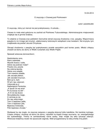 Pobrano z portalu Mapa Kultury 10.04.2014 O zwyczaju z Cisowej pod Piotrkowem ____________________________ autor: paweldudek O zwyczaju, który już niemal nie jest praktykowany. A szkoda... Cisowa to mała wieś położona na zachód od Piotrkowa Trybunalskiego. Administracyjnie miejscowość znajduje się w gminie Grabica. To właśnie w Cisowej oraz pobliskim Gomulinie istniał zwyczaj chodzenia z tzw. pasyjką. Wspomniana pasyjka to nic innego jak krzyżyk, udekorowany kolorowymi wstążkami oraz kwiatami. Na krzyżyku tym znajdowała się postać Jezusa Chrystusa. Obrzęd chodzenia z pasyjką był praktykowany przede wszystkim pod koniec postu. Młodzi chłopcy chodzili od domu do domu w Wielki Czwartek oraz Wielki Piątek. Śpiewali wówczas domownikom: Niedziołecka rano, Rano zaświtała. Wyszła dusza z ciała, Gdzie się podziać miała? Poszła ona, poszła Na zieloną łączkę, Gdzie ona usiadła Tam trawisia zbladła. Jak zaczęła płakać, Jak zaczęła krzyczyć, Było ją to, było W tym raju usłyszeć. Usłyszała ją ci Najświętsza Panienka. „A spuść że się anioł Po tę duszę na dół” „A im że się duszo Skrzydełeczka mego, A zaniosę ja cię Do raju wiecznego. Tam ci będziesz jadła, Tam ci będziesz piła, Będziesz królowała, Póki będziesz chciała.” Wydawać by się mogło, że zwyczaj związany z pasyjką dotyczył tylko katolików. Nic bardziej mylnego. Często chłopcy, chodząc od domu do domu, natrafiali na kogoś innego wyznania, np. ewangelickiego lub żydowskiego. Tereny te zamieszkiwały różne osoby, więc mogła się taka sytuacja zdarzyć. Wówczas kolędnicy wcale nie opuszczali zagrody. Mieli przygotowaną na taką chwilę inną pieśń. strona 1 / 2 Pobrano z portalu Mapa Kultury Trzech kapłanowi w stodole młócili, Kurek z kukozicą do młyna wozili, Gąsior biały w piecu palił, Gęś siadła, to z pieca wymiata, Kaczka dzika, chleb do pieca wmyka, Wół rogaty popycha łopaty. Kolejne teksty pieśni także były czysto świeckie. Jedzie Dziewic, jedzie W sto koni przez miedzę. Dziewicowe nogi Dziewicowe nogi, Już nie będą przeskakiwać Przez te ludzkie progi. Dziewicowe ręce Dziewiceo ręce, Już nie będą wywijały Szablom na wojence. Dziewicowe zęby Dziewicowe zęby, Już nie będą wygryzały Kurczątek z grzędy. Dziewicowe gardło Dziewicowe gardło, Już nie będzie wypijało Kieliszeczka darmo. Dziewicowe oczy Dziewicowe oczy, Już nie będą wyglądąły Skąd się wojsko toczy. Kolędników oczywiście trzeba było obdarować. Jeśli jednak gospodarz okazał się skąpy, i na to była przyśpiewka. Oj dziękujemy za te dary, Coście nam tu nic nie dali. Żebyście się za to Do piekła dostali. Oj, dziękujemy za te dary, Coście nam tu nic nie dali. Konkurs strona 2 / 2