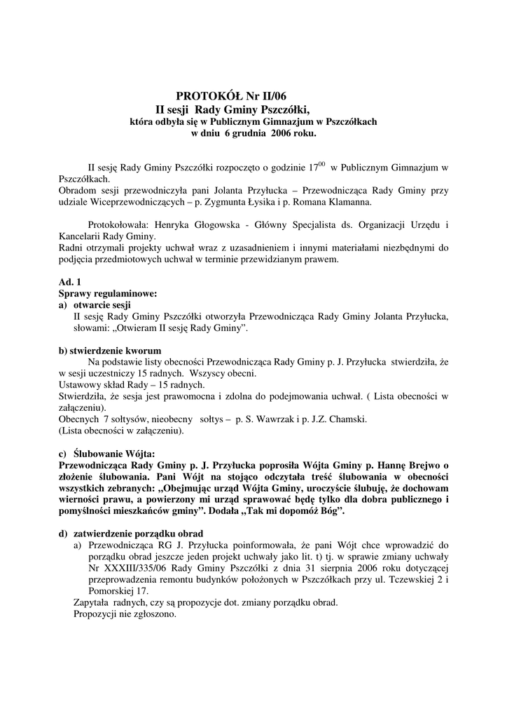 PROTOKÓŁ Nr II/06 II sesji Rady Gminy Pszczółki, która odbyła się w Publicznym Gimnazjum w Pszczółkach w dniu 6 grudnia 2006 roku. II sesję Rady Gminy Pszczółki rozpoczęto o godzinie 1700 w Publicznym Gimnazjum w Pszczółkach. Obradom sesji przewodniczyła pani Jolanta Przyłucka – Przewodnicząca Rady Gminy przy udziale Wiceprzewodniczących – p. Zygmunta Łysika i p. Romana Klamanna. Protokołowała: Henryka Głogowska - Główny Specjalista ds. Organizacji Urzędu i Kancelarii Rady Gminy. Radni otrzymali projekty uchwał wraz z uzasadnieniem i innymi materiałami niezbędnymi do podjęcia przedmiotowych uchwał w terminie przewidzianym prawem. Ad. 1 Sprawy regulaminowe: a) otwarcie sesji II sesję Rady Gminy Pszczółki otworzyła Przewodnicząca Rady Gminy Jolanta Przyłucka, słowami: „Otwieram II sesję Rady Gminy”. b) stwierdzenie kworum Na podstawie listy obecności Przewodnicząca Rady Gminy p. J. Przyłucka stwierdziła, że w sesji uczestniczy 15 radnych. Wszyscy obecni. Ustawowy skład Rady – 15 radnych. Stwierdziła, że sesja jest prawomocna i zdolna do podejmowania uchwał. ( Lista obecności w załączeniu). Obecnych 7 sołtysów, nieobecny sołtys – p. S. Wawrzak i p. J.Z. Chamski. (Lista obecności w załączeniu). c) Ślubowanie Wójta: Przewodnicząca Rady Gminy p. J. Przyłucka poprosiła Wójta Gminy p. Hannę Brejwo o złożenie ślubowania. Pani Wójt na stojąco odczytała treść ślubowania w obecności wszystkich zebranych: „Obejmując urząd Wójta Gminy, uroczyście ślubuję, że dochowam wierności prawu, a powierzony mi urząd sprawować będę tylko dla dobra publicznego i pomyślności mieszkańców gminy”. Dodała „Tak mi dopomóż Bóg”. d) zatwierdzenie porządku obrad a) Przewodnicząca RG J. Przyłucka poinformowała, że pani Wójt chce wprowadzić do porządku obrad jeszcze jeden projekt uchwały jako lit. t) tj. w sprawie zmiany uchwały Nr XXXIII/335/06 Rady Gminy Pszczółki z dnia 31 sierpnia 2006 roku dotyczącej przeprowadzenia remontu budynków położonych w Pszczółkach przy ul. Tczewskiej 2 i Pomorskiej 17. Zapytała radnych, czy są propozycje dot. zmiany porządku obrad. Propozycji nie zgłoszono. 2 Przew. RG J. Przyłucka zarządziła głosowanie nad wprowadzeniem jeszcze jednego projektu uchwały do porządku obrad. Wynik głosowania: za – 15 radnych. Przewod. RG J. Przyłucka zarządziła głosowanie nad przyjęciem proponowanego porządku obrad. Obecnych – 15 radnych. Wynik głosowania: za – 15, przeciw i wstrzymujących się nie było. Rada Gminy zatwierdziła zaproponowany porządek obrad. Porządek obrad II sesji Rady Gminy Pszczółki przedstawiał się następująco: 1. Sprawy regulaminowe: a) otwarcie sesji, b) stwierdzenie kworum, c) ślubowanie Wójta Gminy Pszczółki, d) zatwierdzenie porządku obrad, e) przyjęcie protokołu I sesji, f) interpelacje i zapytania radnych oraz zapytania sołtysów, g) odpowiedzi na interpelacje i zapytania. 2. Rozpatrzenie projektów i podjęcie następujących uchwał: a) W sprawie zatwierdzenia wyboru Zastępcy Przewodniczącego Komisji Rewizyjnej Rady Gminy Pszczółki – referuje Przewodnicząca Rady p. J. Przyłucka. b) W sprawie zatwierdzenia wyboru Przewodniczącego Komisji Gospodarczej i Rozwoju Gminy Rady Gminy Pszczółki - referuje Przewodnicząca Rady p. J. Przyłucka. c) W sprawie zatwierdzenia wyboru Przewodniczącego Komisji Oświaty, Zdrowia, Opieki Społecznej Kultury i Sportu Rady Gminy Pszczółki - referuje Przewodnicząca Rady p. J. Przyłucka. d) W sprawie upoważnienia Przewodniczącego Rady Gminy do wykonywania czynności z zakresu prawa pracy wobec Wójta Gminy. referuje Przewodnicząca Rady p. J. Przyłucka. e) W sprawie powołania Komisji Inwentaryzacyjnej ds. nabycia mienia komunalnego w Gminie Pszczółki - referuje Wójt Gminy p. H. Brejwo. f) W sprawie zmiany budżetu Gminy Pszczółki na 2006 rok – referuje Skarbnik Gminy J. Żbikowska. g) W sprawie określenia wysokości podatku od nieruchomości na terenie gminy Pszczółki na 2007 rok – referuje Wójt Gminy p. H. Brejwo. h) W sprawie określenia wysokości stawek podatku od środków transportowych na terenie Gminy Pszczółki na rok 2007 – referuje Wójt Gminy p. H. Brejwo. 3 i) W sprawie określenia wysokości stawki podatku od posiadania psów na terenie Gminy Pszczółki w roku 2007 – referuje Wójt Gminy H. Brejwo. j) W sprawie określenia średniej ceny skupu żyta dla celów podatku rolnego na obszarze gminy Pszczółki na 2007 rok – referuje Wójt Gminy p. H. Brejwo. k) W sprawie ustalenia wysokości opłat za wodę pobraną z wiejskich urządzeń wodociągowych i za wprowadzanie ścieków do wiejskich urządzeń kanalizacyjnych – referuje Wójt Gminy p. H. Brejwo. l) W sprawie zmiany uchwały Nr XXXIII/330/06 z dnia 31 sierpnia 2006 roku w sprawie udzielenia Parafii Rzymskokatolickiej p.w. Świętego Wawrzyńca dotacji celowej na prace restauratorskie przy zabytku wpisanym do rejestru zabytków - referuje Wójt Gminy p. H. Brejwo. m) W sprawie uchwalenia Gminnego Programu Profilaktyki i Rozwiązywania Problemów Alkoholowych na rok 2007 – referuje Wójt Gminy p. H. Brejwo. n) W sprawie uchwalenia Gminnego Programu Przeciwdziałania Narkomanii na rok 2007 – referuje Wójt Gminy H. Brejwo. o) W sprawie sprzedaży w formie bezprzetargowej niezabudowanej działki nr 571/5 położonej w miejscowości Pszczółki z przeznaczeniem na poszerzenie siedliska – referuje Wójt Gminy H. Brejwo. p) W sprawie nabycia działki nr 167/1 położonej w Pszczółkach przez Gminę Pszczółki – referuje Wójt Gminy p. H. Brejwo. q) W sprawie nadania nazwy ulicy w Pszczółkach (działki nr 501/3 i drodze wewnętrznej) – referuje Wójt Gminy p. H. Brejwo. r) W sprawie przyjęcia Gminnego Programu Opieki nad Zabytkami na lata 2006-2010 – referuje Wójt Gminy p. H. Brejwo. s) W sprawie uchwalenia miejscowego planu zagospodarowania przestrzennego fragmentu