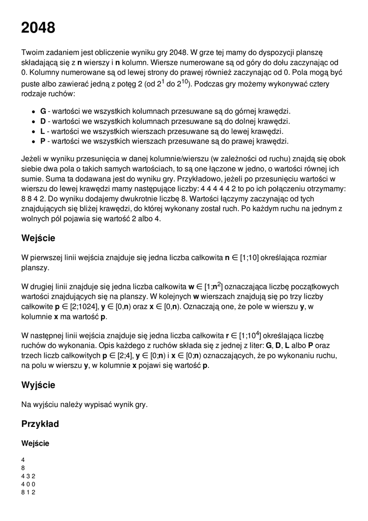 2048 Twoim zadaniem jest obliczenie wyniku gry 2048. W grze tej mamy do dyspozycji planszę składającą się z n wierszy i n kolumn. Wiersze numerowane są od góry do dołu zaczynając od 0. Kolumny numerowane są od lewej strony do prawej również zaczynając od 0. Pola mogą być puste albo zawierać jedną z potęg 2 (od 21 do 210). Podczas gry możemy wykonywać cztery rodzaje ruchów: G - wartości we wszystkich kolumnach przesuwane są do górnej krawędzi. D - wartości we wszystkich kolumnach przesuwane są do dolnej krawędzi. L - wartości we wszystkich wierszach przesuwane są do lewej krawędzi. P - wartości we wszystkich wierszach przesuwane są do prawej krawędzi. Jeżeli w wyniku przesunięcia w danej kolumnie/wierszu (w zależności od ruchu) znajdą się obok siebie dwa pola o takich samych wartościach, to są one łączone w jedno, o wartości równej ich sumie. Suma ta dodawana jest do wyniku gry. Przykładowo, jeżeli po przesunięciu wartości w wierszu do lewej krawędzi mamy następujące liczby: 4 4 4 4 4 2 to po ich połączeniu otrzymamy: 8 8 4 2. Do wyniku dodajemy dwukrotnie liczbę 8. Wartości łączymy zaczynając od tych znajdujących się bliżej krawędzi, do której wykonany został ruch. Po każdym ruchu na jednym z wolnych pól pojawia się wartość 2 albo 4. Wejście W pierwszej linii wejścia znajduje się jedna liczba całkowita n ∈ [1;10] określająca rozmiar planszy. W drugiej linii znajduje się jedna liczba całkowita w ∈ [1;n2] oznaczająca liczbę początkowych wartości znajdujących się na planszy. W kolejnych w wierszach znajdują się po trzy liczby całkowite p ∈ [2;1024], y ∈ [0,n) oraz x ∈ [0,n). Oznaczają one, że pole w wierszu y, w kolumnie x ma wartość p. W następnej linii wejścia znajduje się jedna liczba całkowita r ∈ [1;104] określająca liczbę ruchów do wykonania. Opis każdego z ruchów składa się z jednej z liter: G, D, L albo P oraz trzech liczb całkowitych p ∈ [2;4], y ∈ [0;n) i x ∈ [0;n) oznaczających, że po wykonaniu ruchu, na polu w wierszu y, w kolumnie x pojawi się wartość p. Wyjście Na wyjściu należy wypisać wynik gry. Przykład Wejście 4 8 432 400 812 802 813 423 220 811 4 L231 D223 L402 L413 Wyjście 72