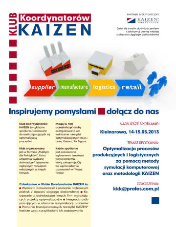 PARTNER MERYTORYCZNY Dziel się swoim doświadczeniem i zdobywaj cenną wiedzę z obszaru ciągłego doskonalenia Inspirujemy pomysłami Klub Koordynatorów KAIZEN to cykliczne spotkania skierowane do osób zajmujących się optymalizacją procesów. Mogą w nim uczestniczyć osoby zaangażowane we wdrażanie narzędzi optymalizacyjnych m.in.: Lean, Kaizen, Six Sigma. Klub organizowany jest w formule „Praktycy dla Praktyków”, która umożliwia wymianę doświadczeń i poznanie najlepszych rozwiązań wdrażanych w innych firmach. Każde spotkanie jest poświęcone wybranemu tematowi przewodniemu, który zainspiruje Cię do wprowadzenia usprawnień w Twojej firmie! Członkostwo w Klubie Koordynatorów KAIZEN to: Wymiana doświadczeń i poznanie najlepszych praktyk z obszaru ciągłego doskonalenia Korzystanie z doświadczeń innych firm wdrażających projekty optymalizacyjne Integracja osób pracujących w obszarze optymalizacji procesów Poznanie licencjonowanych narzędzi KAIZEN® Institute wraz z przykładami ich zastosowania dołącz do nas Najbliższe spotkanie: Kielnarowa, 14-15.05.2013 Temat spotkania: Optymalizacja procesów produkcyjnych i logistycznych za pomocą metody symulacji komputerowej oraz metodologii KAIZEN zgłoszenia: [email protected] PARTNER MERYTORYCZNY Dziel się swoim doświadczeniem i zdobywaj cenną wiedzę z obszaru ciągłego doskonalenia Inspirujemy pomysłami dołącz do nas Optymalizacja procesów produkcyjnych i logistycznych za pomocą metody symulacji komputerowej oraz metodologii KAIZEN 14-15 maja 2013, Wyższa Szkoła Informatyki i Zarządzania w Rzeszowie, Kampus CEM, Kielnarowa 386a, 36-020 Tyczyn Dzień I 14.05, 10.00 – 16.30 – prezentacje, laboratoria i warsztaty KAIZEN 18.30 – wieczór integracyjny, grill (uczestnictwo płatne) Dzień II 15.05, 10.00 – 14.00 – Gemba Walk w firmie PZL Mielec (uczestnictwo płatne) Jak usprawniać procesy, aby skutecznie przynosiły zakładane efekty? Jak wykorzystać do tego symulacje komputerowe i system zarządzania KAIZEN? Nasz XVI Klub Koordynatorów KAIZEN zapowiada się wyjątkowo! Spotkanie w pierwszy dzień dedykujemy optymalizacji procesów produkcyjnych i logistycznych. Zobaczymy jak symulacje komputerowe i filiozofia KAIZEN wspierają procesy optymalizacji. W drugiej części dnia zapraszamy na praktyczne warsztaty i laboratoria, a wieczorem na niepowtarzalne spotkanie przy grillu. W drugim dniu odwiedzimy firmę PZL Mielec i zobaczymy na żywo jak przebiegają zoptymalizowane procesy produkcyjne. Program spotkania 1.Dzień I – 14.05, 10.00 – 16.35 • Prezentacja „Optymalizacja procesów dzięki metodologii KAIZEN” – Jolanta Pańczyszyn, KAIZEN Institute • Prezentacja „Zastosowanie metodyki symulacji komputerowej w doskonaleniu i optymalizacji procesów logistyczno-produkcyjnych” – dr Grzegorz Wróbel, WSIiZ Rzeszów Warunki i zasady Klubu Koordynatorów KAIZEN 1. Członkowstwo i udział w spotkaniach Klubu jest płatne. 2. Spotkanie jest organizowane przez PROFES® Sp. z o.o. Sp.k. 3. Uczestnicy zobowiązują się do przygotowania prezentacji na wybrany temat i wystąpienie w roli eksperta na jednym ze spotkań Klubu Koordynatorów KAIZEN. 4. Warunkiem uczestnictwa jest przesłanie zgłoszenia drogą mailową oraz dokonanie płatności przelewem zgodnie z informacjami zawartymi w niniejszym zgłoszeniu, po uprzednim potwierdzeniu przez Orgznizatora. 5. Po otrzymaniu przez Organizatora wpłaty zostanie przesłane e-mailem potwierdzenie uczestnictwa, które uprawnia do udziału w wybranych wydarzeniach. 6. Poprzez przesłanie zgłoszenia Zgłaszający wyraża zgodę na przetwarzanie udostępnionych danych osobowych uczestnika i firmy w celach informacyjnych i marketingowych przez Organizatora. 7. Wszystkie pozycje programu Klubu zostały potwierdzone. Organizator zastrzega sobie prawo do zmian. 8. W przypadku gdyby Klub nie odbył się z winy Organizatorów Zgłaszającym zostanie zwrócona pełna kwota. 9. Firma, w której odbywa się GEMBA Walk zastrzega sobie prawo odmowy przyjęcia na wizytę uczestnika. Decyzję o ewentualnej odmowie otrzymają Państwo tydzień przed terminem realizacji GEMBA Walk. W przypadku odmowy udziału, zgłoszenie jest anulowane, Zgłaszający nie ponosi żadnych kosztów. 10.O zapisie na wydarzenia dodatkowe decyduje kolejność zgłoszeń. 11.Przesłanie zgłoszenia jest równoznaczne z akceptacją Warunki i zasady Klubu Koordynatorów KAIZEN. • Prezentacja „Optymalizacja dostaw sekwencyjnych w przemyśle samochodowym przy wykorzystaniu metody symulacji komputerowej” – dr inż. Paweł Pawlewski, Politechnika Poznańska • Warsztaty do wyboru: - Laboratorium – budowa modeli symulacyjnych – ilość miejsc: 20 - Warsztaty KAIZEN – ilość miejsc: 20 Od godziny 18.30 wieczór integracyjny, grill (uczestnictwo płatne). 2.Dzień II – 15.05, 10.00 – 14.00 • Gemba Walk w firmie PZL Mielec (uczestnictwo płatne). 52-121 Wrocław, ul. Koreańska 13 tel. +48 71 341 29 51, fax +48 71 335 22 79 [email protected] | www.profes.com.pl