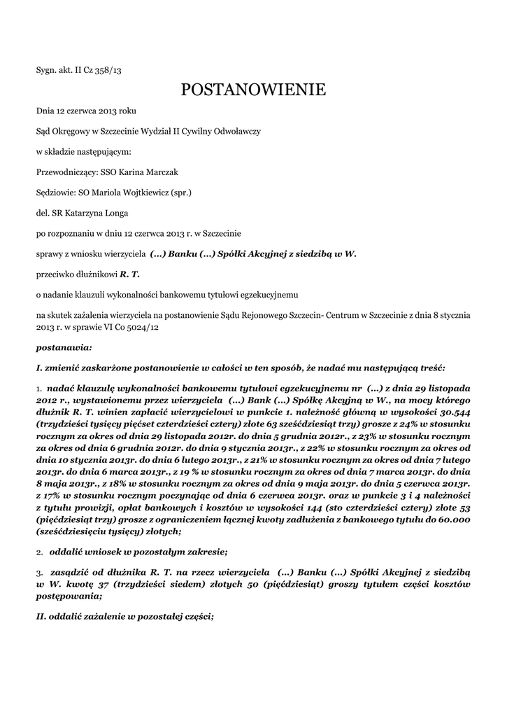 Sygn. akt. II Cz 358/13 POSTANOWIENIE Dnia 12 czerwca 2013 roku Sąd Okręgowy w Szczecinie Wydział II Cywilny Odwoławczy w składzie następującym: Przewodniczący: SSO Karina Marczak Sędziowie: SO Mariola Wojtkiewicz (spr.) del. SR Katarzyna Longa po rozpoznaniu w dniu 12 czerwca 2013 r. w Szczecinie sprawy z wniosku wierzyciela (...) Banku (...) Spółki Akcyjnej z siedzibą w W. przeciwko dłużnikowi R. T. o nadanie klauzuli wykonalności bankowemu tytułowi egzekucyjnemu na skutek zażalenia wierzyciela na postanowienie Sądu Rejonowego Szczecin- Centrum w Szczecinie z dnia 8 stycznia 2013 r. w sprawie VI Co 5024/12 postanawia: I. zmienić zaskarżone postanowienie w całości w ten sposób, że nadać mu następującą treść: 1. nadać klauzulę wykonalności bankowemu tytułowi egzekucyjnemu nr (...) z dnia 29 listopada 2012 r., wystawionemu przez wierzyciela (...) Bank (...) Spółkę Akcyjną w W., na mocy którego dłużnik R. T. winien zapłacić wierzycielowi w punkcie 1. należność główną w wysokości 30.544 (trzydzieści tysięcy pięćset czterdzieści cztery) złote 63 sześćdziesiąt trzy) grosze z 24% w stosunku rocznym za okres od dnia 29 listopada 2012r. do dnia 5 grudnia 2012r., z 23% w stosunku rocznym za okres od dnia 6 grudnia 2012r. do dnia 9 stycznia 2013r., z 22% w stosunku rocznym za okres od dnia 10 stycznia 2013r. do dnia 6 lutego 2013r., z 21% w stosunku rocznym za okres od dnia 7 lutego 2013r. do dnia 6 marca 2013r., z 19 % w stosunku rocznym za okres od dnia 7 marca 2013r. do dnia 8 maja 2013r., z 18% w stosunku rocznym za okres od dnia 9 maja 2013r. do dnia 5 czerwca 2013r. z 17% w stosunku rocznym poczynając od dnia 6 czerwca 2013r. oraz w punkcie 3 i 4 należności z tytułu prowizji, opłat bankowych i kosztów w wysokości 144 (sto czterdzieści cztery) złote 53 (pięćdziesiąt trzy) grosze z ograniczeniem łącznej kwoty zadłużenia z bankowego tytułu do 60.000 (sześćdziesięciu tysięcy) złotych; 2. oddalić wniosek w pozostałym zakresie; 3. zasądzić od dłużnika R. T. na rzecz wierzyciela (...) Banku (...) Spółki Akcyjnej z siedzibą w W. kwotę 37 (trzydzieści siedem) złotych 50 (pięćdziesiąt) groszy tytułem części kosztów postępowania; II. oddalić zażalenie w pozostałej części; III. zasądzić od dłużnika R. T. na rzecz wierzyciela (...) Banku (...) Spółki Akcyjnej z siedzibą w W. kwotę 22 (dwadzieścia dwa) złote 50 (pięćdziesiąt) groszy tytułem części kosztów postępowania zażaleniowego. SSR Katarzyna Longa SSO Karina Marczak SSO Mariola Wojtkiewicz Sygn. akt II Cz 358/13 UZASADNIENIE: Postanowieniem z dnia 8 stycznia 2013 r. Sąd Rejonowy Szczecin- Centrum w Szczecinie (sygn. akt VI Co 5024/12) oddalił wniosek wierzyciela o nadanie klauzuli wykonalności bankowemu tytułowi egzekucyjnemu. Zdaniem sądu bankowy tytuł egzekucyjny nie spełnia warunków określonych w przepisach art. 96 ust. 1 i 2 i art. 97 ust. 1 i 2 ustawy prawo bankowe. Przesłanką niezbędną do uwzględnienia wniosku w niniejszej sprawie było bowiem stwierdzenie, iż wierzyciel wystąpił o nadanie klauzuli wykonalności bankowemu tytułowi egzekucyjnemu w terminie oznaczonym w pisemnym oświadczeniu dłużnika o poddaniu się egzekucji. W załączonym do wniosku bankowym tytule egzekucyjnym wierzyciel wskazał, iż roszczenia banku wobec dłużnika R. T. wynikają z umowy o wydanie i używanie karty kredytowej (...) S.A. nr (...) z dnia 27 kwietnia 2010 roku. Równocześnie wierzyciel przedłożył ww. umowę wraz z oświadczeniem dłużnika o poddaniu się egzekucji, w którym dłużnik oświadczył, iż bank będzie mógł wystąpić z wnioskiem o nadanie klauzuli wykonalności bankowemu tytułowi egzekucyjnemu w terminie 2 lat od dnia rozwiązania umowy. Wnioskodawca nie przedstawił zaś żadnej dokumentacji, która zaświadczyłaby o tym, kiedy doszło do rozpoczęcia wymagalności zadłużenia. Przedmiotową umowę zawarto w dniu 27 kwietnia 2010 roku, a zatem termin 2 lat liczony od daty, w której najwcześniej dojść mogło do rozwiązania umowy, upłynął z dniem 27 kwietnia 2012 roku. Mając to uwadze sąd wniosek wierzyciela oddalił. Zażalenie na postanowienie sądu złożył wierzyciel i zaskarżając je w całości wniósł o jego uchylenie i nadanie klauzuli wykonalności bankowemu tytułowi egzekucyjnemu zgodnie z wnioskiem z dnia 29 listopada 2012 r. W uzasadnieniu podał, że istotnie nie dołączył do wniosku o nadanie bankowemu tytułowi egzekucyjnemu dowodu odbioru wypowiedzenia umowy nr (...) z dnia 27 kwietnia 2010 r. Do zażalenia dołączył dowód nadania i podjęcia przez dłużnika wypowiedzenia umowy wskazując, iż termin wypowiedzenia upłynął w dniu 12 stycznia 2011 r. Sąd Okręgowy zważył, co następuje: Zażalenie doprowadziło do zmiany zaskarżonego postanowienia. Sąd Okręgowy jest sądem merytorycznym, orzeka na podstawie dokumentów znajdujących się w aktach sprawy, złożonych nawet z zażaleniem. Jeżeli zatem do zażalenia wierzyciel przedstawił dowód wypowiedzenia umowy, dokument, z którego brakiem Sąd Rejonowy wiązał oddalenie wniosku, Sąd Okręgowy miał obowiązek ocenić ten dowód, a w sytuacji gdy wykazywał przesłankę, uznaną wcześniej za nie wykazaną, przystąpić do analizy pozostałych podstaw warunkujących nadanie bankowemu tytułowi egzekucyjnemu klauzuli wykonalności. Postępowanie o nadanie klauzuli wykonalności ma charakter postępowania uproszczonego i formalnego. W jego ramach Sąd dokonuje jedynie oceny czy dłużnik poddał się egzekucji oraz czy roszczenie objęte tytułem wynika z czynności bankowej, jak również czy dłużnik dokonał tej czynności bezpośrednio z bankiem oraz czy roszczenie wynika z zabezpieczenia wierzytelności banku wynikającej z tej czynności. Tym samym badanie Sądu ogranicza się wyłącznie do oceny czy wystawienie bankowego tytułu egzekucyjnego odbyło się zgodnie z przepisami art. 96-98 