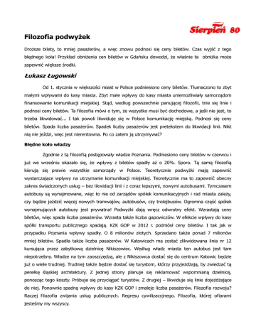 Filozofia podwyżek Droższe bilety, to mniej pasażerów, a więc znowu podnosi się ceny biletów. Czas wyjść z tego błędnego koła! Przykład obniżenia cen biletów w Gdańsku dowodzi, że właśnie ta obniżka może zapewnić większe środki. Łukasz Ługowski Od 1. stycznia w większości miast w Polsce podniesiono ceny biletów. Tłumaczono to zbyt małymi wpływami do kasy miasta. Zbyt małe wpływy do kasy miasta uniemożliwiały samorządom finansowanie komunikacji miejskiej. Stąd, według powszechnie panującej filozofii, tnie się linie i podnosi ceny biletów. Ta filozofia mówi o tym, że wszystko musi być dochodowe, a jeśli nie jest, to trzeba likwidować... I tak powoli likwiduje się w Polsce komunikację miejską. Podnosi się ceny biletów. Spada liczba pasażerów. Spadek liczby pasażerów jest pretekstem do likwidacji linii. Nikt nią nie jeździ, więc jest nierentowna. Po co zatem ją utrzymywać? Błędne koło władzy Zgodnie z tą filozofią postępowały władze Poznania. Podniesiono ceny biletów w czerwcu i już we wrześniu okazało się, że wpływy z biletów spadły aż o 20%. Sporo. Tą samą filozofią kierują się prawie wszystkie samorządy w Polsce. Teoretycznie podwyżki mają zapewnić wystarczające wpływy na utrzymanie komunikacji miejskiej. Teoretycznie ma to zapewnić obecny zakres świadczonych usług – bez likwidacji linii i z coraz lepszymi, nowymi autobusami. Tymczasem autobusy są wynajmowane, więc to nie od zarządów spółek komunikacyjnych i rad miasta zależy, czy będzie jeździć więcej nowych tramwajów, autobusów, czy trolejbusów. Ogromna część spółek wynajmujących autobusy jest prywatna! Podwyżki dają wręcz odwrotny efekt. Wzrastają ceny biletów, więc spada liczba pasażerów. Wzrasta także liczba gapowiczów. W efekcie wpływy do kasy spółki transportu publicznego spadają. KZK GOP w 2012 r. podniósł ceny biletów. I tak jak w przypadku Poznania wpływy spadły. O 8 milionów złotych. Sprzedano także ponad 7 milionów mniej biletów. Spadła także liczba pasażerów. W Katowicach ma zostać zlikwidowana linia nr 12 kursująca przez zabytkową dzielnicę Nikiszowiec. Według władz miasta ten autobus jest tam niepotrzebny. Władze na tym zaoszczędzą, ale z Nikiszowca dostać się do centrum Katowic będzie już o wiele trudniej. Trudniej także będzie dostać się turystom, którzy przyjeżdżają, by zwiedzać tą perełkę śląskiej architektury. Z jednej strony planuje się reklamować wspomnianą dzielnicę, ponosząc tego koszty. Próbuje się przyciągać turystów. Z drugiej – likwiduje się linie dojeżdżające do niej. Ponownie spadną wpływy do kasy KZK GOP i zmaleje liczba pasażerów. Filozofia rozwoju? Raczej filozofia zwijania usług publicznych. Regresu cywilizacyjnego. Filozofia, której ofiarami jesteśmy my wszyscy. Tańsze bilety, więcej pieniędzy W Gdańsku w 2008 r. dwukrotnie obniżono ceny biletów. W ciągu zaledwie jednego roku! Bilet miesięczny staniał ze 132 zł do 110. A po ponownej obniżce do 98 złotych. Efekt? Wpływy wzrosły o 8 milionów złotych. Zatem to nie podwyżki, a obniżki cen biletów zapewniają większe wpływy! I zmniejszają liczbę samochodów na ulicach. Spadek kosztów dojazdu do pracy, do szkoły czy na uczelnię skłania ludzi do korzystania z komunikacji miejskiej. Wzrasta liczba pasażerów, a spada liczba kierowców na drogach. Dzięki temu maleją korki. Zmniejsza się zanieczyszczenie spalinami i poziom hałasu. W rezultacie życie w mieście staje się dogodniejsze. Jak widać, to obniżki kosztów przemieszczania się są rozwiązaniem, a nie podwyżki cen biletów. Najlepiej obniżki do zera. Bezpłatna komunikacja miejska spowodowałaby znaczny spadek liczby samochodów na ulicach. A nawet likwidację korków. A co za tym idzie, jeszcze większy spadek ilości spalin emitowanych do powietrza i o wiele mniejszy hałas. Z wprowadzeniem bezpłatnej komunikacji miejskiej wiąże się jeszcze jedna rzecz. Spadek kosztów utrzymania dróg. Zamiast wydawać gigantyczne pieniądze na rozbudowę dotychczasowych dróg, czy budowę nowych, warto przeznaczyć je na komunikację miejską. Nie tylko oszczędzi się na niepotrzebnych rozbudowach i budowach nowych tras. Spadną koszty utrzymania dotychczas istniejących. A także nie będzie się remontować tych, które dopiero mają powstać. Cała infrastruktura drogowa będzie rzadziej remontowana. To przecież nie tylko nawierzchnia, ale także malowanie pasów, budowa chodników, przejść dla pieszych, stawianie nowych świateł, czy budowa rond i skrzyżowań. Dodatkowo nie będzie potrzeby budowy nowych parkingów. Oszczędności dla gmin mogą iść w dziesiątkach milionów. To dobra filozofia. Zła to ponowne podwyżki. Podwyżki powodujące wzrost ruchu na drogach. Zwiększenie korków. Jak wielkie są koszty rozwiązywania problemów z korkami uzmysławia nowy pomysł radnych Katowic. Chcą wybudować tunel pod rezerwatem w Ochojcu, który będzie kosztował 150 milionów złotych. Sam tunel! Nie licząc kosztów budowy dróg dojazdowych do niego oraz całej infrastruktury do tego potrzebnej. Dla kierowców jest to oczywiście rozwiązanie. Trudno się im dziwić, że chcą rozwiązania problemu korków, skoro przez nie mają utrudniony dojazd do pracy. Ale to nie tłumaczy władz miast, które nie myślą nad rozwiązaniem tych problemów w mniej kosztowny sposób. Zamiast tego zniechęcają coraz większą liczbę pasażerów do korzystania z komunikacji miejskiej i przyczyniają się do potęgowania problemu korków. Mało tego. Władze Warszawy już teraz podjęły się działań by zwiększyć opłaty za parkowanie. Podwyżki opłat za parkowanie zapowiedziały też Katowice. Nie tylko zniechęca się pasażerów do korzystania z komunikacji miejskiej, ale wali się obuchem po głowach kierowców. Kierowców, których zmusza się do przesiadania z autobusów do samoc
