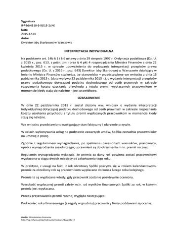 Sygnatura IPPB6/4510-348/15-2/AK Data 2015.12.07 Autor Dyrektor Izby Skarbowej w Warszawie INTERPRETACJA INDYWIDUALNA Na podstawie art. 14b § 1 i § 6 ustawy z dnia 29 sierpnia 1997 r. Ordynacja podatkowa (Dz. U. z 2015 r., poz. 613, z późn. zm.) oraz § 4 pkt 4 rozporządzenia Ministra Finansów z dnia 22 kwietnia 2015 r. w sprawie upoważnienia do wydawania interpretacji przepisów prawa podatkowego (Dz. U. z 2015 r., poz. 643) Dyrektor Izby Skarbowej w Warszawie działający w imieniu Ministra Finansów stwierdza, że stanowisko – przedstawione we wniosku z dnia 15 października 2015 r. (data wpływu 22 października 2015 r.), o wydanie interpretacji przepisów prawa podatkowego dotyczącej podatku dochodowego od osób prawnych w zakresie rozpoznania kosztu uzyskania przychodu z tytułu premii wypłacanych pracownikom w momencie kiedy stają się należne – jest prawidłowe. UZASADNIENIE W dniu 22 października 2015 r. został złożony ww. wniosek o wydanie interpretacji indywidualnej dotyczącej podatku dochodowego od osób prawnych w zakresie rozpoznania kosztu uzyskania przychodu z tytułu premii wypłacanych pracownikom w momencie kiedy stają się należne. We wniosku przedstawiono następujący stan faktyczny i zdarzenie przyszłe. W celach wykonywania usług na podstawie zawartych umów, Spółka zatrudnia pracowników na umowę o pracę. Zgodnie z regulaminem wynagradzania, po spełnieniu określonych warunków, pracownicy, oprócz wynagrodzenia zasadniczego, uprawnieni są do otrzymania m.in. premii rocznej. Regulamin wynagradzania wskazuje, że premia za dany rok powinna zostać pracownikowi wypłacona w ciągu dwóch miesięcy od zakończenia tego roku. W praktyce, z uwagi na fakt, iż rok obrotowy Spółki pokrywa się w rokiem kalendarzowym, premie za określony rok są pracownikom wypłacane do końca lutego roku kolejnego. Premie te są wypłacane wtedy, gdy pracownik zostanie pozytywnie oceniony. Wysokość wypłacanej premii zależy m.in. od wyników finansowych Spółki za rok, w którym premia jest wypłacana. Proces przyznawania premii rocznej wygląda następująco: Pod koniec roku finansowego (z reguły w grudniu) pracownicy firmy poddawani są ocenie. Źródło: Ministerstwo Finansów http://sip.mf.gov.pl/sip/index.php?rodzaj=2&czystka=1 Proces ten polega na tym, że pracownik wspólnie z przełożonymi omawia działania podjęte w mijającym roku, z perspektywy określonych kryteriów. Po szeregu rozmów, pracownikowi nadawana jest wstępna ocena, która jest raportowana w systemie kadrowym. Pracownik nie uzyskuje jednak informacji na temat tego, jaką ocenę otrzymał. Ocena taka oczekuje na akceptację ze strony przełożonych wyższego szczebla w strukturach grupy (z reguły na poziomie międzynarodowym). Oficjalna akceptacja dokonywana jest w systemie kadrowym. Przełożeni wyższego szczebla mają prawo zmienić wstępną ocenę dokonaną na szczeblu lokalnym. Dopiero po uzyskaniu takiej oficjalnej akceptacji ocena nadana pracownikowi staje się oceną ostateczną, oficjalną, która daje pracownikowi prawo do otrzymani premii rocznej. Ocena taka jest komunikowana pracownikowi. W międzyczasie, po zakończeniu roku obrotowego, analizowane są także wyniki finansowe firmy za dany rok. Ustalenie wyników firmy pozwala ustalić ostateczną kwotę premii do wypłaty. Zarówno oficjalna akceptacja oceny dającej prawo do premii jak i ustalenie kwoty premii do wypłaty, dokonywane jest w roku następującym po roku, za który premia jest wypłacana. W związku z powyższym opisem zadano następujące pytanie. Czy premie wypłacane pracownikom są kosztem podatkowym Spółki w roku, w którym stają się należne, to jest w roku, w którym dokonana zostanie oficjalna akceptacja oceny pracownika w systemie kadrowym Spółki... Zdaniem Wnioskodawcy, premie wypłacane pracownikom nie będą kosztem podatkowym Spółki w roku, za który są naliczane. Będą one kosztem podatkowym Spółki w roku kolejnym czyli w roku, w którym stają się należne. W szczególności będą one kosztem podatkowym miesiąca, w którym dokonana zostanie oficjalna akceptacja oceny pracownika w systemie kadrowym Spółki. Ogólne zasady rozliczania kosztów uzyskania przychodu w czasie zawiera art. 15 ust. 4, 4b, 4c i 4d ustawy z dnia 15 lutego 1992 r. o podatku dochodowym od osób prawnych (Dz. U. z 2014 r. poz. 851 ze zm.; dalej: „ustawa o CIT”). Zasady te są modyfikowane przepisami szczególnymi odnoszącymi się do niektórych rodzajów kosztów, w tym również do szeroko rozumianych kosztów wynagrodzeń. Art. 15 ust. 4g ustawy o CIT wskazuje, że należności z tytułów, o których mowa m.in. w art. 12 ust. 1 ustawy z dnia 26 lipca 1991 r. o podatku dochodowym od osób fizycznych (Dz. U. z 2012 r. poz. 361 ze zm.; dalej: „ustawa PIT”), stanowią KUP w miesiącu, za który są należne pod warunkiem, że zostały wypłacone lub postawione do dyspozycji w terminie wynikającym z Źródło: Ministerstwo Finansów http://sip.mf.gov.pl/sip/index.php?rodzaj=2&czystka=1 przepisów prawa pracy, umowy lub innego stosunku prawnego łączącego strony. W przypadku uchybienia temu terminowi do należności tych stosuje się art. 16 ust. 1 pkt 57 ustawy o CIT. Zgodnie zaś z art. 16 ust. 1 pkt 57 ustawy CIT, koszty świadczeń i innych należności określonych w art. 12 ust. 1 ustawy o PIT (w tym wszelkiego rodzaju wypłaty pieniężne oraz wartość pieniężną świadczeń w naturze bądź ich ekwiwalenty wypłacane w związku ze stosunkiem służbowym, stosunkiem pracy, pracy nakładczej oraz spółdzielczym stosunkiem pracy), nie będą stanowić KUP, jeżeli nie zostały wypłacone, dokonane lub postawione do dyspozycji. Art. 15 ust. 4g ustawy o CIT zawiera szczególne regulacje odnośnie momentu zaliczenia wynagrodzeń pracowników i innych przychodów ze stosunku pracy do kosztów uzyskania przychodu. Z uwagi na fakt, iż art. 15 ust. 4g ustawy o CIT ma charakter pr