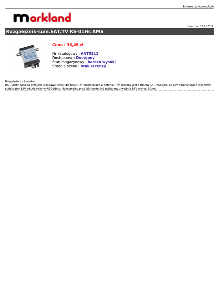 Informacje o produkcie Utworzono 07-03-2017 Rozgałęźnik-sum.SAT/TV RS-01Hs AMS Cena : 36,45 zł Nr katalogowy : ANT0211 Dostępność : Dostępny Stan magazynowy : bardzo wysoki Średnia ocena : brak recenzji Rozgałęźnik - Sumator RS-01dctv posiada przejście składowej stałej dla toru RTV. Wzmacniacz w antenie RTV zasilany jest z tunera SAT, napięcie 14-18V pomniejszone jest przez stabilizator 12V wbudowany w RS-01dctv. Maksymalny prąd jaki może być pobierany z wejścia RTV wynosi 50mA.
