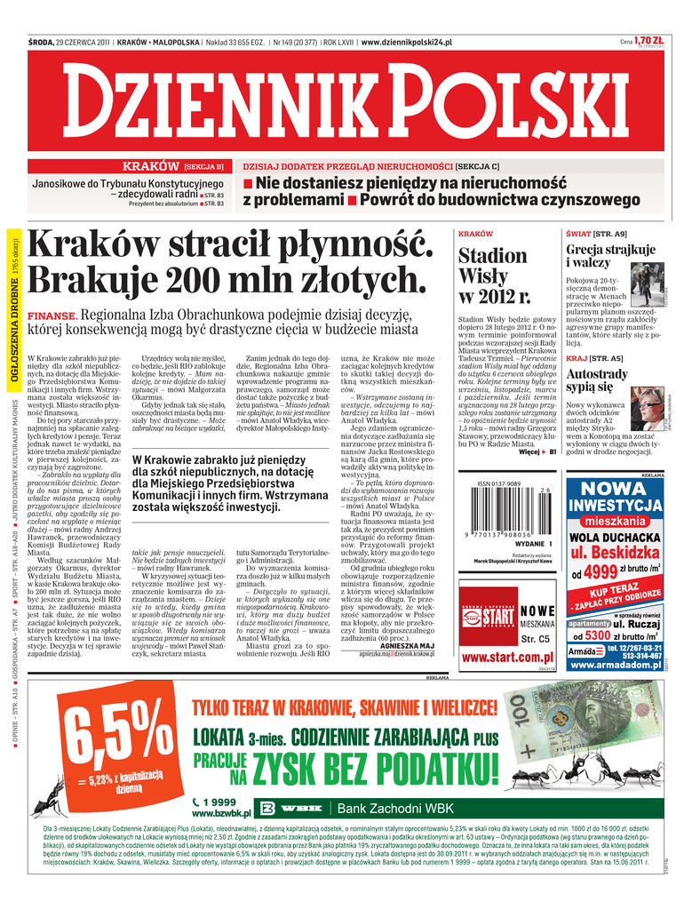 ŚRODA, 29 CZERWCA 2011 | KRAKÓW • MAŁOPOLSKA | Nakład 33 655 EGZ. | Nr 149 (20 377) | ROK LXVII | www.dziennikpolski24.pl ▪ OPINIE – STR. A10 ▪ GOSPODARKA – STR. A7 ▪ SPORT – STR. A18–A20 ▪ JUTRO DODATEK KULTURALNY MAGNES Kraków stracił płynność. Brakuje 200 mln złotych. FINANSE. Regionalna Izba Obrachunkowa podejmie dzisiaj decyzję, której konsekwencją mogą być drastyczne cięcia w budżecie miasta W Krakowie zabrakło już pieniędzy dla szkół niepublicznych, na dotację dla Miejskiego Przedsiębiorstwa Komunikacji i innych firm. Wstrzymana została większość inwestycji. Miasto straciło płynność finansową. Do tej pory starczało przynajmniej na spłacanie zaległych kredytów i pensje. Teraz jednak nawet te wydatki, na które trzeba znaleźć pieniądze w pierwszej kolejności, zaczynają być zagrożone. – Zabrakło na wypłaty dla pracowników dzielnic. Dotarły do nas pisma, w których władze miasta proszą osoby przygotowujące dzielnicowe gazetki, aby zgodziły się poczekać na wypłatę o miesiąc dłużej – mówi radny Andrzej Hawranek, przewodniczący Komisji Budżetowej Rady Miasta. Według szacunków Małgorzaty Okarmus, dyrektor Wydziału Budżetu Miasta, w kasie Krakowa brakuje około 200 mln zł. Sytuacja może być jeszcze gorsza, jeśli RIO uzna, że zadłużenie miasta jest tak duże, że nie wolno zaciągać kolejnych pożyczek, które potrzebne są na spłatę starych kredytów i na inwestycje. Decyzja w tej sprawie zapadnie dzisiaj. Urzędnicy wolą nie myśleć, co będzie, jeśli RIO zablokuje kolejne kredyty. – Mam nadzieję, że nie dojdzie do takiej sytuacji – mówi Małgorzata Okarmus. Gdyby jednak tak się stało, oszczędności miasta będą musiały być drastyczne. – Może zabraknąć na bieżące wydatki, Zanim jednak do tego dojdzie, Regionalna Izba Obrachunkowa nakazuje gminie wprowadzenie programu naprawczego, samorząd może dostać także pożyczkę z budżetu państwa. – Miasto jednak nie splajtuje, to nie jest możliwe – mówi Anatol Władyka, wicedyrektor Małopolskiego Insty- W Krakowie zabrakło już pieniędzy dla szkół niepublicznych, na dotację dla Miejskiego Przedsiębiorstwa Komunikacji i innych firm. Wstrzymana została większość inwestycji. takie jak pensje nauczycieli. Nie będzie żadnych inwestycji – mówi radny Hawranek. W kryzysowej sytuacji teoretycznie możliwe jest wyznaczenie komisarza do zarządzania miastem. – Dzieje się to wtedy, kiedy gmina w sposób długotrwały nie wywiązuje się ze swoich obowiązków. Wtedy komisarza wyznacza premier na wniosek wojewody – mówi Paweł Stańczyk, sekretarz miasta. tutu Samorządu Terytorialnego i Administracji. Do wyznaczenia komisarza doszło już w kilku małych gminach. – Dotyczyło to sytuacji, w których wykazały się one niegospodarnością. Krakowowi, który ma duży budżet i duże możliwości finansowe, to raczej nie grozi – uważa Anatol Władyka. Miastu grozi za to spowolnienie rozwoju. Jeśli RIO uzna, że Kraków nie może zaciągać kolejnych kredytów to skutki takiej decyzji dotkną wszystkich mieszkańców. – Wstrzymane zostaną inwestycje, odczujemy to najbardziej za kilka lat – mówi Anatol Władyka. Jego zdaniem ograniczenia dotyczące zadłużania się narzucone przez ministra finansów Jacka Rostowskiego są karą dla gmin, które prowadziły aktywną politykę inwestycyjną. – To pętla, która doprowadzi do wyhamowania rozwoju wszystkich miast w Polsce – mówi Anatol Władyka. Radni PO uważają, że sytuacja finansowa miasta jest tak zła, że prezydent powinien przystąpić do reformy finansów. Przygotowali projekt uchwały, który ma go do tego zmobilizować. Od grudnia ubiegłego roku obowiązuje rozporządzenie ministra finansów, zgodnie z którym więcej składników wlicza się do długu. Te przepisy spowodowały, że większość samorządów w Polsce ma kłopoty, aby nie przekroczyć limitu dopuszczalnego zadłużenia (60 proc.). AGNIESZKA MAJ [email protected] KRAKÓW ŚWIAT [STR. A9] Stadion Wisły w 2012 r. Grecja strajkuje i walczy Stadion Wisły będzie gotowy dopiero 28 lutego 2012 r. O nowym terminie poinformował podczas wczorajszej sesji Rady Miasta wiceprezydent Krakowa Tadeusz Trzmiel. – Pierwotnie stadion Wisły miał być oddany do użytku 6 czerwca ubiegłego roku. Kolejne terminy były we wrześniu, listopadzie, marcu i październiku. Jeśli termin wyznaczony na 28 lutego przyszłego roku zostanie utrzymany – to opóźnienie będzie wynosić 1,5 roku – mówi radny Grzegorz Stawowy, przewodniczący klubu PO w Radzie Miasta. Więcej ► B1 Pokojową 20-tysięczną demonstrację w Atenach przeciwko niepopularnym planom oszczędnościowym rządu zakłóciły agresywne grupy manifestantów, które starły się z policją. FOT. PAP/EPA OGŁOSZENIA DROBNE 1765 okazji Prezydent bez absolutorium ▪ STR. B3 ▪ Nie dostaniesz pieniędzy na nieruchomość z problemami ▪ Powrót do budownictwa czynszowego KRAJ [STR. A5] Autostrady sypią się Nowy wykonawca dwóch odcinków autostrady A2 między Strykowem a Konotopą ma zostać wyłoniony w ciągu dwóch tygodni w drodze negocjacji. FOT. PAP /BARTŁOMIEJ ZBOROWSKI Janosikowe do Trybunału Konstytucyjnego – zdecydowali radni ▪ STR. B3 DZISIAJ DODATEK PRZEGLĄD NIERUCHOMOŚCI [SEKCJA C] REKLAMA WYDANIE 1 Redaktorzy wydania: Marek Długopolski i Krzysztof Kawa Str. C5 394311B 735711 [SEKCJA B] 1,70 ZŁ (W TYM 8% VAT) REKLAMA 514111b KRAKÓW Cena