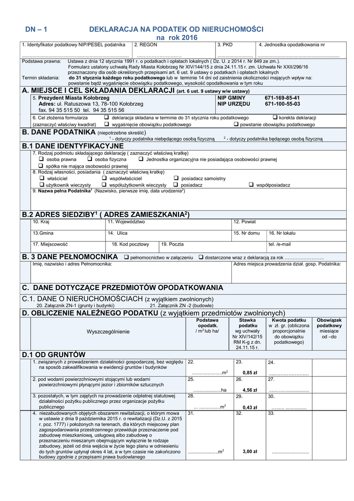1 DEKLARACJA NA PODATEK OD NIERUCHOMOŚCI na rok 2016