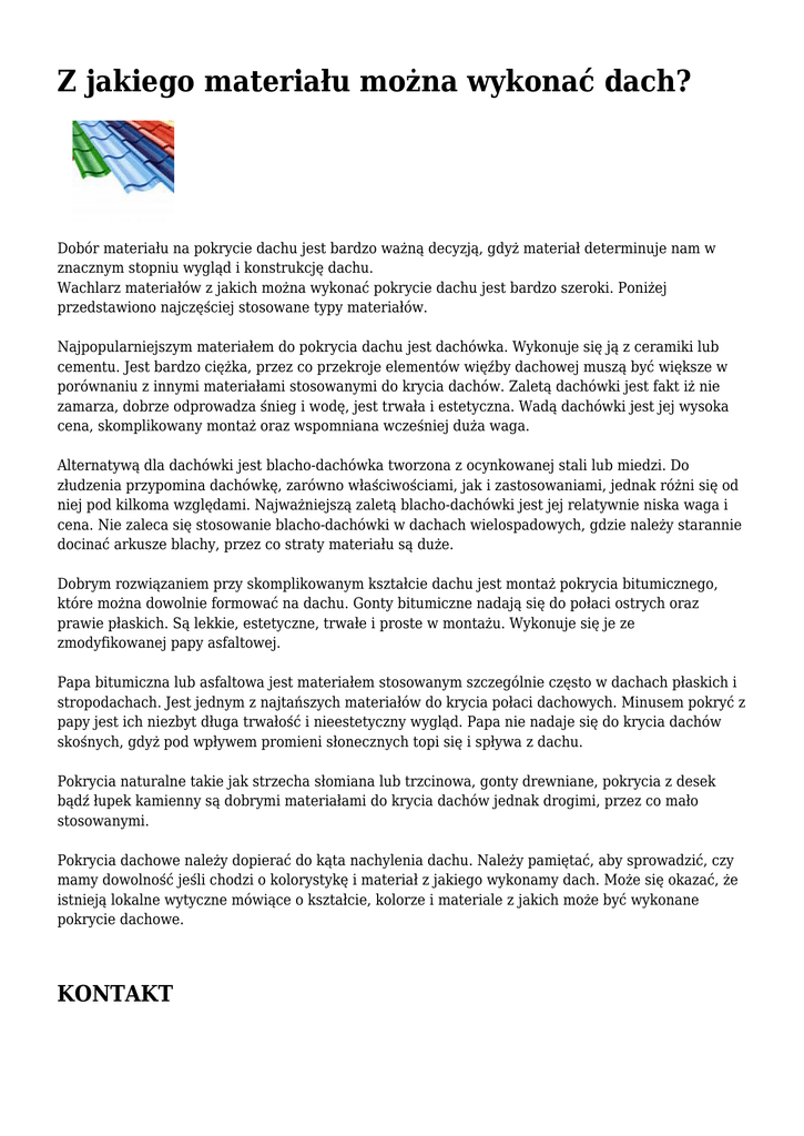 Z jakiego materiału można wykonać dach? Dobór materiału na pokrycie dachu jest bardzo ważną decyzją, gdyż materiał determinuje nam w znacznym stopniu wygląd i konstrukcję dachu. Wachlarz materiałów z jakich można wykonać pokrycie dachu jest bardzo szeroki. Poniżej przedstawiono najczęściej stosowane typy materiałów. Najpopularniejszym materiałem do pokrycia dachu jest dachówka. Wykonuje się ją z ceramiki lub cementu. Jest bardzo ciężka, przez co przekroje elementów więźby dachowej muszą być większe w porównaniu z innymi materiałami stosowanymi do krycia dachów. Zaletą dachówki jest fakt iż nie zamarza, dobrze odprowadza śnieg i wodę, jest trwała i estetyczna. Wadą dachówki jest jej wysoka cena, skomplikowany montaż oraz wspomniana wcześniej duża waga. Alternatywą dla dachówki jest blacho-dachówka tworzona z ocynkowanej stali lub miedzi. Do złudzenia przypomina dachówkę, zarówno właściwościami, jak i zastosowaniami, jednak różni się od niej pod kilkoma względami. Najważniejszą zaletą blacho-dachówki jest jej relatywnie niska waga i cena. Nie zaleca się stosowanie blacho-dachówki w dachach wielospadowych, gdzie należy starannie docinać arkusze blachy, przez co straty materiału są duże. Dobrym rozwiązaniem przy skomplikowanym kształcie dachu jest montaż pokrycia bitumicznego, które można dowolnie formować na dachu. Gonty bitumiczne nadają się do połaci ostrych oraz prawie płaskich. Są lekkie, estetyczne, trwałe i proste w montażu. Wykonuje się je ze zmodyfikowanej papy asfaltowej. Papa bitumiczna lub asfaltowa jest materiałem stosowanym szczególnie często w dachach płaskich i stropodachach. Jest jednym z najtańszych materiałów do krycia połaci dachowych. Minusem pokryć z papy jest ich niezbyt długa trwałość i nieestetyczny wygląd. Papa nie nadaje się do krycia dachów skośnych, gdyż pod wpływem promieni słonecznych topi się i spływa z dachu. Pokrycia naturalne takie jak strzecha słomiana lub trzcinowa, gonty drewniane, pokrycia z desek bądź łupek kamienny są dobrymi materiałami do krycia dachów jednak drogimi, przez co mało stosowanymi. Pokrycia dachowe należy dopierać do kąta nachylenia dachu. Należy pamiętać, aby sprowadzić, czy mamy dowolność jeśli chodzi o kolorystykę i materiał z jakiego wykonamy dach. Może się okazać, że istnieją lokalne wytyczne mówiące o kształcie, kolorze i materiale z jakich może być wykonane pokrycie dachowe. KONTAKT Project - System E-mail: [email protected] WWW: www.project-system.pl Tel: +48 55 237 11 27 Fax: +48 55 236 37 77 Adres: Korotyńskiego 23 02-123 Warszawa