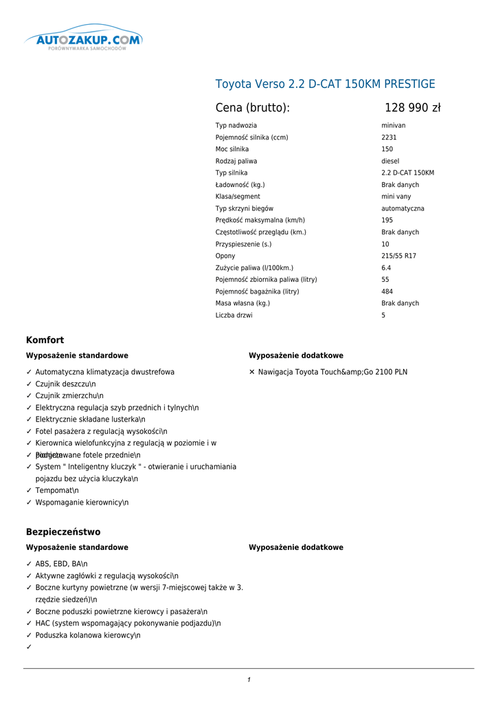Toyota Verso 2.2 D-CAT 150KM PRESTIGE Cena (brutto): 128 990 zł Typ nadwozia minivan Pojemność silnika (ccm) 2231 Moc silnika 150 Rodzaj paliwa diesel Typ silnika 2.2 D-CAT 150KM Ładowność (kg.) Brak danych Klasa/segment mini vany Typ skrzyni biegów automatyczna Prędkość maksymalna (km/h) 195 Częstotliwość przeglądu (km.) Brak danych Przyspieszenie (s.) 10 Opony 215/55 R17 Zużycie paliwa (l/100km.) 6.4 Pojemność zbiornika paliwa (litry) 55 Pojemność bagażnika (litry) 484 Masa własna (kg.) Brak danych Liczba drzwi 5 Komfort Wyposażenie standardowe Wyposażenie dodatkowe ✓ Automatyczna klimatyzacja dwustrefowa ✕ Nawigacja Toyota Touch&Go 2100 PLN ✓ Czujnik deszczu\n ✓ Czujnik zmierzchu\n ✓ Elektryczna regulacja szyb przednich i tylnych\n ✓ Elektrycznie składane lusterka\n ✓ Fotel pasażera z regulacją wysokości\n ✓ Kierownica wielofunkcyjna z regulacją w poziomie i w ✓ Podgrzewane pionie\n fotele przednie\n ✓ System " Inteligentny kluczyk " - otwieranie i uruchamiania pojazdu bez użycia kluczyka\n ✓ Tempomat\n ✓ Wspomaganie kierownicy\n Bezpieczeństwo Wyposażenie standardowe Wyposażenie dodatkowe ✓ ABS, EBD, BA\n ✓ Aktywne zagłówki z regulacją wysokości\n ✓ Boczne kurtyny powietrzne (w wersji 7-miejscowej także w 3. rzędzie siedzeń)\n ✓ Boczne poduszki powietrzne kierowcy i pasażera\n ✓ HAC (system wspomagający pokonywanie podjazdu)\n ✓ Poduszka kolanowa kierowcy\n ✓ 1 Przednie lampy przeciwmgielne\n 2 ✓ Przednie poduszki powietrzne kierowcy i pasażera\n ✓ Reflektory ksenonowe z funkcją autopoziomowania\n ✓ VSC+ (system stabilizacji toru jazdy) i TRC (kontrola trakcji)\n Dodatki Wyposażenie standardowe Wyposażenie dodatkowe ✓ 2 schowki w podłodze w 2. rzędzie siedzeń (2 x 5,7 l) ✕ Dopłata do wersji 7-miejscowej 2200 PLN ✓ 3 niezależne, przesuwane fotele w 2. rzędzie (zakres 195 ✕ Lakier biały perłowy 3500 PLN mm) ✓ Centralny zamek sterowany pilotem ✕ Lakier metalik 2300 PLN ✓ Chromowane listwy górnego grilla i na klapie bagażnika ✕ Skrzynia Multidrive S (1,8 Valvematic) 5000 PLN ✓ dach panoramiczny Skyview z elektryczną roletą\n ✓ Dodatkowe lusterko wewnętrzne do obserwacji osób w 2. i 3. rzędzie siedzeń\n ✓ Dojazdowe koło zapasowe\n ✓ Gniazdo 12 V z przodu i w bagażniku\n ✓ Kamera cofania (widok na ekranie 6,1")\n ✓ Kierownica pokryta skórą Nappa\n ✓ Kierunkowskazy w lusterkach\n ✓ Koła 215/55 R17, felgi aluminiowe\n ✓ Podłokietnik między fotelem kierowcy i pasażera skórą ekologiczną\n ✓ Podłokietnik w 2. rzędzie siedzeń\n ✓ Przyciemniane tylne szyby\n ✓ Roleta przestrzeni bagażnika (specjalny schowek na roletę pod podłogą bagażnika)\n ✓ rolety szyb bocznychw 2. rzędzie siedzeń\n ✓ Schowek główny (8,2 l)\n ✓ Schowki w drzwiach przednich i tylnych na butelkę o pojemności 500 ml\n ✓ Skórzana gałka dźwigni zmiany biegów\n ✓ światła do jazdy dziennej typu LED\n ✓ Światła stopu typu LED\n ✓ System mocowania fotelików ISOFIX na skrajnych miejscach w 2. rzędzie siedzeń\n ✓ System multimedialny Toyota Touch (radio CD + MP3 + 6 głośników + Bluetooth)\n ✓ System multimedialny Toyota Touch&Go Plus (nawigacja)\n ✓ System opóźnionego wyłączania świateł po zgaszeniu silnika „Follow me home"\n ✓ Tapicerka materiałowa z boczkami ze skóry VIENNA i przeszytymi szarą nitką\n ✓ Tylny spojler dachowy\n ✓ Wewnętrzne lusterko elektrochromatyczne\n ✓ Zderzaki, klamki i lusterka zewnętrzne w kolorze nadwozia\n ✓ Złącze Aux-In do podłączania urządzeń zewnętrznych i port USB\n 3 Doprecyzowanie oferty ✕ Pakiet Clever - 0 PLN gniazdo 12 V w 2. rzędzie siedzeń klimatyzowany schowek(4,8 l) składane stoliki lotnicze w 2. rzędzie siedzeń Wysuwany schowek pod przednim fotelem pasażera ✕ Pakiet Style - 0 PLN chromowane kontury lamp przeciwmgielnych dolny grill w kolorze czerni fortepianowej dwie chromowane listwyw dolnej części grilla satynowe elementywykończenia wnętrza (ramki nawiewów oraz listwy: na konsoli centralnej, na drzwiachoraz wokół dźwigni zmiany biegów) Kontakt: Nazwa użytkownika: admin Nazwa firmy: qqq Adres: qqq 12, 41-706 qqq1, NIP: 954 REGON: 1 Telefon: 123, 1 Fax: 1 Email: 1 www: 4