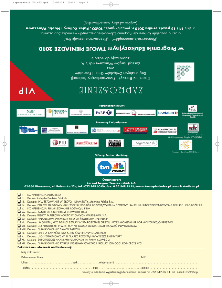 zaproszenie TP w23.qxd 10-09-23 10:54 Page 2 Finansowanie samorz¹dów i Finansowanie rozwoju firm oraz na pozosta³e konferencje Programu Edukacyjnego-szczegó³y wewn¹trz Zaproszenia. w dniu 14 i 15 padziernika 2010 r. pocz¹tek godz. 10:00 , Pa³ac Kultury i Nauki, Warszawa (wejcie od ulicy Marsza³kowskiej) w Programie Edukacyjnym TWOJE PIENI¥DZE 2010. Kazimierz Barczyk - Przewodnicz¹cy Federacji Regionalnych Zwi¹zków Gmin i Powiatów oraz Zarz¹d Targów Warszawskich S.A. zapraszaj¹ do udzia³u ZAPROSZENIE VIP Patronat honorowy: Polska Agencja Informacji i Inwestycji Zagranicznych (PAIiIZ) Partnerzy i Wspó³praca: Fundacja Rozwoju Samorz¹dnoci i Prasy Lokalnej Goæ Honorowy Targów COINEXPO Narodowy Bank Republiki Bia³oru G³ówny Partner Medialny: Organizator: Zarz¹d Targów Warszawskich S.A. 02-566 Warszawa, ul. Pu³awska 12a; tel.: 022 849 60 06, fax: 0 22 849 35 84; www.twojepieniadze.pl, e-mail: [email protected] o o o o o o o o o o o o o o o I. KONFERENCJA AUTORSKA II. Debata Zwi¹zku Banków Polskich. III. Debata: INWESTOWANIE W Z£OTO I DIAMENTY, Mennica Polska S.A. IV. Debata: POZEW ZBIOROWY - SKUTECZNY SPOSÓB ROZWI¥ZYWANIA SPORÓW NA RYNKU UBEZPIECZENIOWYM? SZANSE I ZAGRO¯ENIA V. KONFERENCJA: FINANSOWANIE ROZWOJU FIRM Va. Debata: BANKI SOJUSZNIKIEM ROZWOJU FIRM Vb. Debata GIE£DY PAPIERÓW WARTOCIOWYCH WARSZAWA S.A. Vc. Debata: FINANSOWE WSPARCIE FIRM ZE RODKÓW UNIJNYCH VI. Debata: - MONETA JAKO DZIE£O SZTUKI W STARO¯YTNEJ GRECJI; - POZAMONETARNE FORMY KOLEKCJONERSTWA VII. Debata: CO FUNDUSZE INWESTYCYJNE MOG¥ DZISIAJ ZAOFEROWAÆ INWESTOROM VIII. Debata: FINANSOWANIE SAMORZ¥DÓW IX. Debata: OFERTA BANKÓW DLA KLIENTÓW INDYWIDUALNYCH X. Debata: ULGI PODATKOWE W III FILARZE RECEPT¥ NA WY¯SZE EMERYTURY XI. Debata EUROPEJSKIEJ AKADEMII PLANOWANIA FINANSOWEGO XII. Debata: FINANSOWANIE RYNKU MIESZKANIOWEGO I NIERUCHOMOCI KOMERCYJNYCH Potwierdzam obecnoæ na Konferencji Imiê i Nazwisko . . . . . . . . . . . . . . . . . . . . . . . . . . . . . . . . . . . . . . . . . . . . . . . . . . . . . . . . . . . . . . . . . . . . . . . . . . . . . . . . . . . . . . . . . . . . . . . . . . . . . . . . . Pe³na nazwa firmy: . . . . . . . . . . . . . . . . . . . . . . . . . . . . . . . . . . . . . . . . . . . . . . . . . . . . . . . . . . . . . . . .NIP: . . . . . . . . . . . . . . . . . . . . . . . . . . . . . . . . . . Ulica: . . . . . . . . . . . . . . . . . . . . . . . . . . . . . kod: . . . . . . . . . . . . . . miejscowoæ: . . . . . . . . . . . . . . . . . . . . . . . . . . . . . . . . . . . . . . . . . . . . . . . . . . . . . . . Telefon: . . . . . . . . . . . . . . . . . . . . . . . . . . . . . . . . . . . . . . . . Fax: . . . . . . . . . . . . . . . . . . . . . . . . . . . . e-mail: . . . . . . . . . . . . . . . . . . . . . . . . . . . . . . . . Prosimy o odes³anie wype³nionego formularza na faks nr: 022 849 35 84 lub e-mail: [email protected] zaproszenie TP w23.qxd 10-09-23 10:54 Page 3 XVI POLSKIE FORUM FINANSOWE TWOJE PIENIĄDZE 2010 IV PROGRAM EDUKACYJNY TWOJE PIENIADZE 2010 14 padziernika 2010 r., sala A godz. 10.00 Uroczyste otwarcie XVI Forum Finansowego TWOJE PIENI¥DZE 2010 I. KONFERENCJA AUTORSKA Autorami konferencji s¹: Ryszard Bociong, Wojciech Kostrzewa, Partner Konferencji Autorskiej S³awomir Lachowski, S³awomir Majman Twoje Pieni¹dze 14 padziernika 2010 r., sala A godz. 11.00 - 12.30 Sesja I PO WYBORACH: CZY RUSZ¥ REFORMY? Prowadzenie: Roman M³odkowski - Dyrektor Programowy, Redaktor Naczelny, TVN CNBC godz. 12.45 - 14.15 Sesja II CZY STREFA EURO SIÊ ROZPADNIE? CZY MAMY PO CO IÆ DO STREFY EURO? G³ówny partner medialny: Prowadzenie: S³awomir Lachowski godz. 14.30 - 16.00 Sesja III W PU£APCE ZAD£U¯ENIA Prowadzenie: Wojciech Kostrzewa II. Debata Zwi¹zku Banków Polskich 14 padziernika 2010 r., sala B godz. 12.30 - 13.45 III. Debata: INWESTOWANIE W Z£OTO I DIAMENTY, Mennica Polska S.A. 14 padziernika 2010 r., sala B godz. 14.00 - 15.30 IV. Debata: POZEW ZBIOROWY - SKUTECZNY SPOSÓB ROZWI¥ZYWANIA SPORÓW NA RYNKU UBEZPIECZENIOWYM? SZANSE I ZAGRO¯ENIA 14 padziernika 2010 r., sala C Partner debaty: godz. 12.00 - 14.00 Moderator: mecenas Wies³aw Zaborowski - Dyrektor Zarz¹dzaj¹cy Biura Prawnego Zarz¹du, Grupa Allianz Polska Do udzia³u zostali zaproszeni gocie:* Krzysztof Kwiatkowski - Minister Sprawiedliwoci mecenas Beata Balas-Noszczyk - Partner, Kancelaria Prawna Hogan Lovells Marek Wêdrychowski - Dyrektor Zarz¹dzaj¹cy Pionem Prawno - Legislacyjnym, Urz¹d Komisji Nadzoru Finansowego Halina Olendzka - Rzecznik Ubezpieczonych Andrzej Maci¹¿ek - Cz³onek Zarz¹du, Polska Izba Ubezpieczeñ Jacek Kliszcz - Prezes, Stowarzyszenie Brokerów Ubezpieczeniowych i Reasekuracyjnych V. KONFERENCJA: FINANSOWANIE ROZWOJU FIRM Va. Debata: BANKI SOJUSZNIKIEM ROZWOJU FIRM 15 padziernika 2010 r., sala A godz. 10.00 - 11.15 Moderator: dr. Eugeniusz mi³owski - Prezes Zarz¹du, Pentor Research International Do udzia³u zostali zaproszeni gocie:* Piotr Kamiñski - Wiceprezydent, Pracodawcy RP Marcin Idzik - Pentor Research International Wojciech Szewko - Ekspert, Business Center Club Vb. Debata GIE£DY PAPIERÓW WARTOCIOWYCH W WARSZAWIE S.A. 15 padziernika 2010 r., sala A godz. 11.30 - 12.45 NewConnect jako czynnik wzrostu konkurencyjnoci polskiej gospodarki w sektorze ma³ych i rednich przedsiêbiorstw 11.30 - 11.50: NewConnect - wehiku³ finansowania firm z perspektywami Monika Rêkawek, Dzia³ Rozwoju Rynku GPW 11.50 - 12.30: Debata: Finansowanie przedsiêwziêæ innowacyjnych poprzez rynek NewConnect. Oferta GPW dla sektora life science i biotechnologii. Uczestnicy: - Emil Stêpieñ, Szef Rozwoju NewConnect, Wicedyrektor Dzia³u Rozwoju Rynku - Artur Chabowski, ACADIA - Autoryzowany Doradca NewConnect - dr Maciej Wieczorek, Prezes Zarz¹du Mabion S.A. lub prof. Tadeusz Pietrucha, Wiceprezes Zarz¹du, Mabion S.A.; Kierownik Zak³adu Biotechnologii Medycznej Uniwersytetu Medycznego w £odzi - dr Roland Kozlowski, CEO, Lectus Therapeutics Mode