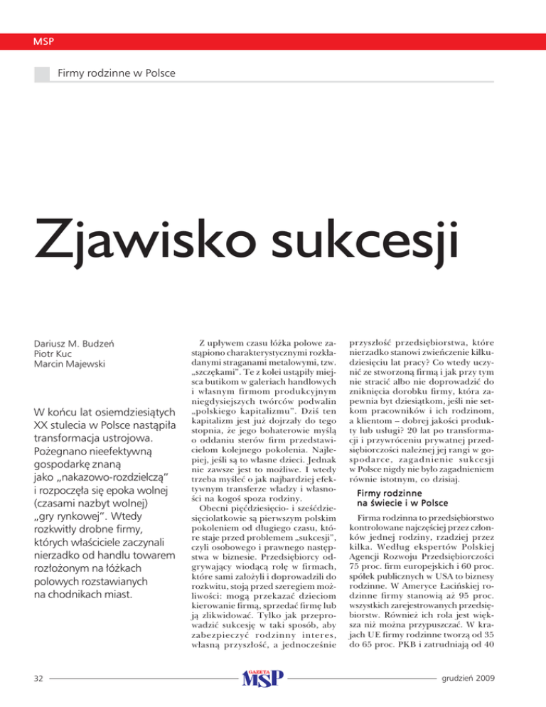 MSP Firmy rodzinne w Polsce Zjawisko sukcesji Dariusz M. Budzeń Piotr Kuc Marcin Majewski W końcu lat osiemdziesiątych XX stulecia w Polsce nastąpiła transformacja ustrojowa. Pożegnano nieefektywną gospodarkę znaną jako „nakazowo-rozdzielczą” i rozpoczęła się epoka wolnej (czasami nazbyt wolnej) „gry rynkowej”. Wtedy rozkwitły drobne firmy, których właściciele zaczynali nierzadko od handlu towarem rozłożonym na łóżkach polowych rozstawianych na chodnikach miast. 32 Z upływem czasu łóżka polowe zastąpiono charakterystycznymi rozkładanymi straganami metalowymi, tzw. „szczękami”. Te z kolei ustąpiły miejsca butikom w galeriach handlowych i własnym firmom produkcyjnym niegdysiejszych twórców podwalin „polskiego kapitalizmu”. Dziś ten kapitalizm jest już dojrzały do tego stopnia, że jego bohaterowie myślą o oddaniu sterów firm przedstawicielom kolejnego pokolenia. Najlepiej, jeśli są to własne dzieci. Jednak nie zawsze jest to możliwe. I wtedy trzeba myśleć o jak najbardziej efektywnym transferze władzy i własności na kogoś spoza rodziny. Obecni pięćdziesięcio- i sześćdziesięciolatkowie są pierwszym polskim pokoleniem od długiego czasu, które staje przed problemem „sukcesji”, czyli osobowego i prawnego następstwa w biznesie. Przedsiębiorcy odgrywający wiodącą rolę w firmach, które sami założyli i doprowadzili do rozkwitu, stoją przed szeregiem możliwości: mogą przekazać dzieciom kierowanie firmą, sprzedać firmę lub ją zlikwidować. Tylko jak przeprowadzić sukcesję w taki sposób, aby zabezpieczyć rodzinny interes, własną przyszłość, a jednocześnie przyszłość przedsiębiorstwa, które nierzadko stanowi zwieńczenie kilkudziesięciu lat pracy? Co wtedy uczynić ze stworzoną firmą i jak przy tym nie stracić albo nie doprowadzić do zniknięcia dorobku firmy, która zapewnia byt dziesiątkom, jeśli nie setkom pracowników i ich rodzinom, a klientom – dobrej jakości produkty lub usługi? 20 lat po transformacji i przywróceniu prywatnej przedsiębiorczości należnej jej rangi w gospodarce, zagadnienie sukcesji w Polsce nigdy nie było zagadnieniem równie istotnym, co dzisiaj. Firmy rodzinne na świecie i w Polsce Firma rodzinna to przedsiębiorstwo kontrolowane najczęściej przez członków jednej rodziny, rzadziej przez kilka. Według ekspertów Polskiej Agencji Rozwoju Przedsiębiorczości 75 proc. firm europejskich i 60 proc. spółek publicznych w USA to biznesy rodzinne. W Ameryce Łacińskiej rodzinne firmy stanowią aż 95 proc. wszystkich zarejestrowanych przedsiębiorstw. Również ich rola jest większa niż można przypuszczać. W krajach UE firmy rodzinne tworzą od 35 do 65 proc. PKB i zatrudniają od 40 grudzień 2009 MSP do 50 proc. pracowników. Do największych firm rodzinnych na świecie należy m.in. Ikea, BMW, Carrefour czy Michelin (Szaleniec M., Firmy rodzinne – czy mają przyszłość?, www.nbportal.pl, 05.10.2009). W Polsce istnieje wielka różnorodność form i wielkości rodzinnych biznesów. Zdecydowana większość działa wprawdzie w sektorze MSP, ale zdarzają się wielkie koncerny zarządzane przez członków jednej rodziny. Szczególnie znane przykłady to cukiernie Andrzeja Bliklego, producenci lodów „Grycan” i „Koral”, producent okien dachowych „Fakro” czy producent mebli „Black Red White”. Szacuje się, że ok. 80 proc. z 1,8 mln działających w Polsce małych i średnich firm to przedsięwzięcia rodzinne. Wraz z 700 tys. gospodarstw rolnych (prawie w 100 proc. prywatnymi), sektor MSP wytwarza ponad 50 proc. PKB i tworzy ponad 60 proc. miejsc pracy w Polsce (Jabłoński I., Znaczenie i rola przedsiębiorstw rodzinnych, Centrum im. Adama Smitha, 2009). W krajach o długich tradycjach gospodarki rynkowej firmy rodzinne mają często kilkudziesięcio- lub nawet kilkusetletnią historię, a zarządzanie nimi jest przekazywane kolejnym pokoleniom. Szczególnie widoczne jest to we Włoszech i w Niemczech. W byłych krajach socjalistycznych sytuacja jest zupełnie odmienna. W komunizmie jedną z głównych idei było zniesienie wszelkiej własności prywatnej, dlatego w Polsce, podobnie jak w innych krajach Europy Wschodniej, niewiele rodzinnych przedsiębiorstw może pochwalić się historią dłuższą niż 20 lat. Polski „cud gospodarczy” z pierwszych lat po transformacji jest właśnie zasługą tych przedsiębiorczych Polaków, którzy – często nie posiadając ani profesjonalnej wiedzy, ani niezbędnego doświadczenia, ani odpowiedniej technologii, ani niezbędnego kapitału – zdecydowali się na grudzień 2009 utworzenie i prowadzenie własnych firm. Co więcej, robili to w otoczeniu ekonomicznym, w którym nie było banków, telefonów, infrastruktury, nie wspominając o rządowych lub unijnych programach wspierających rozwój przedsiębiorczości. Tylko dzięki swojej determinacji, pracowitości, talentom i gotowości do podjęcia ryzyka, zbudowali najprężniejszy sektor polskiej gospodarki – sektor MSP. Problem sukcesji Przyjrzyjmy się bliżej poniższemu obrazkowi. Biznesmen, człowiek sukcesu, pokazuje stojącemu obok synowi krajobraz przemysłowy i mówi: Synu, to wszystko będzie kiedyś Twoje. Jednak taka sytuacja ma miejsce coraz rzadziej. Co zrobić, kiedy nie ma spadkobierców albo następne pokolenie niechętnie myśli o przejmowaniu sterów firmy rodzinnej. W końcu prowadzenie własnego biznesu nie jest łatwym kawałkiem chleba. To cała masa wy- rzeczeń, pracy na granicy wytrzymałości, podejmowania trudnych decyzji – nie tylko o własnym losie, ale też o losach współpracowników. Dodatkowo, warto zaznaczyć, że w ciągu ostatnich 20 lat zmieniły się warunki prowadzenia biznesu, zapał i intuicja ciągle są ważne, ale coraz istotniejsze staje się odpowiednie formalne przygotowanie do kierowania firmą, w rodzaju studiów akademickich w dziedzinie zarządzania lub podyplomowych progr