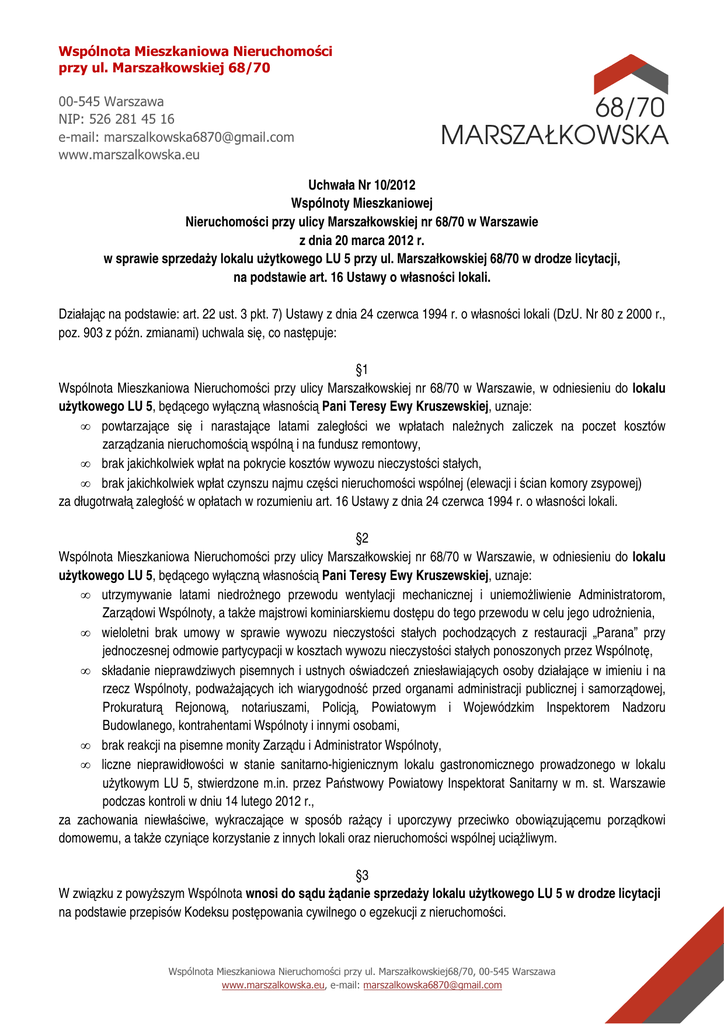 Wspólnota Mieszkaniowa Nieruchomości przy ul. Marszałkowskiej 68/70 00-545 Warszawa NIP: 526 281 45 16 e-mail: [email protected] www.marszalkowska.eu 68/70 MARSZAŁKOWSKA Uchwała Nr 10/2012 Wspólnoty Mieszkaniowej Nieruchomości przy ulicy Marszałkowskiej nr 68/70 w Warszawie z dnia 20 marca 2012 r. w sprawie sprzedaży lokalu użytkowego LU 5 przy ul. Marszałkowskiej 68/70 w drodze licytacji, na podstawie art. 16 Ustawy o własności lokali. Działając na podstawie: art. 22 ust. 3 pkt. 7) Ustawy z dnia 24 czerwca 1994 r. o własności lokali (DzU. Nr 80 z 2000 r., poz. 903 z późn. zmianami) uchwala się, co następuje: §1 Wspólnota Mieszkaniowa Nieruchomości przy ulicy Marszałkowskiej nr 68/70 w Warszawie, w odniesieniu do lokalu użytkowego LU 5, będącego wyłączną własnością Pani Teresy Ewy Kruszewskiej, uznaje: • powtarzające się i narastające latami zaległości we wpłatach należnych zaliczek na poczet kosztów zarządzania nieruchomością wspólną i na fundusz remontowy, • brak jakichkolwiek wpłat na pokrycie kosztów wywozu nieczystości stałych, • brak jakichkolwiek wpłat czynszu najmu części nieruchomości wspólnej (elewacji i ścian komory zsypowej) za długotrwałą zaległość w opłatach w rozumieniu art. 16 Ustawy z dnia 24 czerwca 1994 r. o własności lokali. §2 Wspólnota Mieszkaniowa Nieruchomości przy ulicy Marszałkowskiej nr 68/70 w Warszawie, w odniesieniu do lokalu użytkowego LU 5, będącego wyłączną własnością Pani Teresy Ewy Kruszewskiej, uznaje: • utrzymywanie latami niedrożnego przewodu wentylacji mechanicznej i uniemożliwienie Administratorom, Zarządowi Wspólnoty, a także majstrowi kominiarskiemu dostępu do tego przewodu w celu jego udrożnienia, • wieloletni brak umowy w sprawie wywozu nieczystości stałych pochodzących z restauracji „Parana” przy jednoczesnej odmowie partycypacji w kosztach wywozu nieczystości stałych ponoszonych przez Wspólnotę, • składanie nieprawdziwych pisemnych i ustnych oświadczeń zniesławiających osoby działające w imieniu i na rzecz Wspólnoty, podważających ich wiarygodność przed organami administracji publicznej i samorządowej, Prokuraturą Rejonową, notariuszami, Policją, Powiatowym i Wojewódzkim Inspektorem Nadzoru Budowlanego, kontrahentami Wspólnoty i innymi osobami, • brak reakcji na pisemne monity Zarządu i Administrator Wspólnoty, • liczne nieprawidłowości w stanie sanitarno-higienicznym lokalu gastronomicznego prowadzonego w lokalu użytkowym LU 5, stwierdzone m.in. przez Państwowy Powiatowy Inspektorat Sanitarny w m. st. Warszawie podczas kontroli w dniu 14 lutego 2012 r., za zachowania niewłaściwe, wykraczające w sposób rażący i uporczywy przeciwko obowiązującemu porządkowi domowemu, a także czyniące korzystanie z innych lokali oraz nieruchomości wspólnej uciążliwym. §3 W związku z powyższym Wspólnota wnosi do sądu żądanie sprzedaży lokalu użytkowego LU 5 w drodze licytacji na podstawie przepisów Kodeksu postępowania cywilnego o egzekucji z nieruchomości. Wspólnota Mieszkaniowa Nieruchomości przy ul. Marszałkowskiej68/70, 00-545 Warszawa www.marszalkowska.eu, e-mail: [email protected] Strona 2 z 2 68/70 MARSZAŁKOWSKA §4 Wykonanie uchwały powierza się Zarządowi Wspólnoty, któremu niniejszym udziela się pełnomocnictwa do działania w przedmiotowej sprawie, z prawem udzielenia pełnomocnictwa procesowego wybranemu przez Zarząd Wspólnoty radcy prawnemu lub adwokatowi. §5 Uchwała wchodzi w życie z dniem podjęcia. Uchwałę podjęto / nie podjęto następującą ilością udziałów: za uchwałą przeciw uchwale wstrzymało się głosowało ……… udziałów, głosowało ……… udziałów, głosowało ……… udziałów. Załącznikiem do niniejszej uchwały jest lista do głosowania. Zarząd Wspólnoty Przewodniczący zebrania Wspólnota Mieszkaniowa Nieruchomości przy ul. Marszałkowskiej68/70, 00-545 Warszawa www.marszalkowska.eu, e-mail: [email protected]