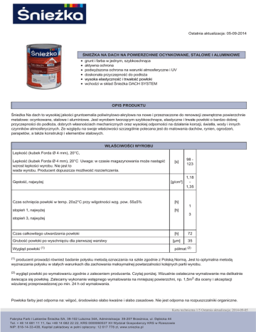 Ostatnia aktualizacja: 05-09-2014 ŚNIEŻKA NA DACH NA POWIERZCHNIE OCYNKOWANE, STALOWE I ALUMINIOWE ŚNIEŻKA_NA_DACH grunt i farba w jednym, szybkoschnąca aktywna ochrona podwyższona ochrona na warunki atmosferyczne i UV doskonała przyczepność do podłoża wysoka elastyczność i trwałość powłoki wchodzi w skład Śnieżka DACH SYSTEM OPIS PRODUKTU Śnieżka Na dach to wysokiej jakości gruntoemalia poliwinylowoakrylowa na nowe i przeznaczone do renowacji zewnętrzne powierzchnie metalowe: ocynkowane, stalowe i aluminiowe. Jest wyrobem tworzącym szybkoschnące, elastyczne i trwałe powłoki o bardzo dobrej przyczepności do podłoża, dobrych własnościach mechanicznych oraz wysokiej odporności na działanie korozji, światła, wody i innych czynników atmosferycznych. Ze względu na swoje właściwości szczególnie polecana jest do malowania dachów, rynien, ogrodzeń, parapetów, a także konstrukcji i elementów stalowych. WŁAŚCIWOŚCI WYROBU Lepkość (kubek Forda Ø 4 mm), 20°C, Lepkość (kubek Forda Ø 4 mm), 20°C Uwaga: w czasie magazynowania może nastąpić wzrost lepkości wyrobu. Nie jest to wada wyrobu. Producent dopuszcza możliwość rozcieńczenia. Gęstość, najwyżej [s] 98 123 [g/cm³] 1,18 1,35 Czas schnięcia powłoki w temp. 20±2°C przy wilgotności wzg. pow. 55±5% [h] stopień 1, najwyżej [h] 1 3 stopień 3, najwyżej Czas całkowitego utwardzenia powłoki Grubość powłoki po wyschnięciu dla pierwszej warstwy Wygląd powłoki (1) [h] 72 [µm] 35 półmat (2) (1) producent prowadzi również badanie połysku metodą oznaczania na szkle zgodnie z Polską Normą. Jest to optymalna metodą wyznaczania połysku w stałych warunkach dla zachowania maksymalnej powtarzalności kolejnych partii wyrobu. (2) wygląd powłoki po wymalowaniu zgodnie z zaleceniem producenta. Czytaj poniżej. Wizualnie ostateczne wymalowanie ma delikatnie świecąca się powłokę. Zalecamy wykonanie wstępnego wymalowania na mniejszej powierzchni, np. 1,5m2 dla oceny i akceptacji wizulanej przeprowadzonej po min. 24 h od wymalowania. Powłoka farby jest odporna na: wilgoć, środowisko słabo kwaśne i słabo zasadowe. Nie jest odporna na rozpuszczalniki organiczne. Karta techniczna 1/5 Ostatnia aktualizacja: 2014-09-05 Fabryka Farb i Lakierów Śnieżka SA, 39102 Lubzina 34A, Administracja: 39207 Brzeźnica, ul. Dębicka 44 Tel. + 48 14 681 11 11, fax +48 14 682 22 22, KRS 0000060537 XII Wydział Gospodarczy KRS w Rzeszowie NIP: 8181433438, Kapitał zakładowy w pełni opłacony: 12 617 778 zł, www.sniezka.pl Należy unikać stałego kontaktu powłoki z wodą. Powłoki pomalowane nie mogą być zanurzone w wodzie. Należy zapewnić stałe odprowadzanie wody np. podczas deszczu. Powłoka farby jest termoplastyczna należy unikać wysokich temperatur powyżej 80 0C. ŚNIEŻKA_NA_DACH Zawartość LZO, max. 500 g/l. SPOSÓB STOSOWANIA Przygotowanie podłoża Podłoże powinno być suche, bez kurzu, zatłuszczeń i innych zanieczyszczeń, śladów korozji, niemodyfikowane pod względem poprawy wodoodporności nie stosować np. na impregnowane, hydrofobizowane dachówki. Nowe powierzchnie (w tym blacha ocynkowana): Przemyć wodnym roztworem Śnieżka NA DACH Preparat Do Czyszczenia Dachu zgodnie z jego instrukcją stosowania, spłukać wodą i wysuszyć. Powierzchnie ocynkowane pokryte białym nalotem należy umyć wodą stosując myjki ciśnieniowe. Renowacja: Przed malowaniem stare powłoki należy zmatowić papierem ściernym i odpylić. W przypadku aplikacji na nieznane powłoki zaleca się zagruntowanie całej powierzchni Śnieżka NA DACH Farba Gruntująca. Przed malowaniem należy wykonać próbę kompatybilności. Starą powłokę zmatowić papierem ściernym, odpylić i pomalować podkładem niewielką powierzchnię. Po wyschnięciu powłoka podkładu musi być jednorodana, bez zmarszczeń, itp. Zardzewiałe powierzchnie oczyścić z rdzy za pomocą szczotki drucianej lub papieru ściernego i nałożyć jedną warstwę farby Śnieżka NA DACH Farba Gruntująca. W przypadku podłoża wcześniej malowanego sprawdzić przyczepność starej farby do podłoża: należy w kilku miejscach wykonać próbę usunięcia farby drapiąc szpachelką lub naciąć prowłokę ostrym nożem i przykleić taśmę malarską. Jeśli farba odspaja się, odpryskuje, należy oczyścić całą powierzchnię ze starej powłoki malarskiej, a nstępnie umyć powierzchnię Śnieżka NA DACH Preparat Do Czyszczenia Dachu. Wysezonowane podłoża o dużej porowatości (tynk, beton) należy zagruntować rozcieńczoną farbą Śnieżka NA DACH Stosować rozcieńczalnik systemowy Śnieżka NA DACH Rozcieńczalnik. Przygotowanie wyrobu Farbę starannie wymieszać.Podczas prowadznenia prac należy co ok. 1 h kilkakrotnie dodatkowo zamieszać wyrób. W przypadku zakupu dwóch lub więcej opakowań farby tego samego koloru z różnych partii produkcyjnych należy przelać całą farbę do większego pojemnika i wymieszać (pomiędzy partiami produkcyjnymi mogą występować różnice w odcieniu i połysku danego koloru). Wyrób jest gotowy do użycia w postaci handlowej. W związku z możliwością zagęszczania wyrobu w trakcie magazynowania (w wyniku częściowego odparowania rozpuszczalnika), w razie potrzeby dodać maksymalnie 5% rozcieńczalnika Śnieżka NA DACH Rozcieńczalnik. Stosować rozcieńczalnik systemowy Śnieżka NA DACH Rozcieńczalnik, gdyż nieodpowiedni skład zastosowanego (innego) rozcieńczalnika spowoduje wady powłoki zarówno dekoracyjne jak i jej trwałość. Karta techniczna 2/5 Ostatnia aktualizacja: 2014-09-05 Fabryka Farb i Lakierów Śnieżka SA, 39102 Lubzina 34A, Administracja: 39207 Brzeźnica, ul. Dębicka 44 Tel. + 48 14 681 11 11, fax +48 14 682 22 22, KRS 0000060537 XII Wydział Gospodarczy KRS w Rzeszowie NIP: 8181433438, Kapitał zakładowy w pełni opłacony: 12 617 778 zł, www.sniezka.pl Prace malarskie prowadzić w temperaturze otoczenia od +10°C do +25°C,
